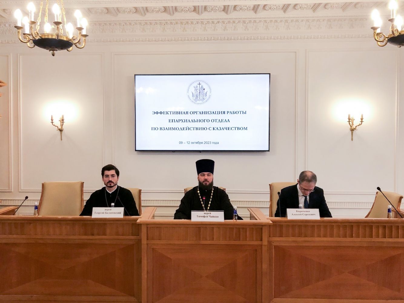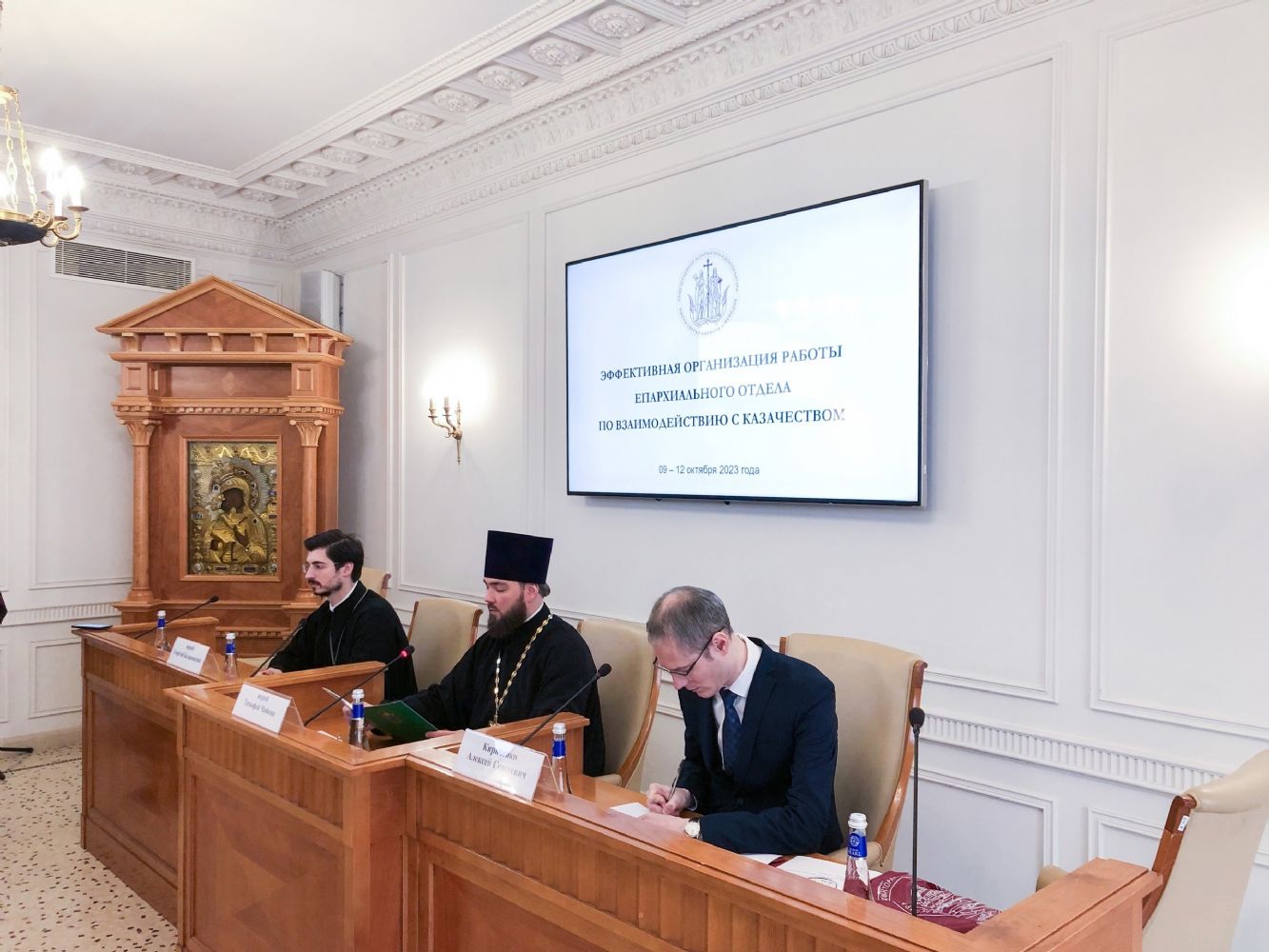 09 октября 2023 года в актовом зале Общецерковной аспирантуры и докторантуры им. святых равноапостольных Кирилла и Мефодия состоялось открытие курсов повышения квалификации духовенства «Эффективная организация работы епархиального отдела по взаимодействию с казачеством», которые были разработаны и подготовлены при содействии Синодального комитета Русской Православной Церкви по взаимодействию с казачеством.