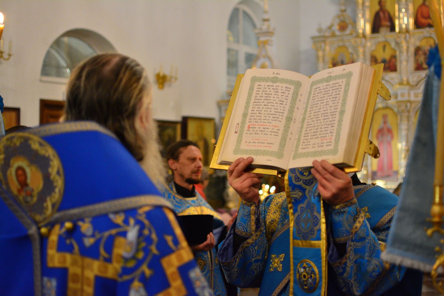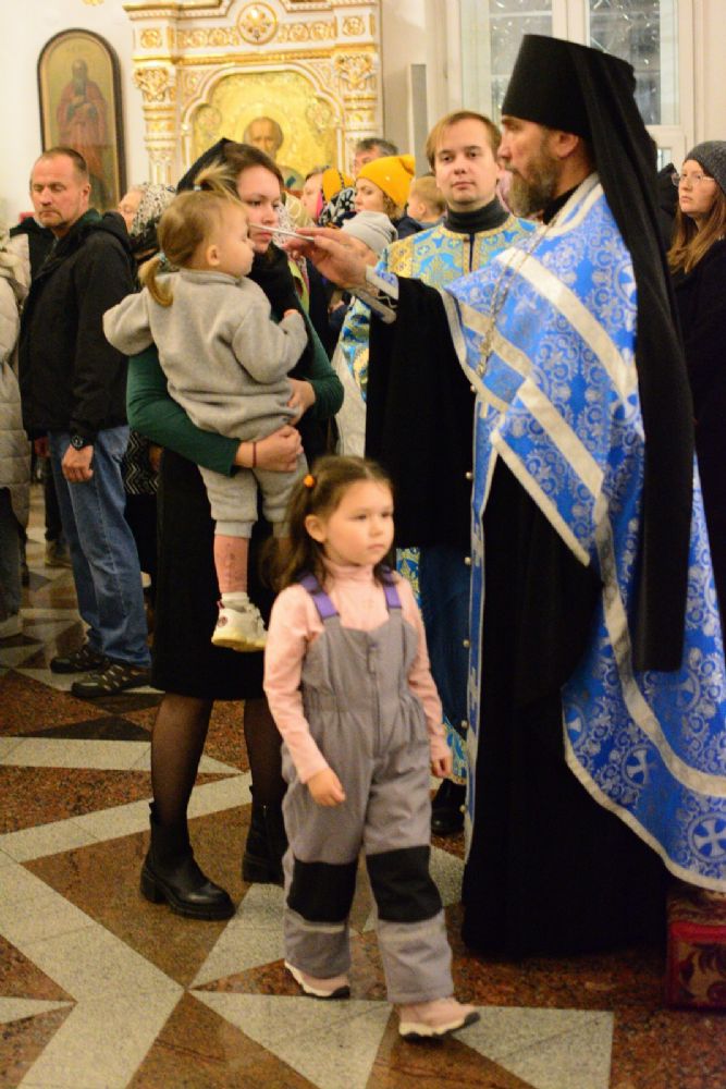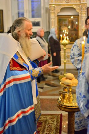 За богослужением читались ветхозаветные паримии из книг Бытия, Пророка Иезекииля и Притчей Соломоновых, прообразующие Пресвятую Богородицу. На литии освящались хлебы, пшеница, вино и елей.
