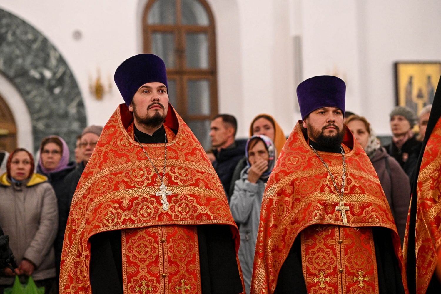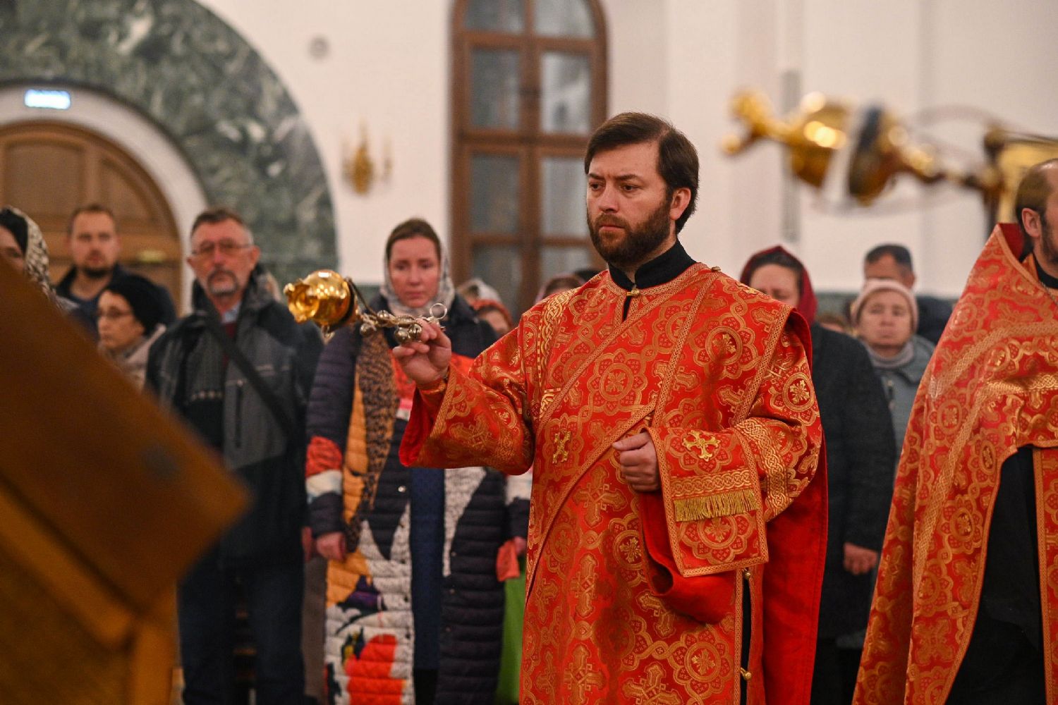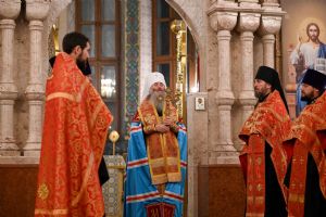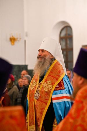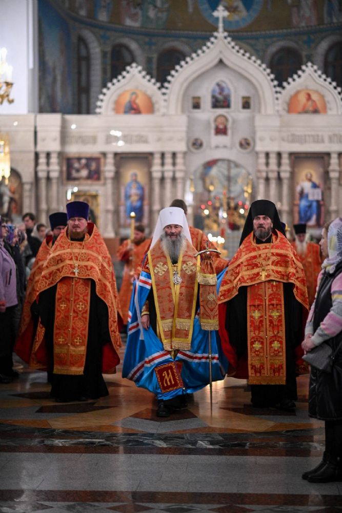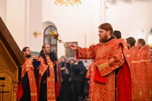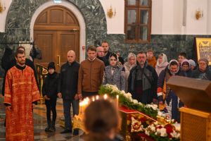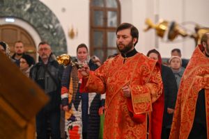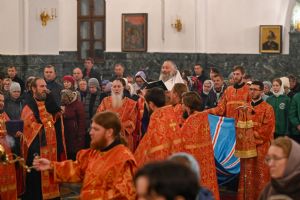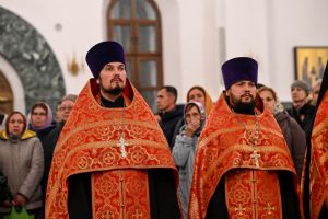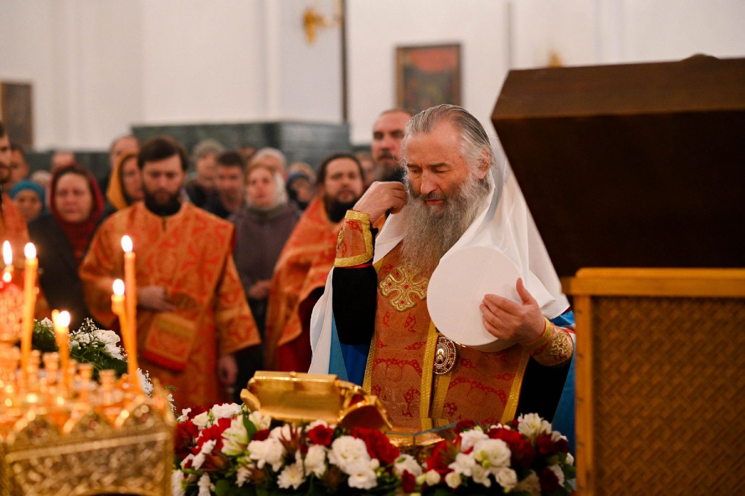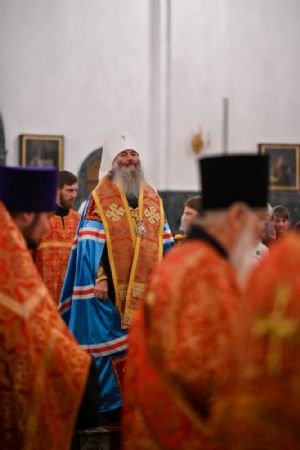 Владыке сослужили секретарь Йошкар-Олинского епархиального управления иеромонах Серафим (Пасанаев), ключарь собора протоиерей Сергий Поглазов, клирики собора и протодиакон Михаил Козловский. Песнопения исполнял хор «Благовест» под управлением Татьяны Черновой.