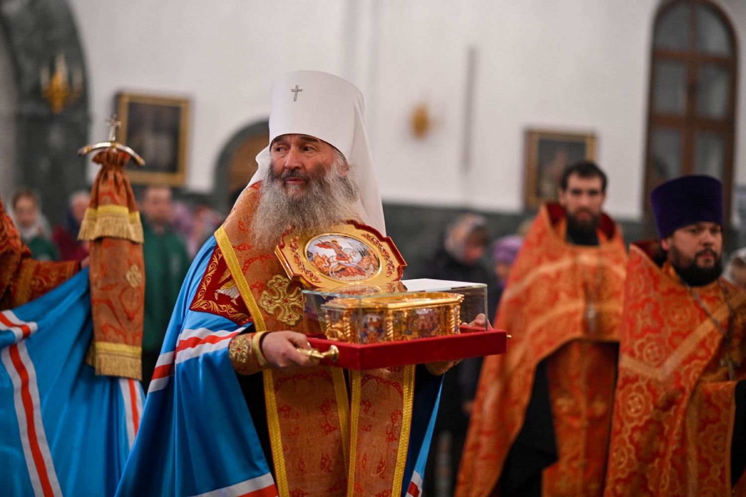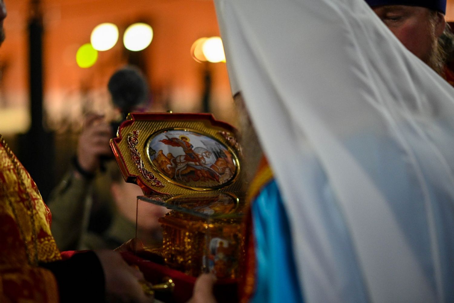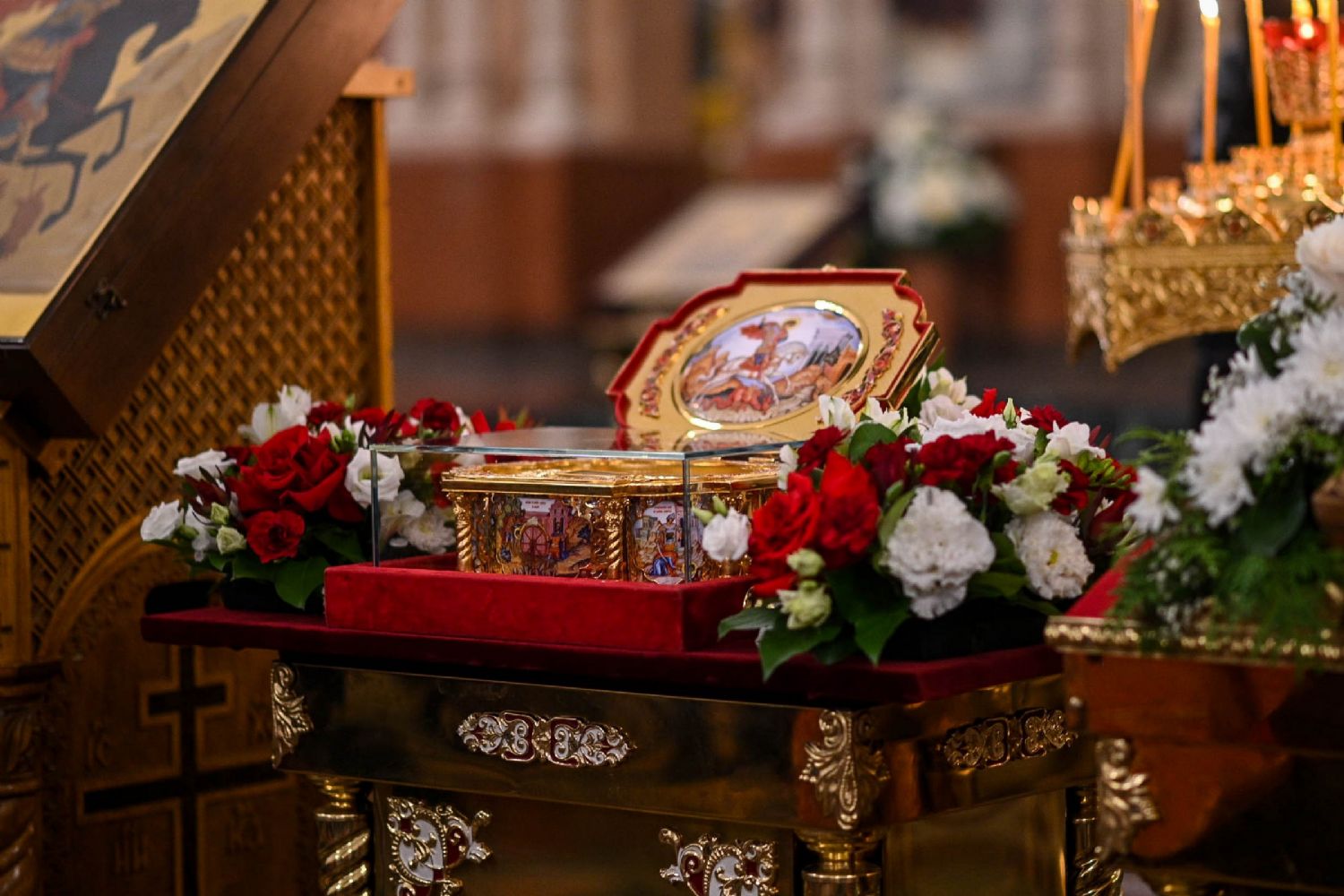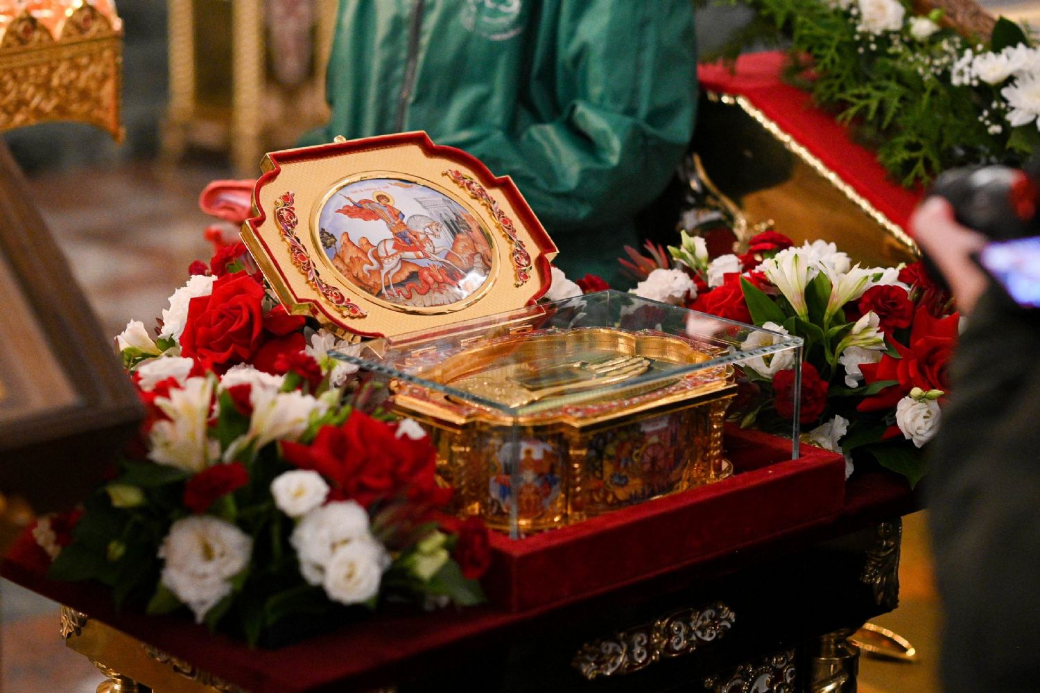 Ковчег с мощами и икона Георгия Победоносца были поставлены в центре кафедрального собора. Митрополит Иоанн возглавил молебен святому великомученику и победоносцу Георгию.