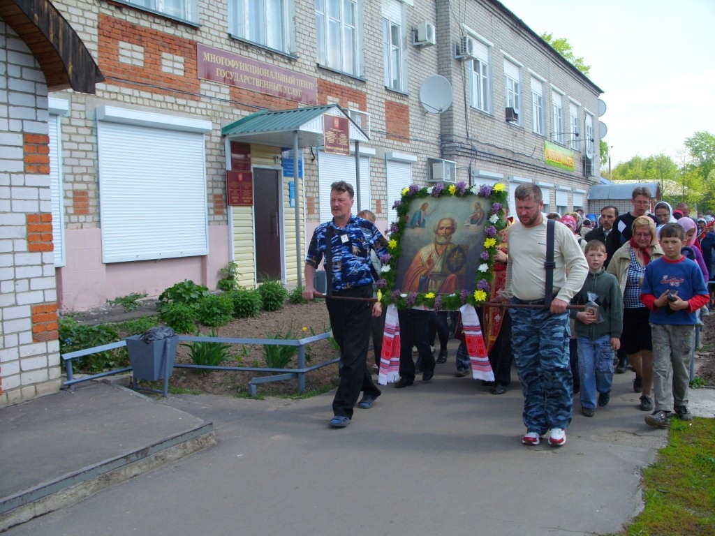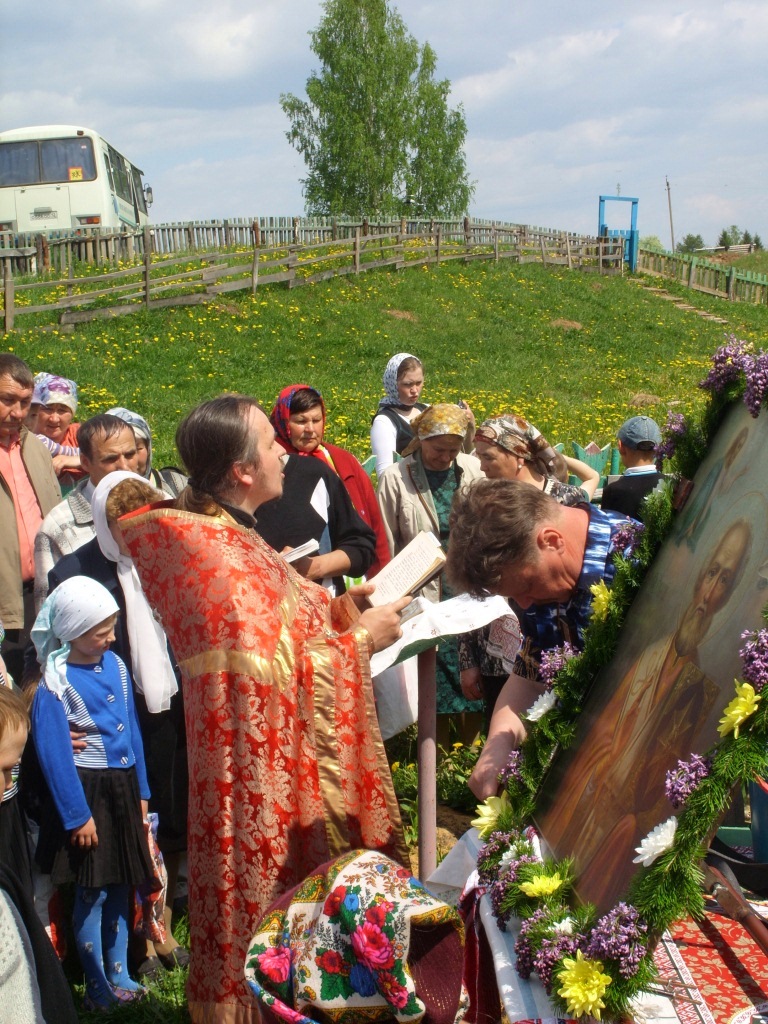 Участники крестного хода шли с большим образом Николая Чудотворца вятского письма XIX века. Это одна из изуродованных в свое время безбожниками икон-мучениц, обнаруженных при ремонте храма в отгороженном закутке между печью и стеной, и отреставрированная на средства прихожан.