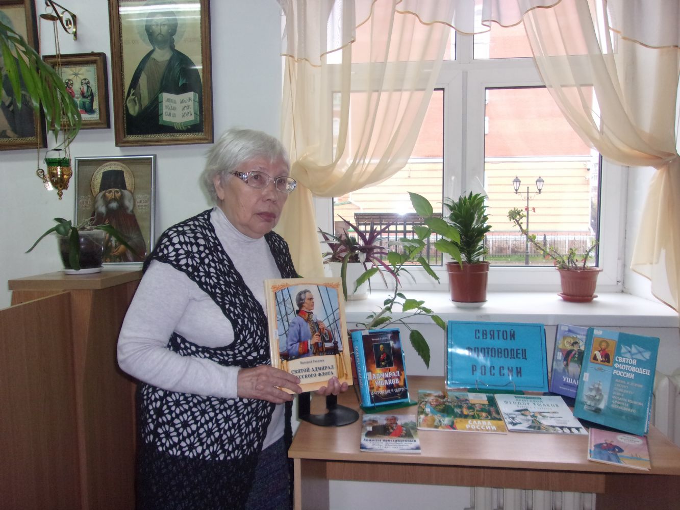 Для проведения урока была оформлена книжная выставка «Святой полководец России». Библиотекарь Татьяна Васильевна Наумова ознакомила ребят с представленной на выставке литературой и вкратце рассказала о жизни и военных подвигах адмирала.