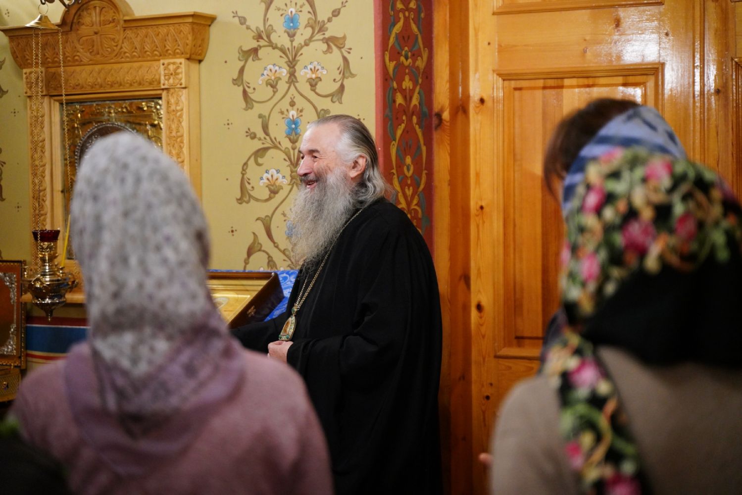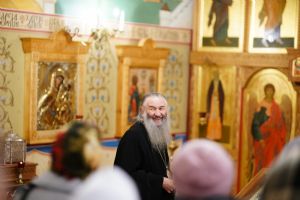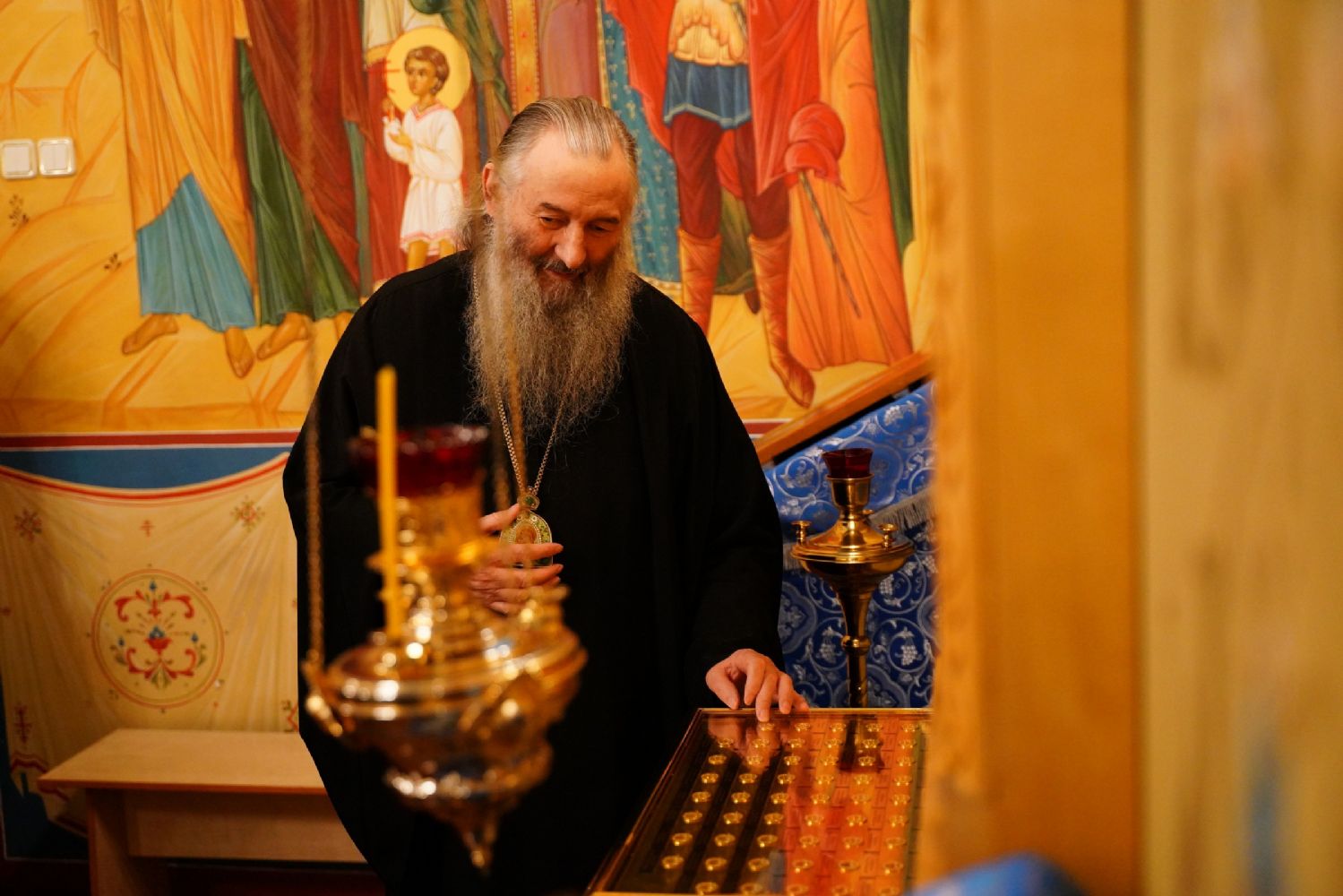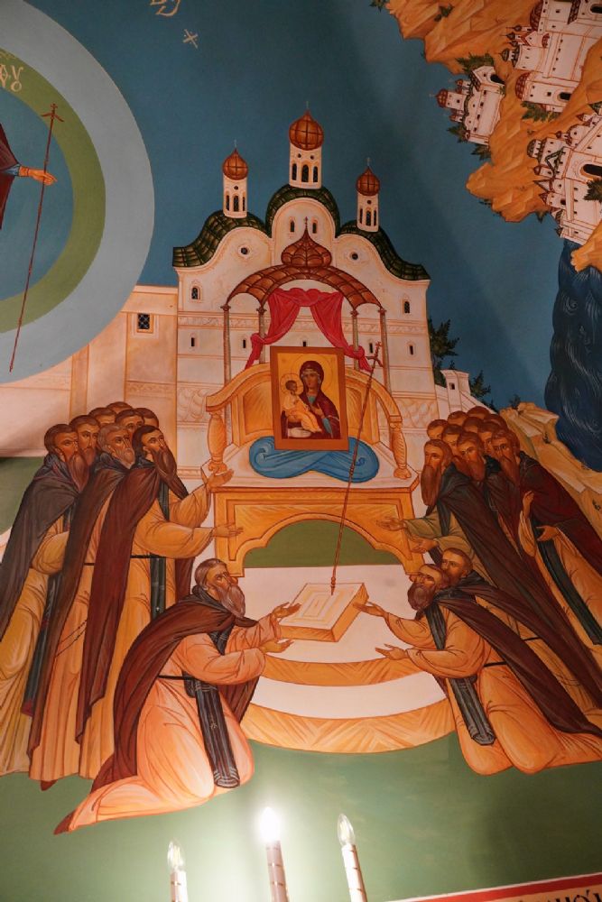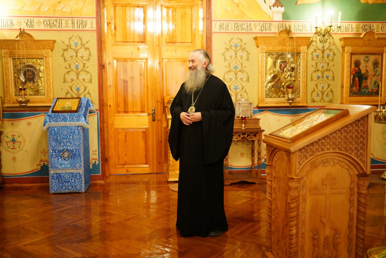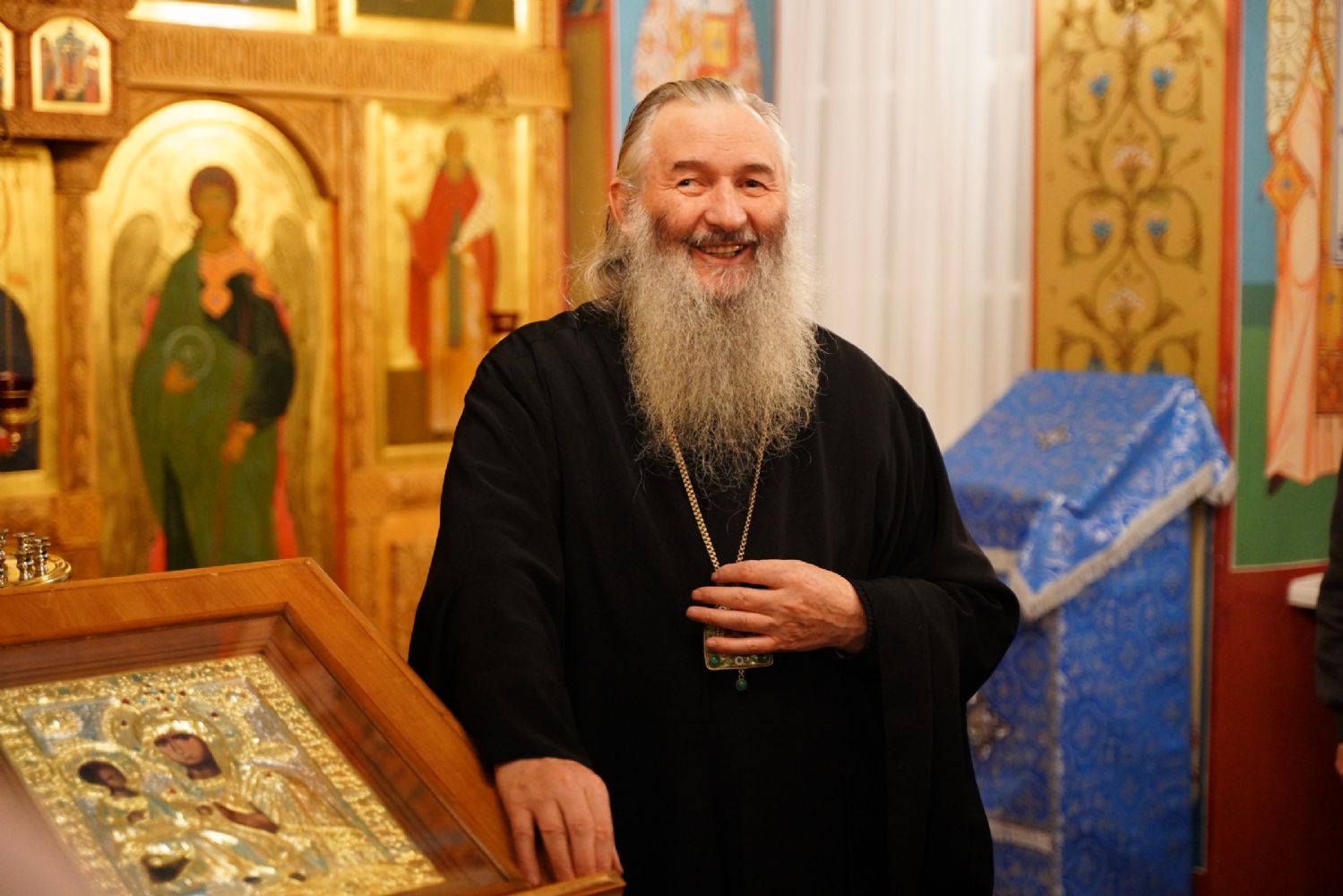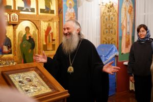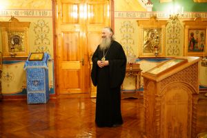 Владыка провел для гостей экскурсию по домовому храму в честь иконы Богородицы «Троеручица» – рассказал об истории храма, о настенных росписях, где в красках изображена история появления чудотворного образа Божией Матери «Троеручица», о чудесном спасении этой иконы от поругания турецкими захватчиками – когда ослик с возложенной на него святыней сам пришел к вратам Хиландарской обители на Афоне. Для нашей епархии афонские монахи изготовили в дар список иконы «Троеручица», который хранится ныне в домовом храме.