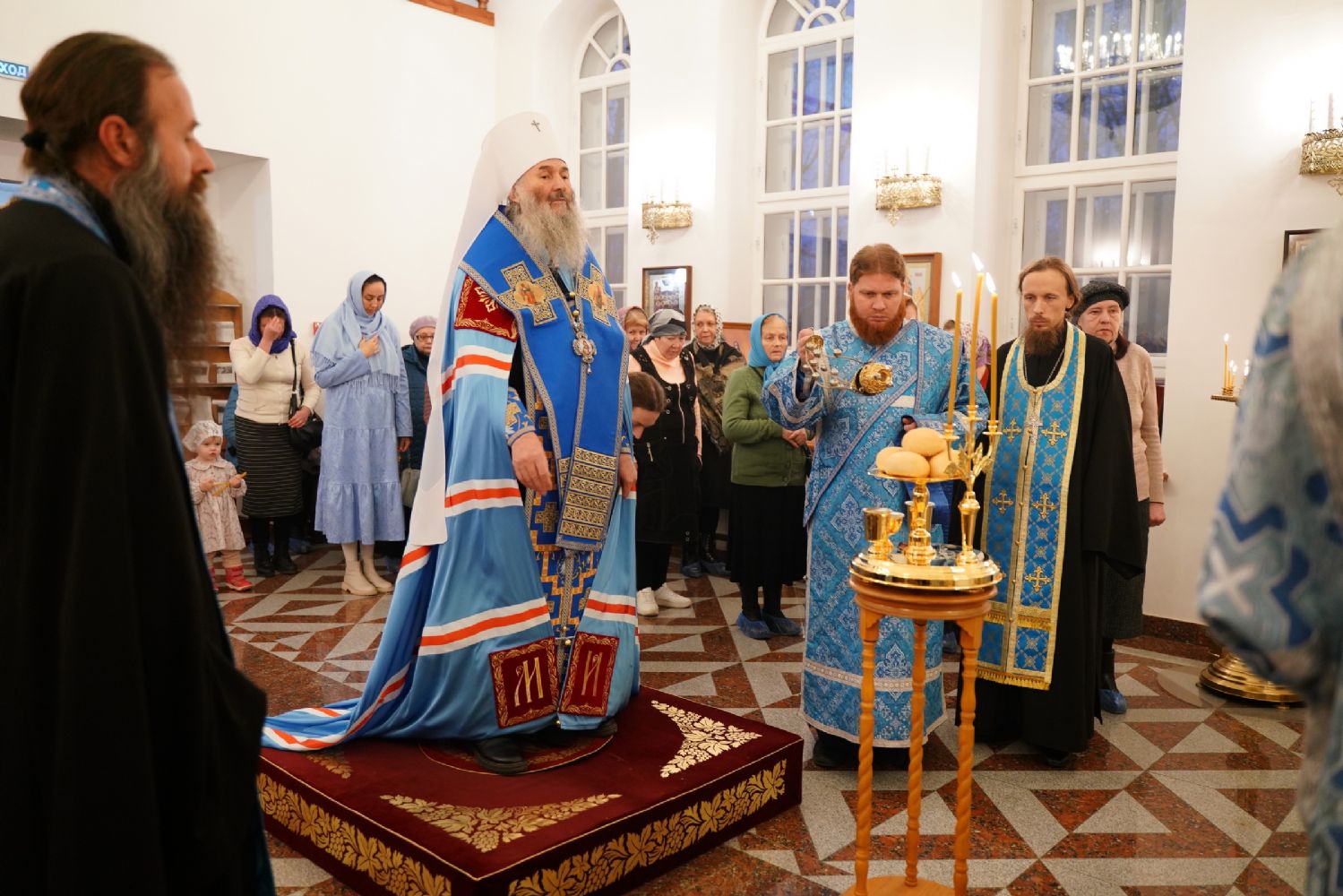 По случаю праздника за богослужением читались ветхозаветные паримии из книг Бытия и Исхода, прообразующие Пресвятую Богородицу. На литии освящались хлебы, пшеница, вино и елей. После чтения Евангелия верующие помазывались освященным елеем и вкушали литийный хлеб.