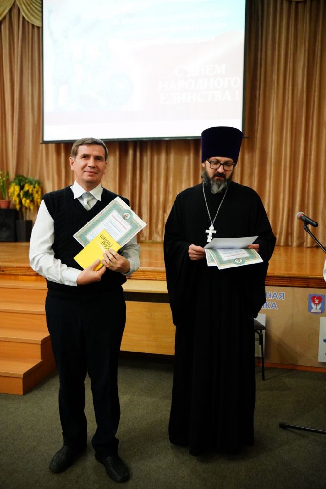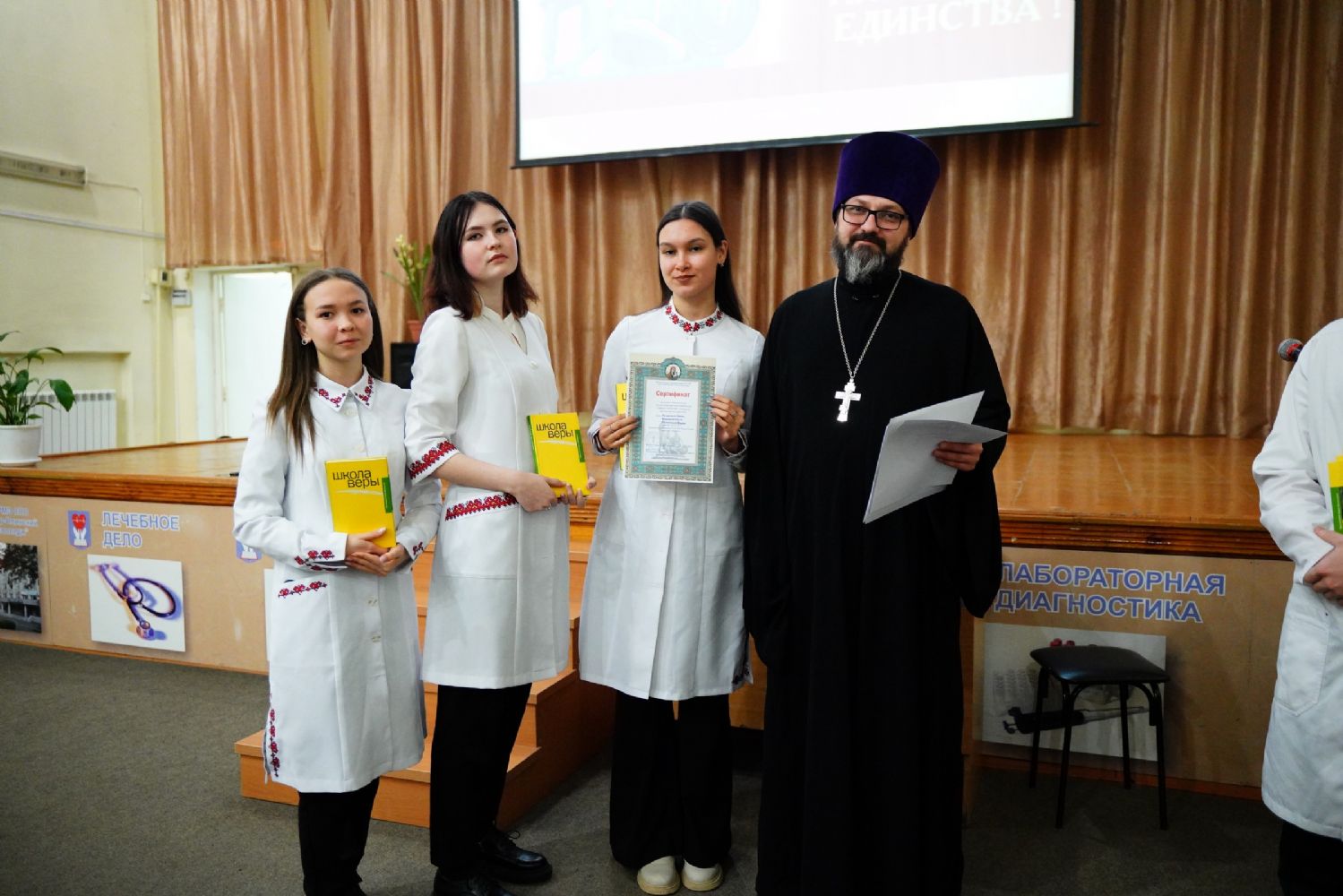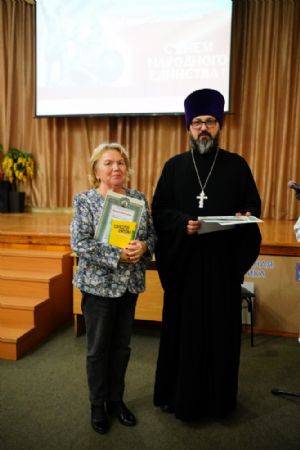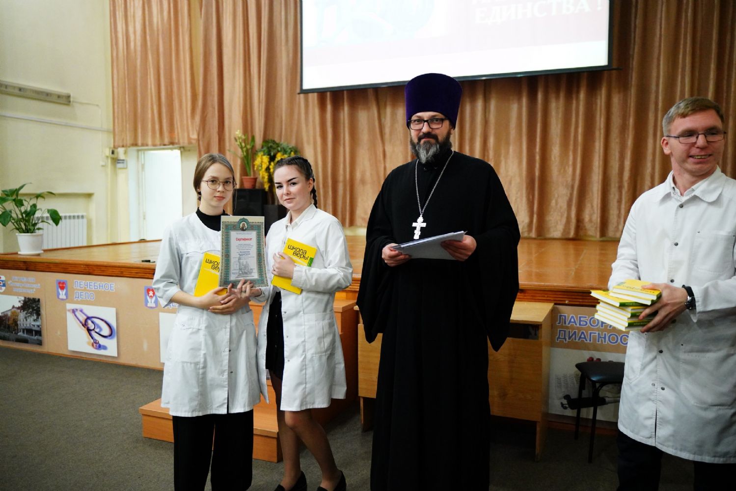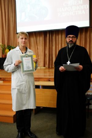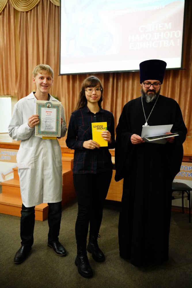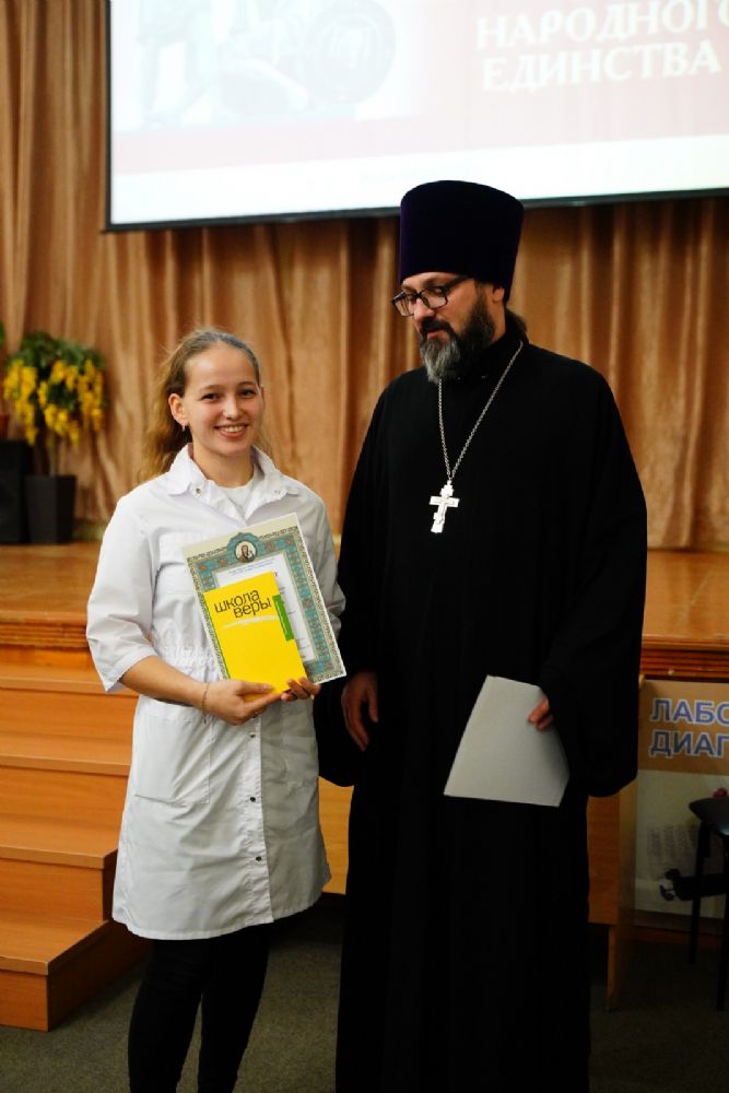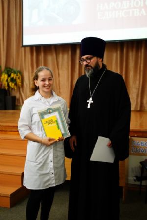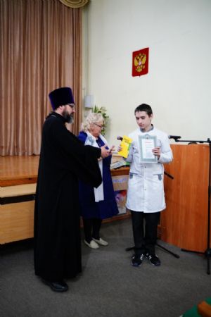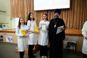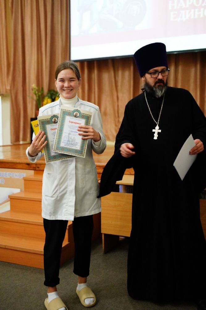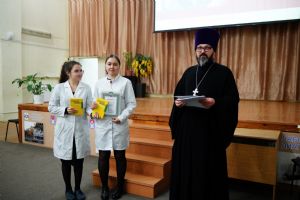 Иерей Димитрий Дьяков, окормляющий учебное заведение, вручил всем участникам конференции сертификаты и книги в подарок, а педагогам – благодарственные письма за подписью митрополита Иоанна и директора медучилища Л.В. Рыжкова.