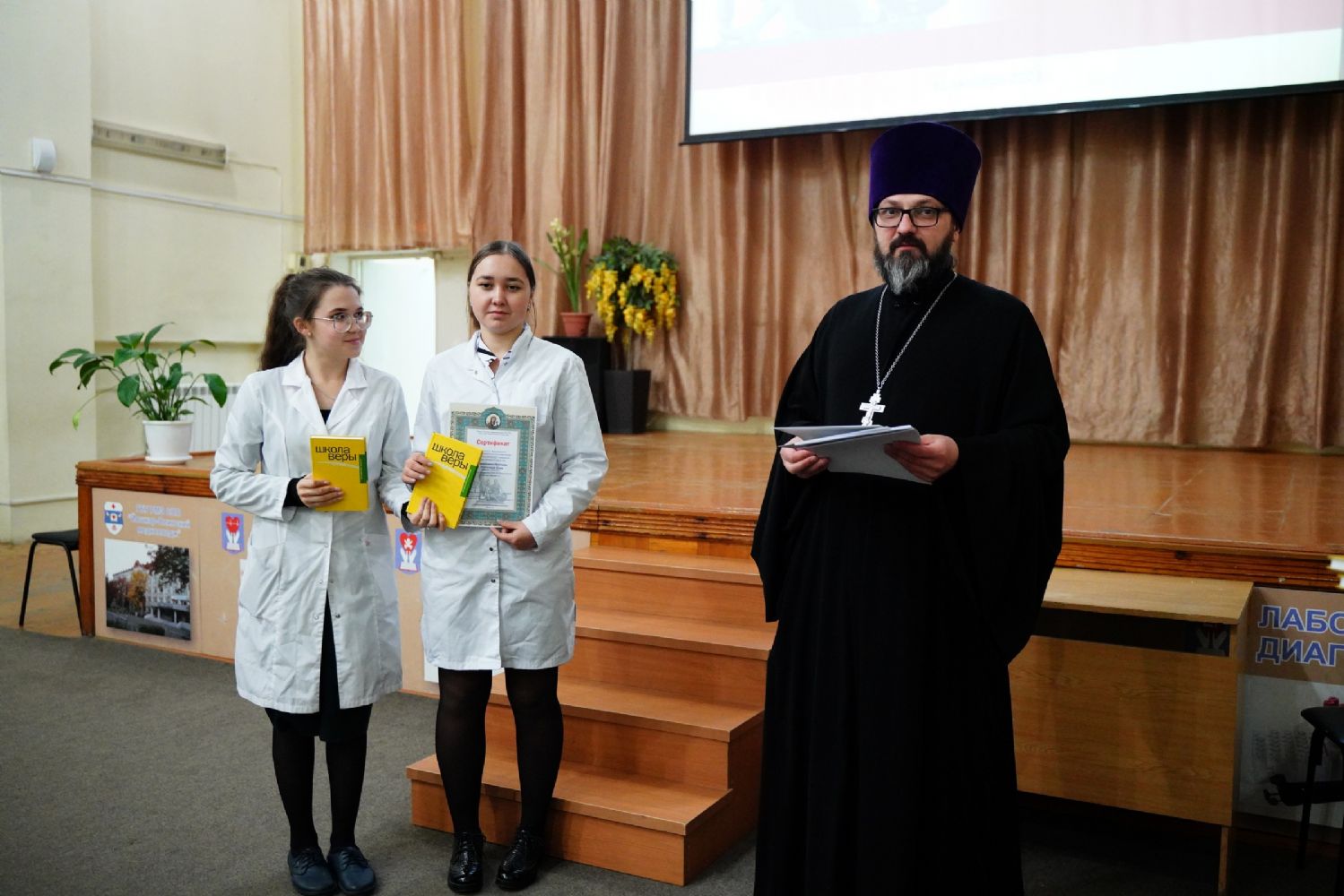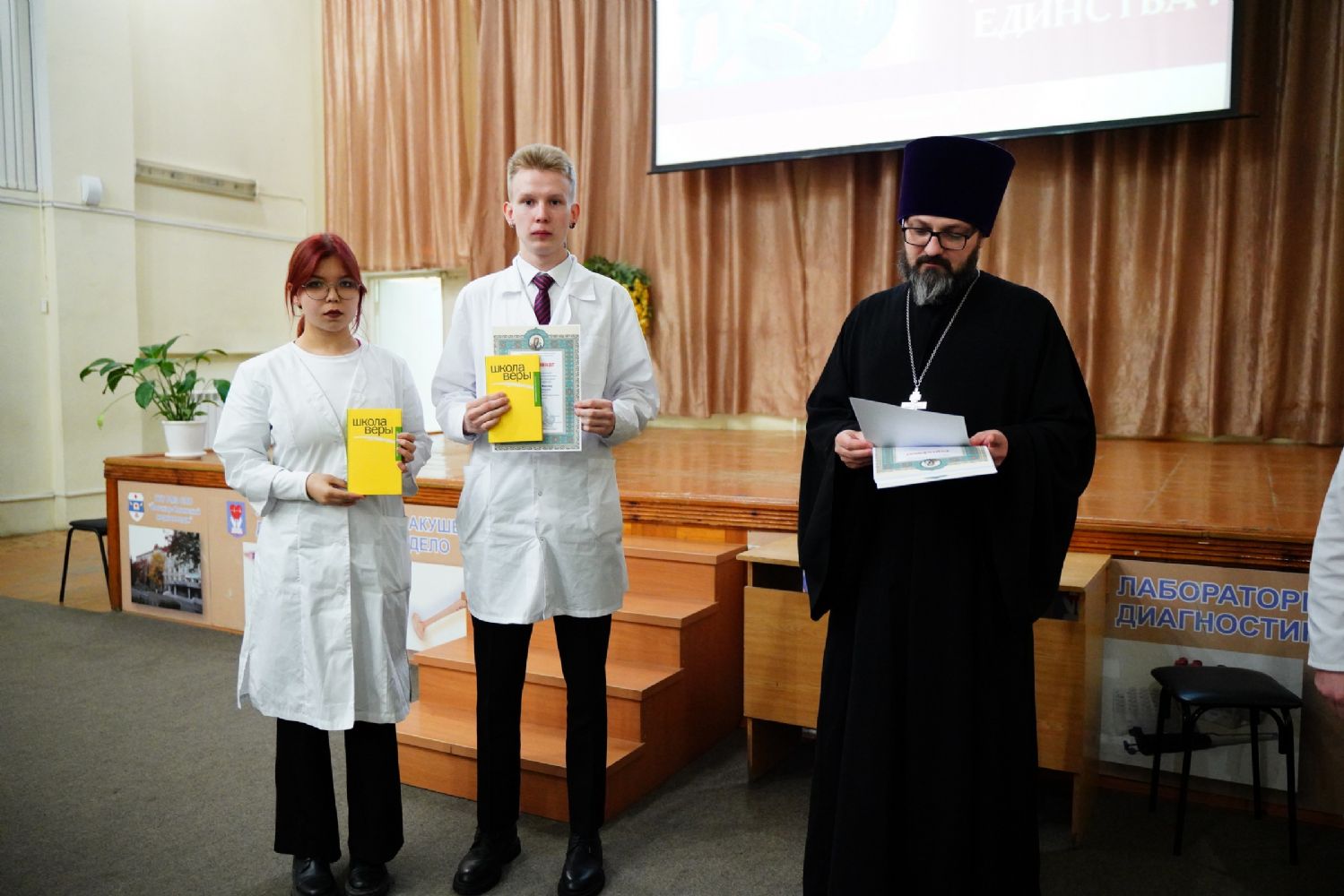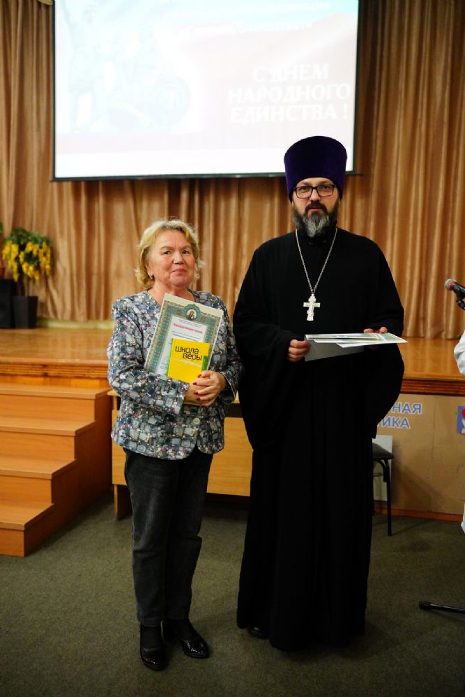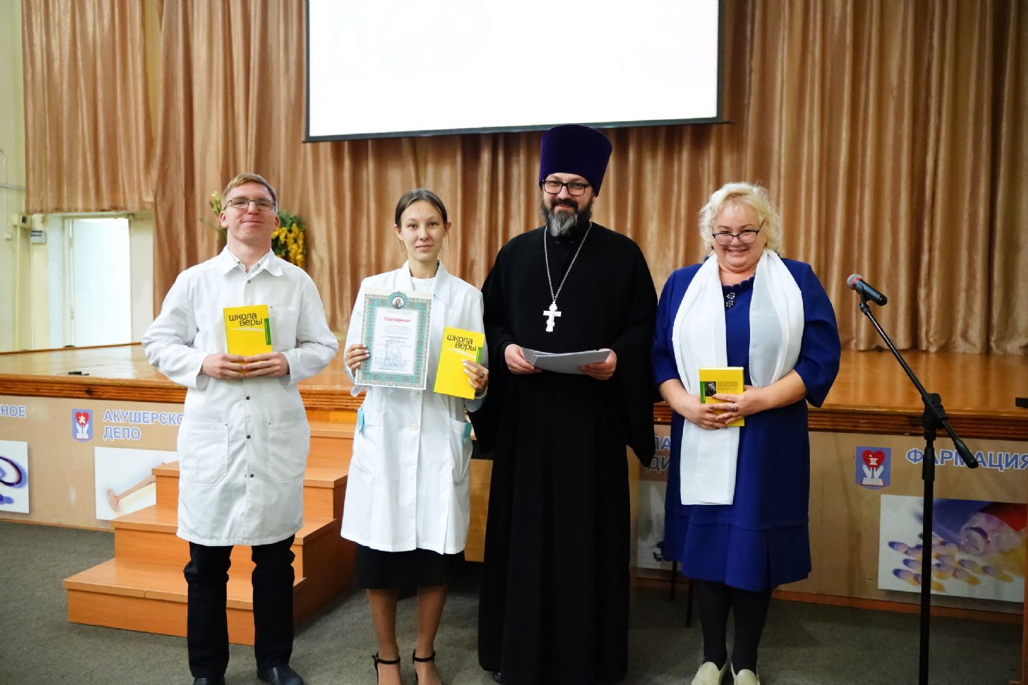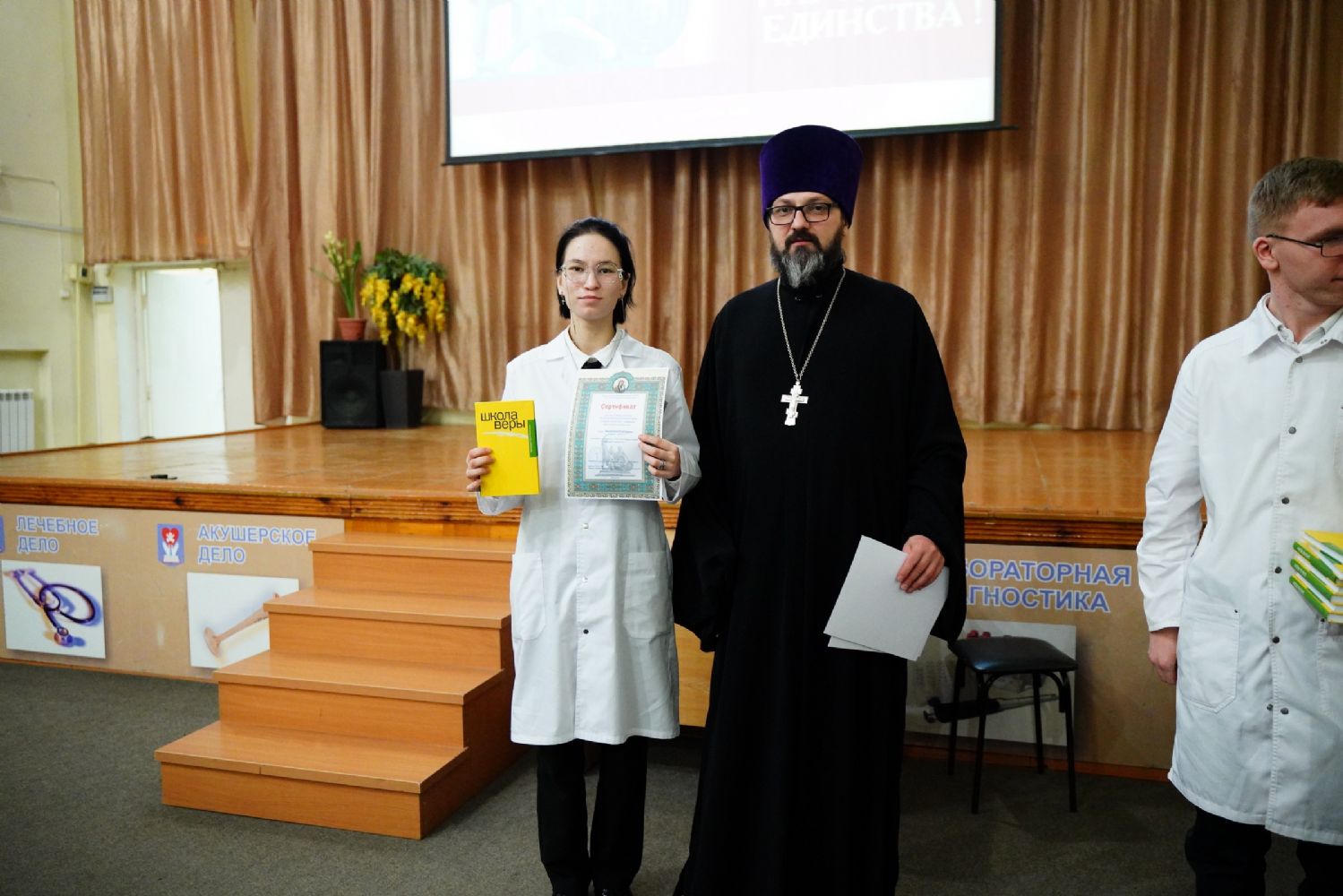 Иерей Димитрий Дьяков, окормляющий учебное заведение, вручил всем участникам конференции сертификаты и книги в подарок, а педагогам – благодарственные письма за подписью митрополита Иоанна и директора медучилища Л.В. Рыжкова.