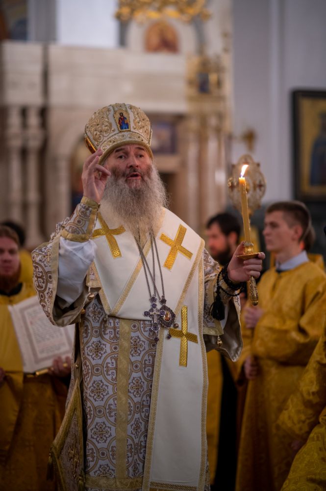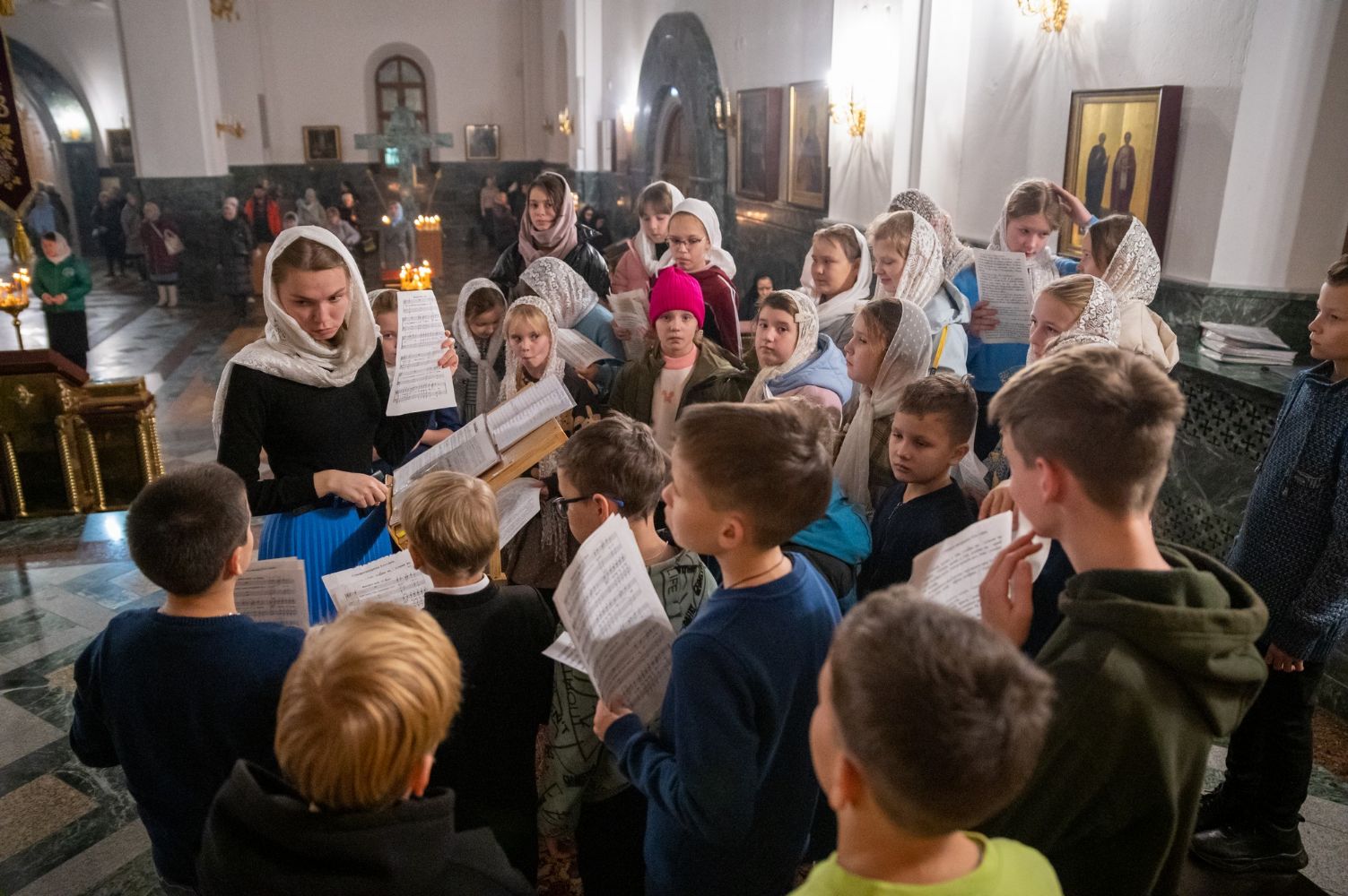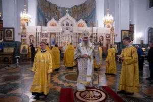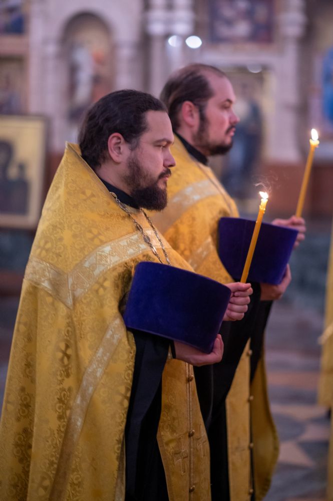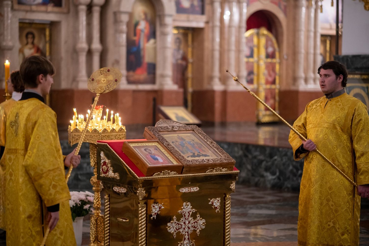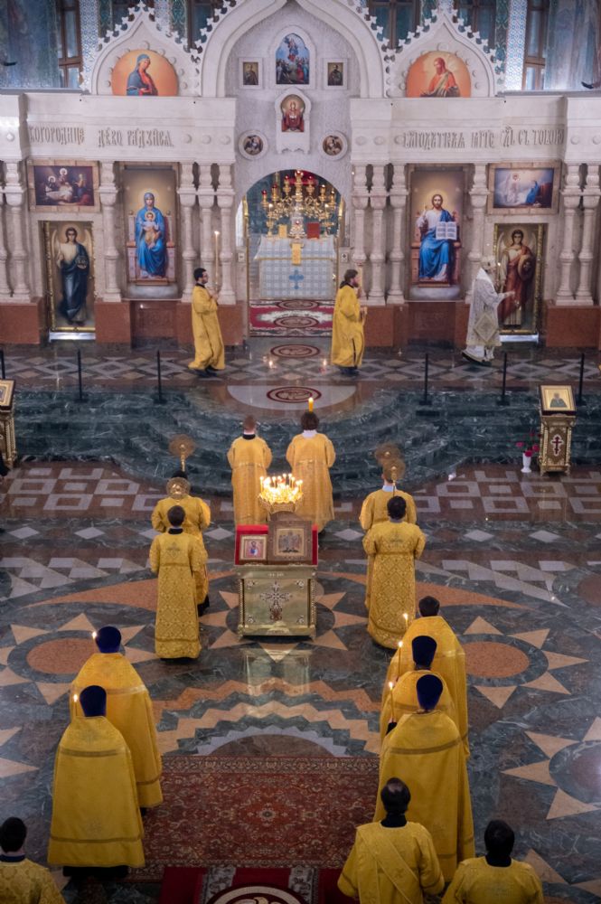 Его Высокопреосвященству сослужили ключарь кафедрального собора протоиерей Сергий Поглазов, клирики собора иереи Никифор Захаров, Евгений Самойлов, Александр Староверов и Иоанн Милютин, диаконы Андрей Дружинин и Артемий Бобоч, а также протодиакон Михаил Козловский. Песнопения антифонно исполняли старший и младший составы детско-юношеского хора «Благовест» под управлением регентов Татьяны Черновой и Софии Андреевой.