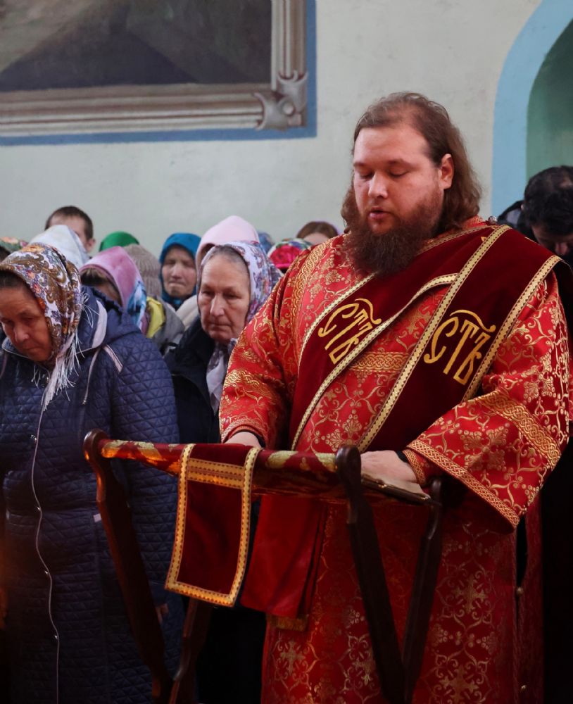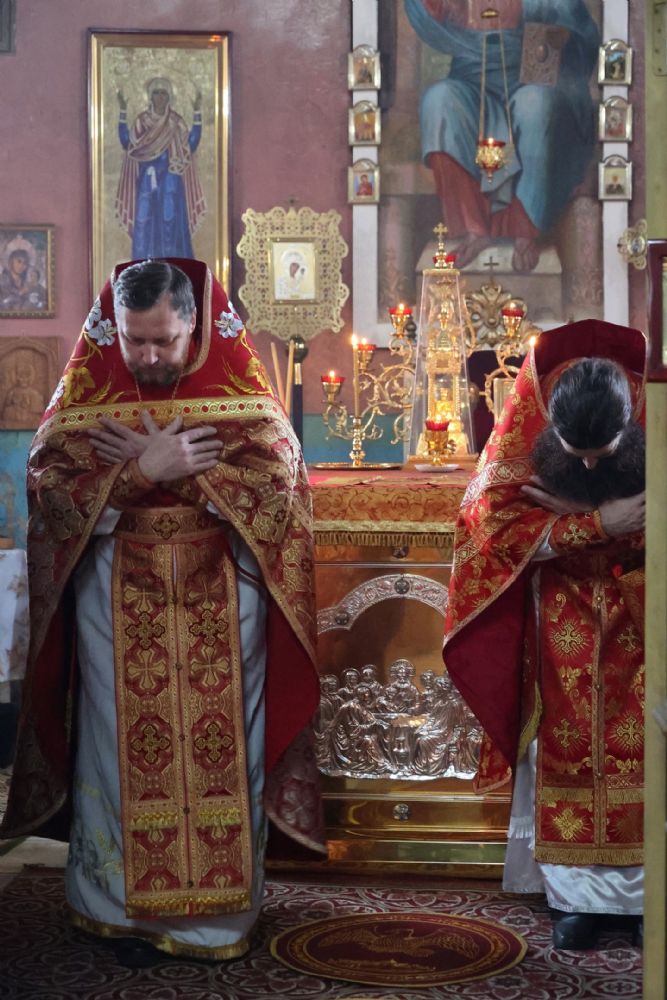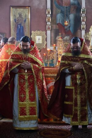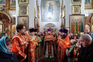 Владыке сослужили благочинный Волжского церковного округа иерей Иоанн Белинский, настоятель храма великомученика Димитрия Солунского протоиерей Евгений Бакутов, настоятель храма Рождества Христова с. Арино протоиерей Николай Чузаев, настоятель храма Покрова Пресвятой Богородицы с.Эмеково протоиерей Евгений Усков, настоятель храма Пресвятой Троицы с. Сотнур иерей Игорь Сапаев, клирики Никольского кафедрального собора г. Волжска иерей Димитрий Карпетченко и диакон Иоанн Захаров. Песнопения исполнял хор Димитриевского храма.