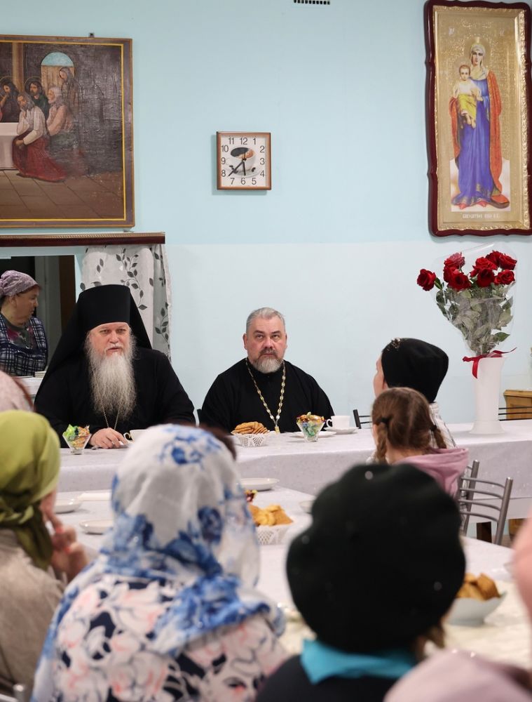 Далее в трапезной собора за чашкой чая состоялась встреча с епископом Феофаном, в ходе которой владыка обратился к родственникам наших бойцов с теплыми словами и ответил на все их вопросы.