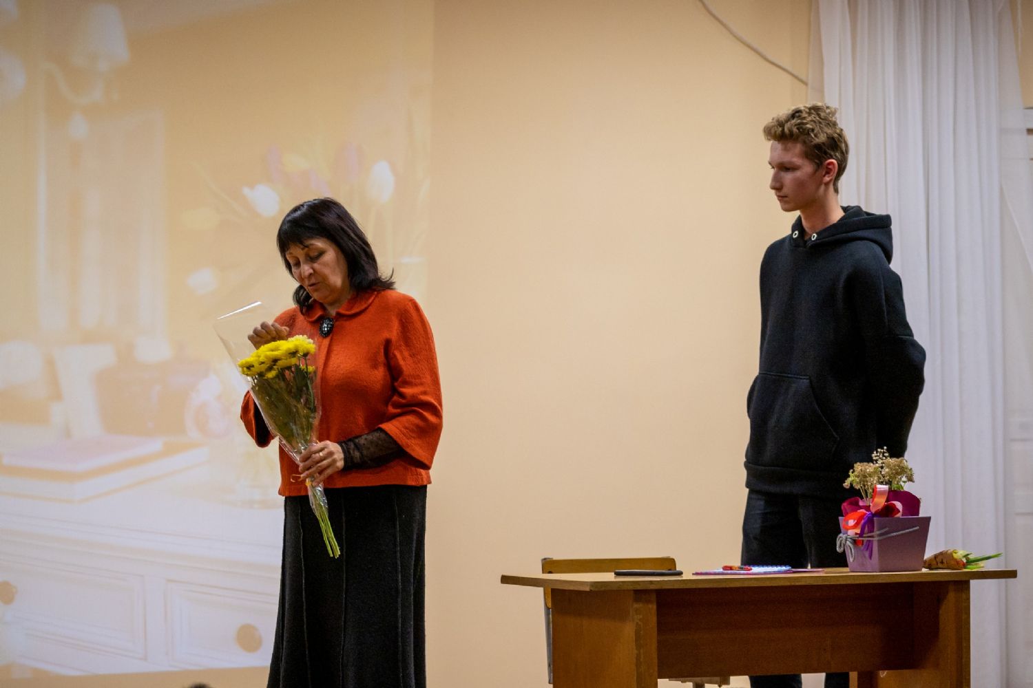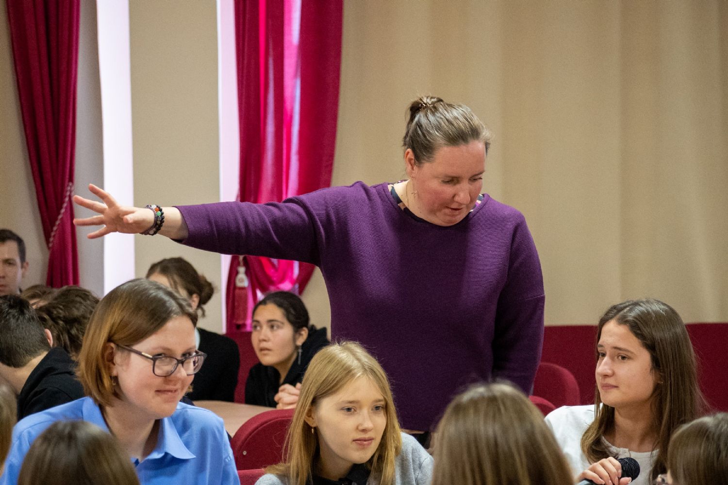 Затем ребятам была представлена постановка социального театра, основанная на реальной истории. Артисты изобразили сцену из жизни о том, как молодые люди поссорились. Анна Николаевна Ларкина - психолог, заместитель директора Республиканского центра «Доверие» - предложила присутствующим высказать причины размолвки пары. Также учащиеся могли выйти на сцену и повлиять на сценарий, проиграв, как бы они повели себя в подобной ситуации. Следует отметить, что для учащихся опыт игры в социальном театре был новым. Ребята смущались выйти на сцену, однако многие с места предлагали варианты исправления взаимоотношений влюбленных.