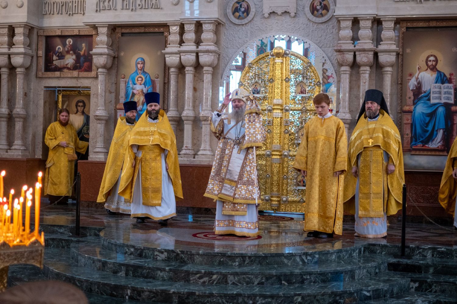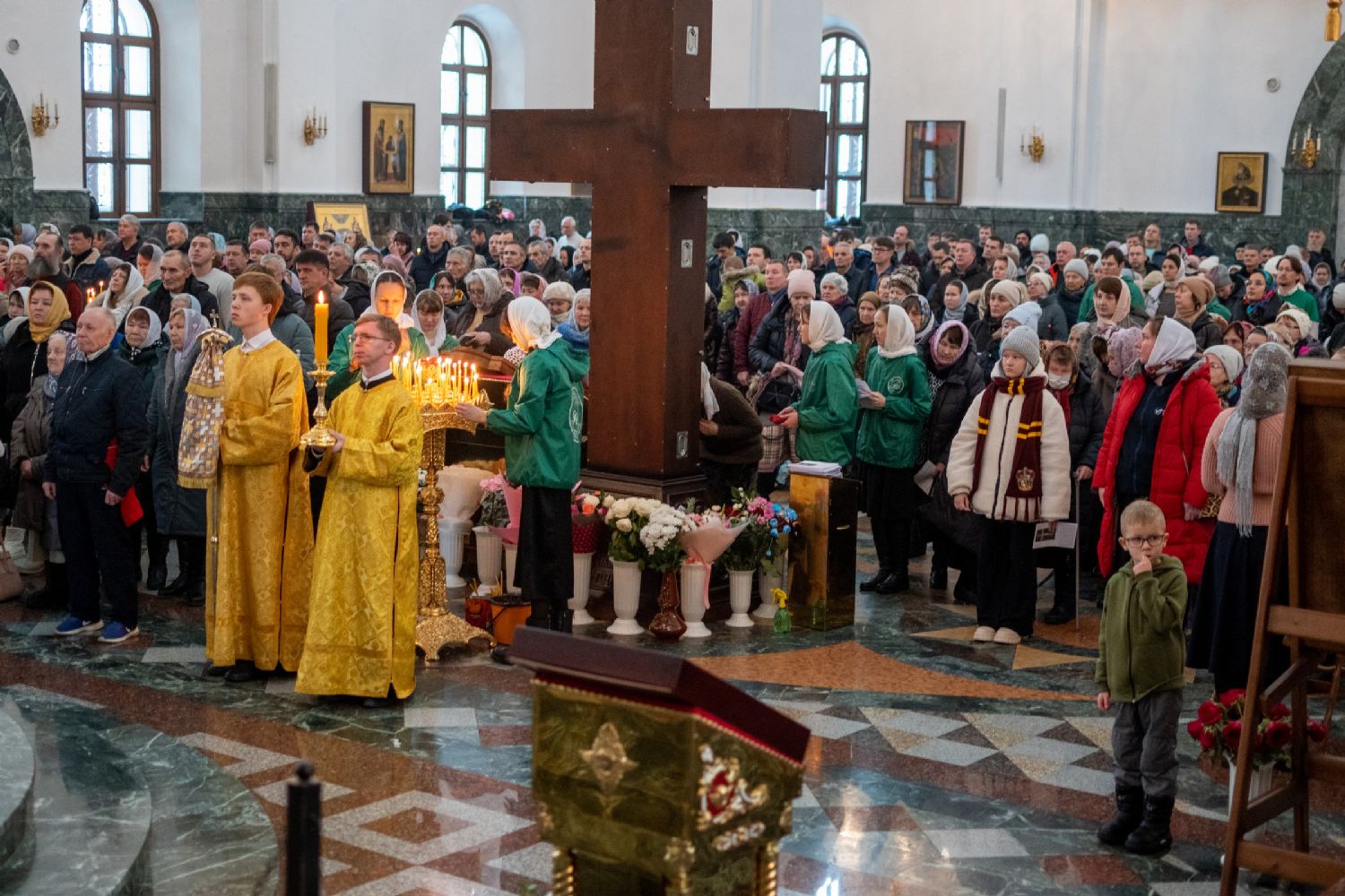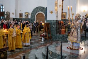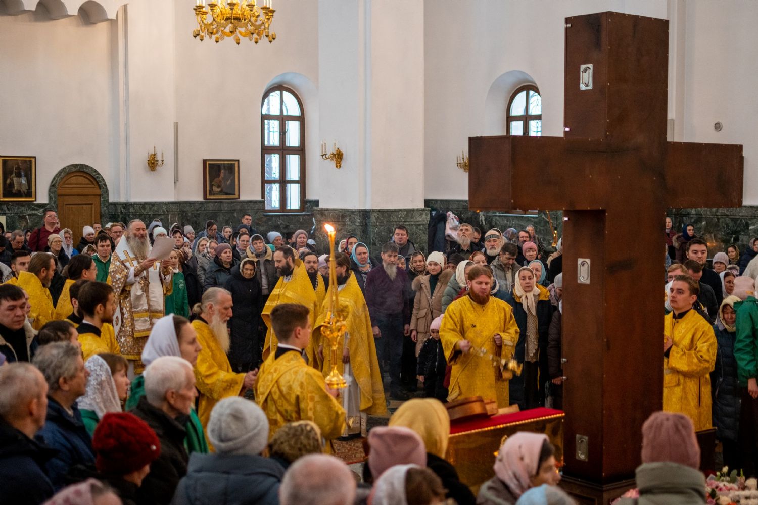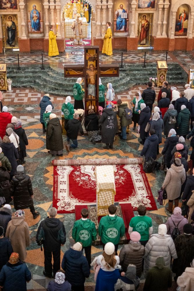 Во время богослужения в кафедральном соборе пребывала великая святыня – копия чудотворного Годеновского Креста Господня, которая прошла по стране в рамках Общероссийского крестного хода. По окончании Литургии священнослужители вознесли молитву и пропели величание Животворящему Кресту.