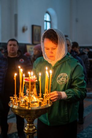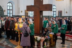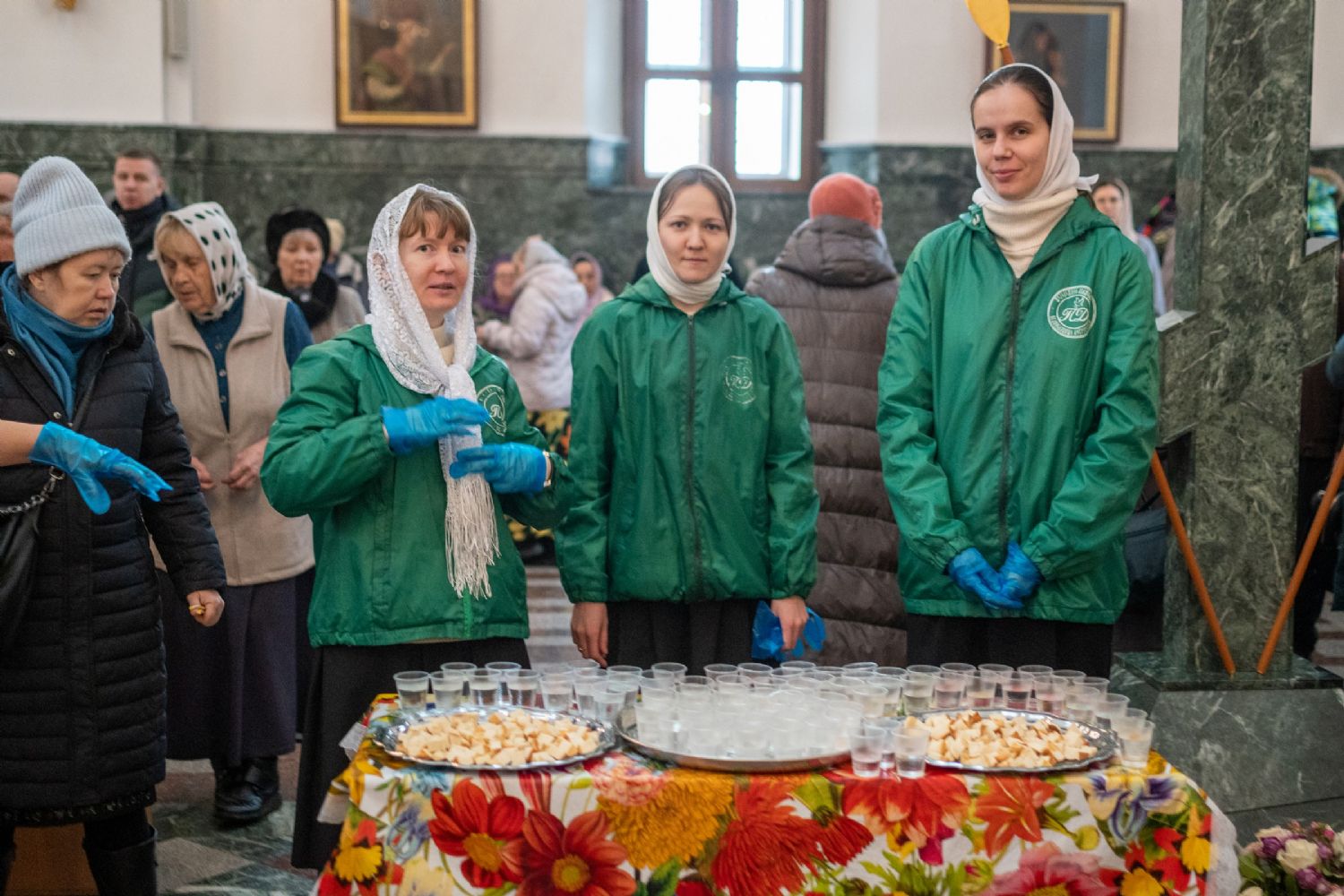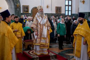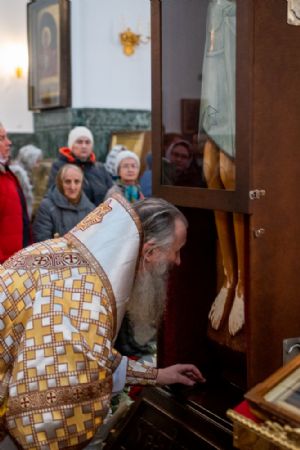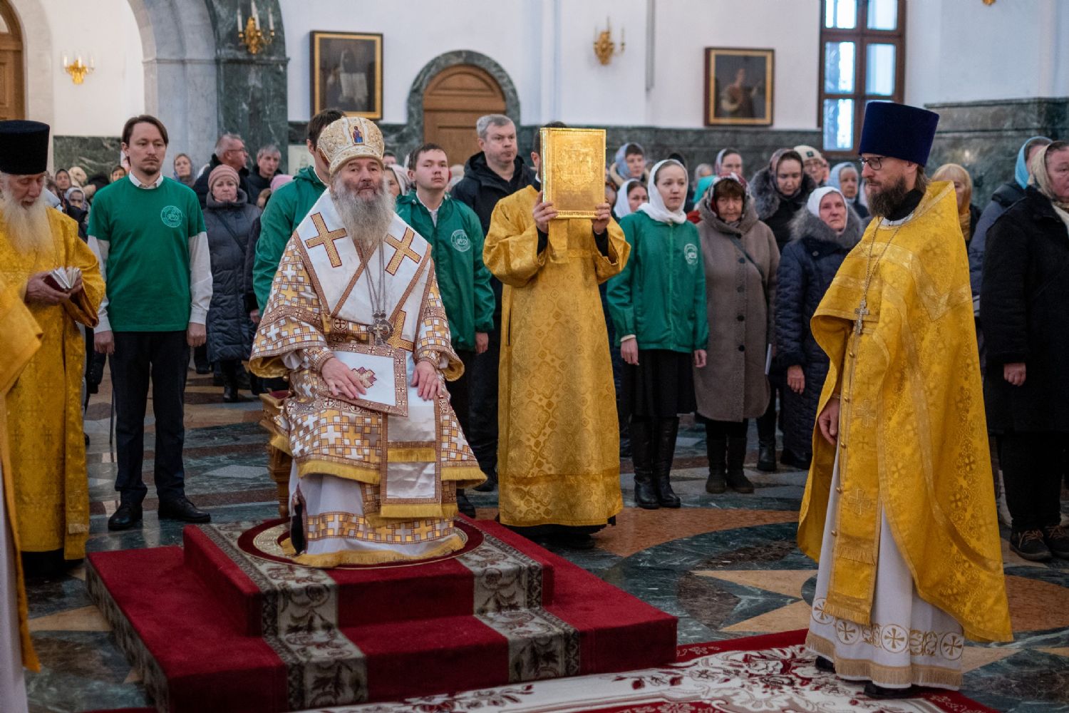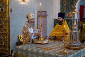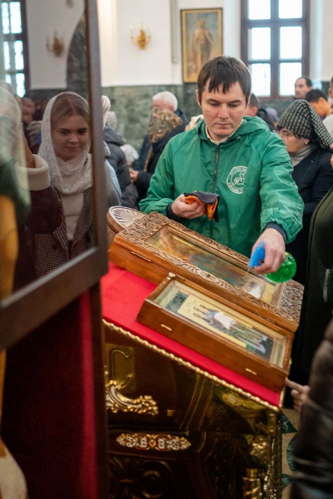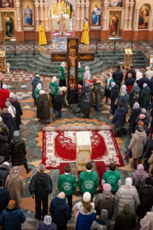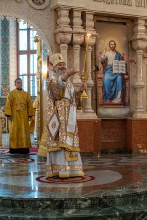 Во время богослужения в кафедральном соборе пребывала великая святыня – копия чудотворного Годеновского Креста Господня, которая прошла по стране в рамках Общероссийского крестного хода. По окончании Литургии священнослужители вознесли молитву и пропели величание Животворящему Кресту.