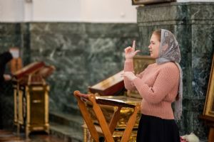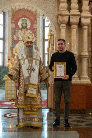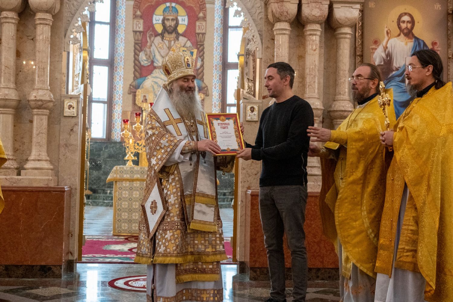 В завершение митрополит Иоанн вручил сурдопереводчику православной общины глухих Йошкар-Олинской епархии Михаилу Михайловичу Виногорову архиерейскую грамоту за вклад в созидание церковной жизни.