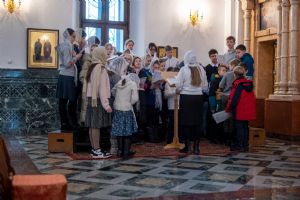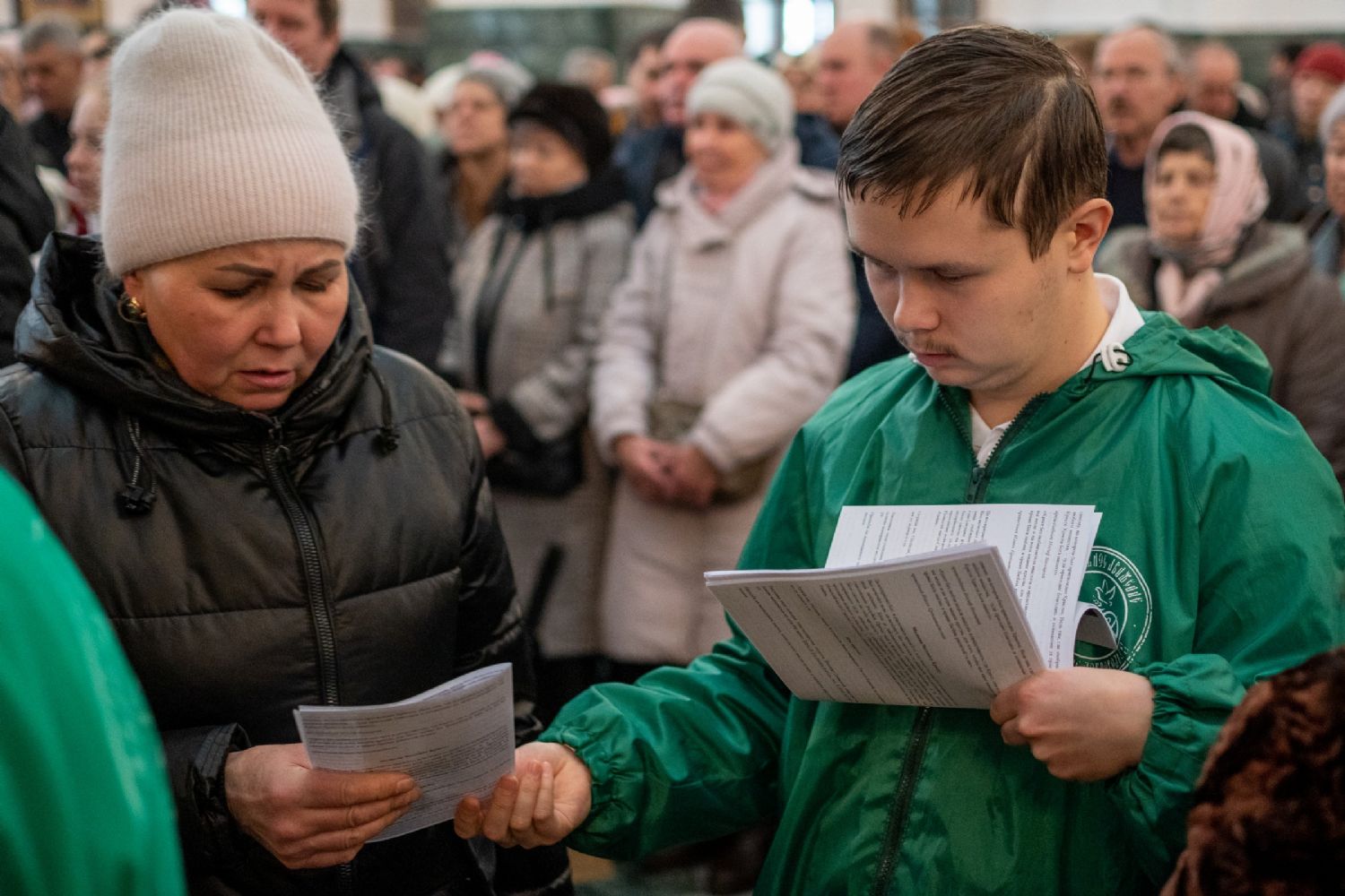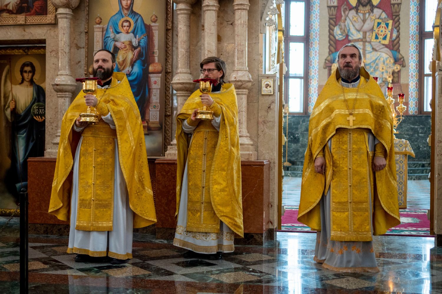 Его Высокопреосвященству сослужили секретарь Йошкар-Олинского епархиального управления иеромонах Серафим (Пасанаев), ключарь кафедрального собора протоиерей Сергий Поглазов, клирики собора, руководитель Миссионерского отдела Йошкар-Олинской епархии протоиерей Алексий Михайлов, гость из Москвы иерей Сергий Фуфаев – заместитель председателя Синодального миссионерского отдела, а также протодиакон Михаил Козловский. Песнопения исполняли старший и младший составы детско-юношеского хора «Благовест» под управлением регентов Татьяны Черновой и Надежды Поздеевой.