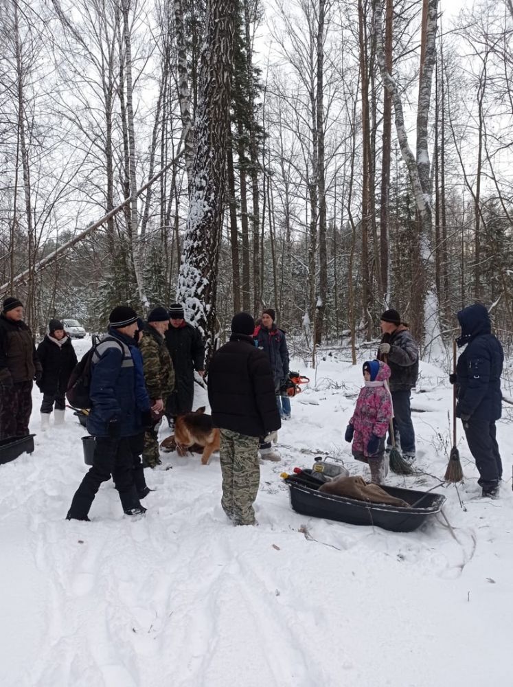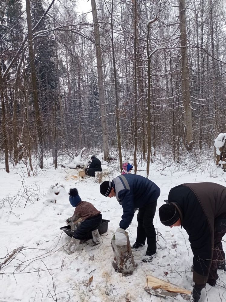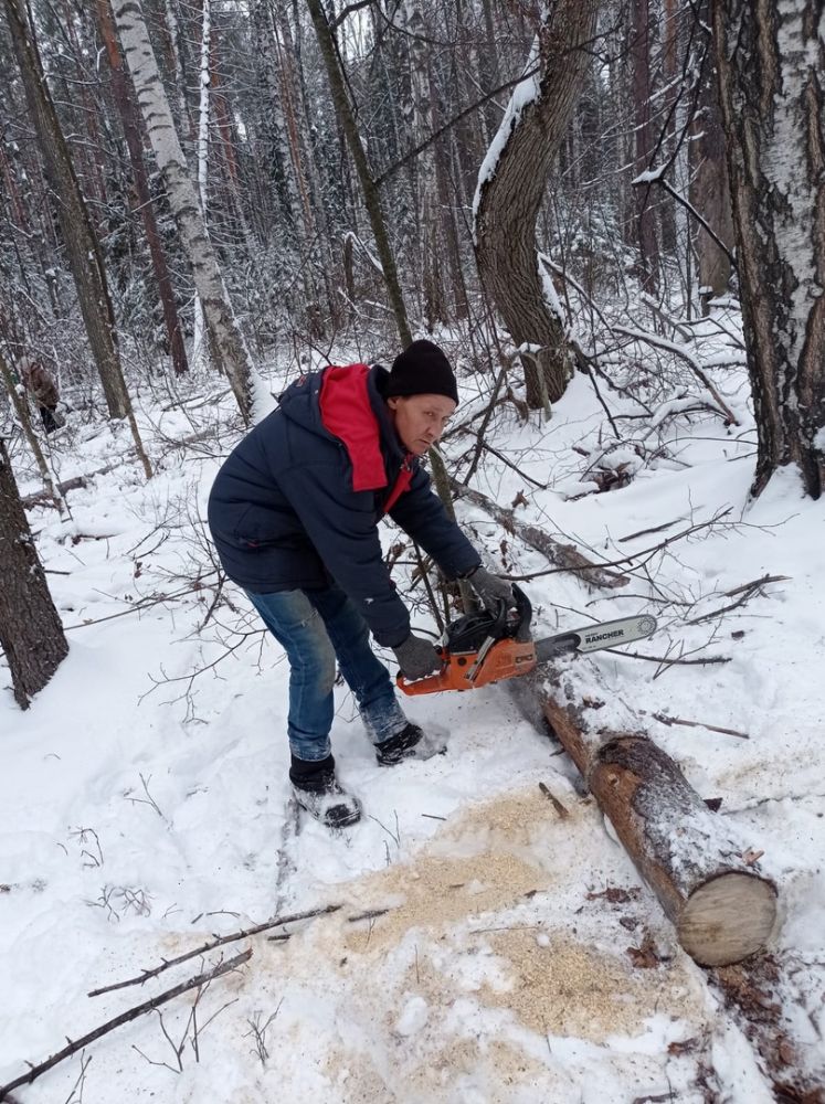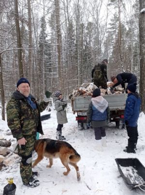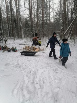Работали дружно, в шесть бензопил. Пока мужчины пилили и кололи дрова, женщины готовили еду, обрубали сучки, грузили дрова на газель, чтобы вывезти их из леса. Посильное участие принимали и дети – на санях подвозили наколотые поленья к машине.