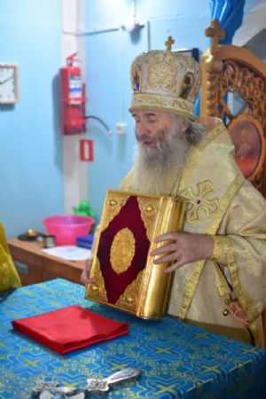 Богослужение началось торжественной встречей митрополита Иоанна и облачением в центре храма.