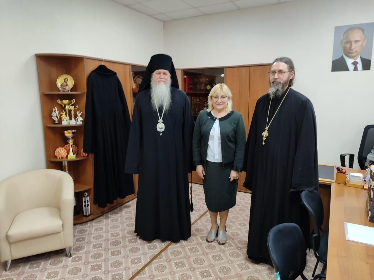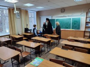 Школьники слушали с интересом и задавали вопросы, на которые владыка давал подробные разъяснения. Епископ Феофан посетил классы, в которых когда-то сам учился, благословил преподавателей и школьников. Для гостя также организовали небольшую экскурсию в школьный военно-патриотический музей. Владыка осмотрел экспозицию и оставил свои пожелания в книге отзывов.