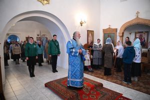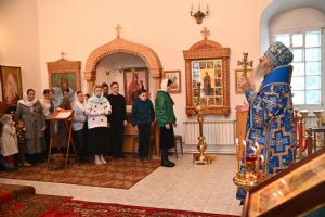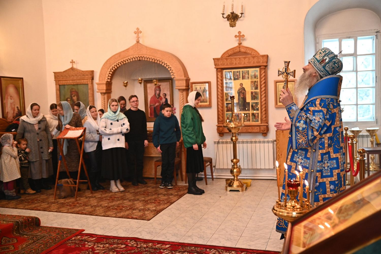 После Литургии владыка с сослужащим священством совершили славление: пропели тропарь, кондак и величание праздника Введения во храм Пресвятой Богородицы.