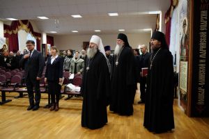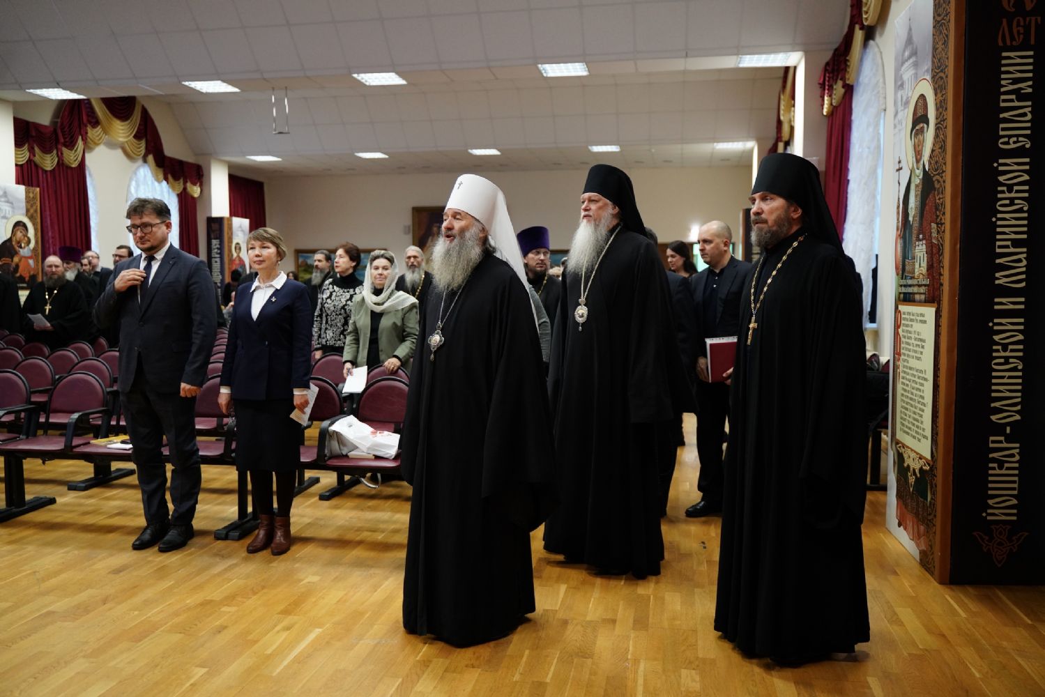 Также собравшихся приветствовали епископ Волжский и Сернурский Феофан, Глава городского округа «Город Йошкар-Ола» Виктор Кузнецов, мэр Йошкар-Олы Евгений Маслов и директор МарНИИЯЛИ Людмила Григорьева.