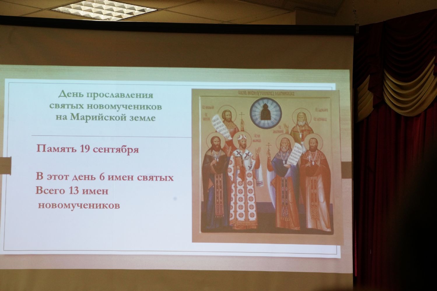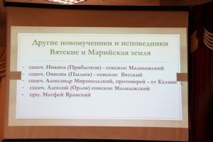 Протоиерей Андрей Лебедев, член комиссии по канонизации святых Вятской епархии, представил доклад на тему «Общие новомученики вятской и марийской земли: места и формы почитания». Собор Вятских святых насчитывает сейчас 31 имя, из них 7 связано одновременно и с Марийским краем. Это святитель Виктор (Островидов), епископ Вятский, священномученик Евгений (Зернов), митрополит Нижегородский, священномученик Анатолий Ивановский, миссионер из Казани священномученик Александр Миропольский, священномученик Леонид (Антощенко), епископ Марийский, священномученик Сергий Стрельников, священномученик Сергий (Дружинин), епископ Нарвский.