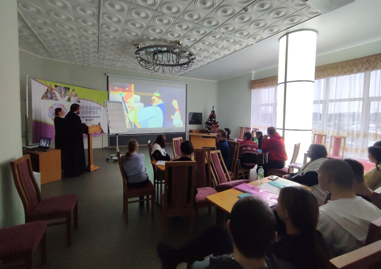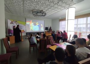Между ответами отец Игорь и Анна Владимировна приводили примеры из жизни и задавали ребятам философские вопросы, касающиеся отношения к своему Отечеству. Для наглядности ребятам демонстрировались видеофрагменты из мультфильмов, где наглядно иллюстрировались данные вопросы.