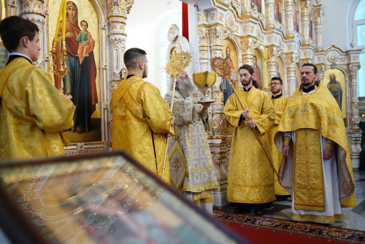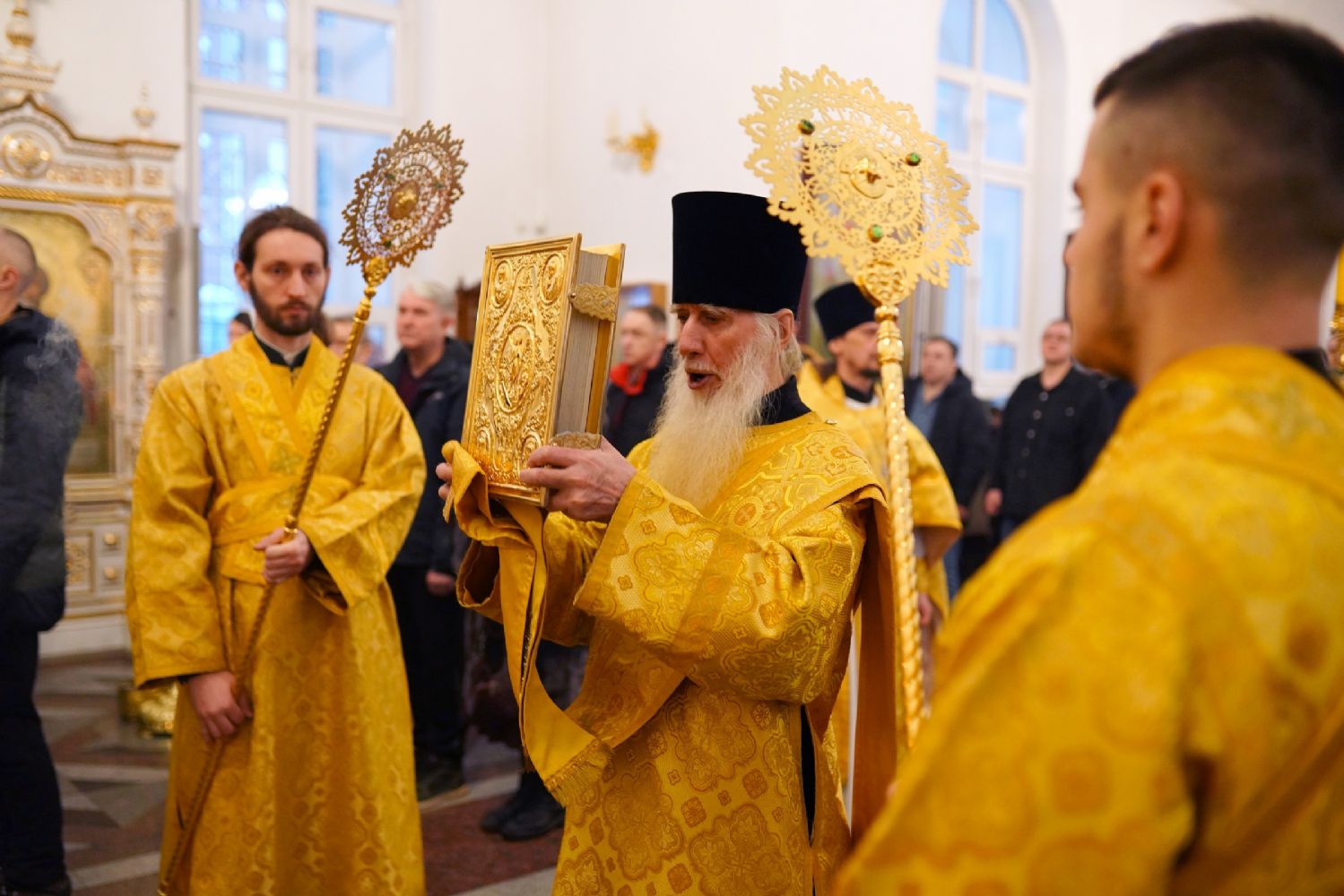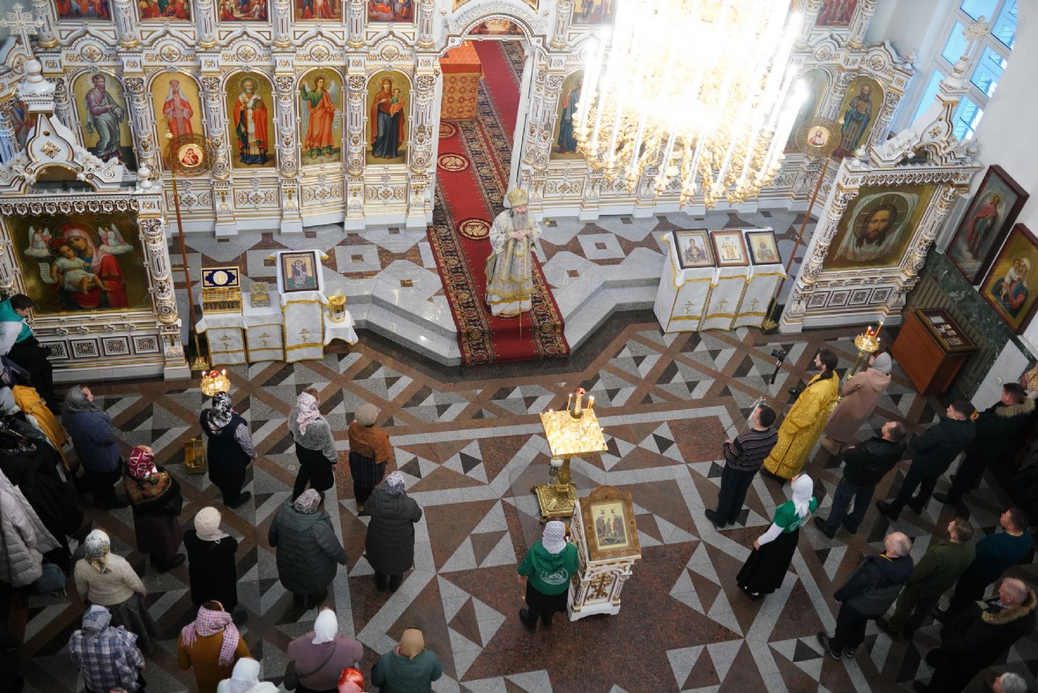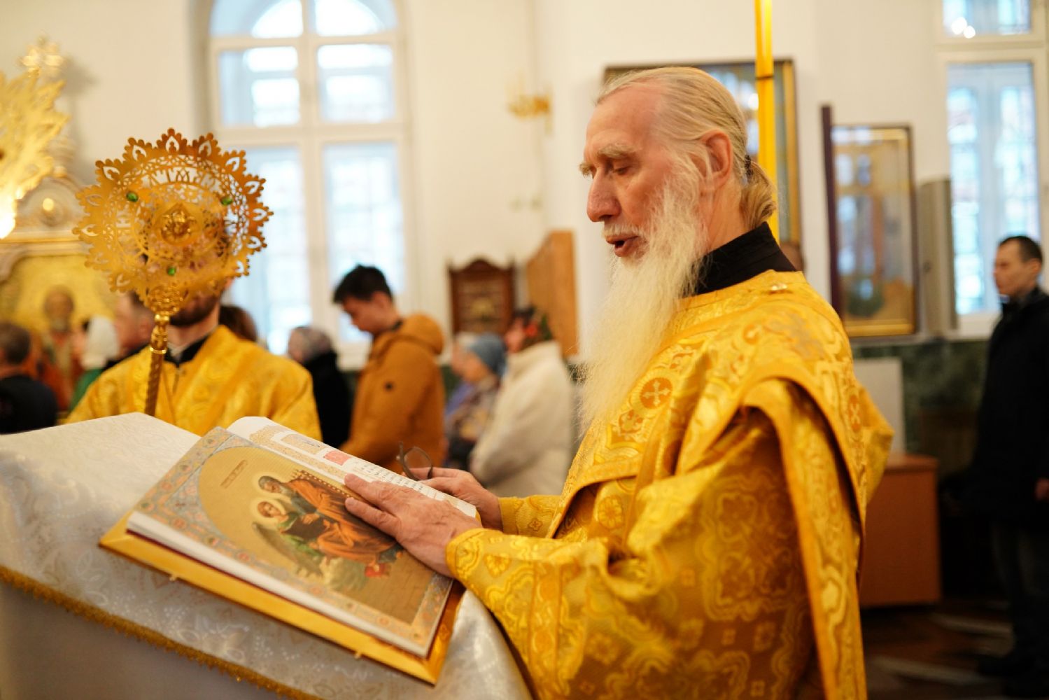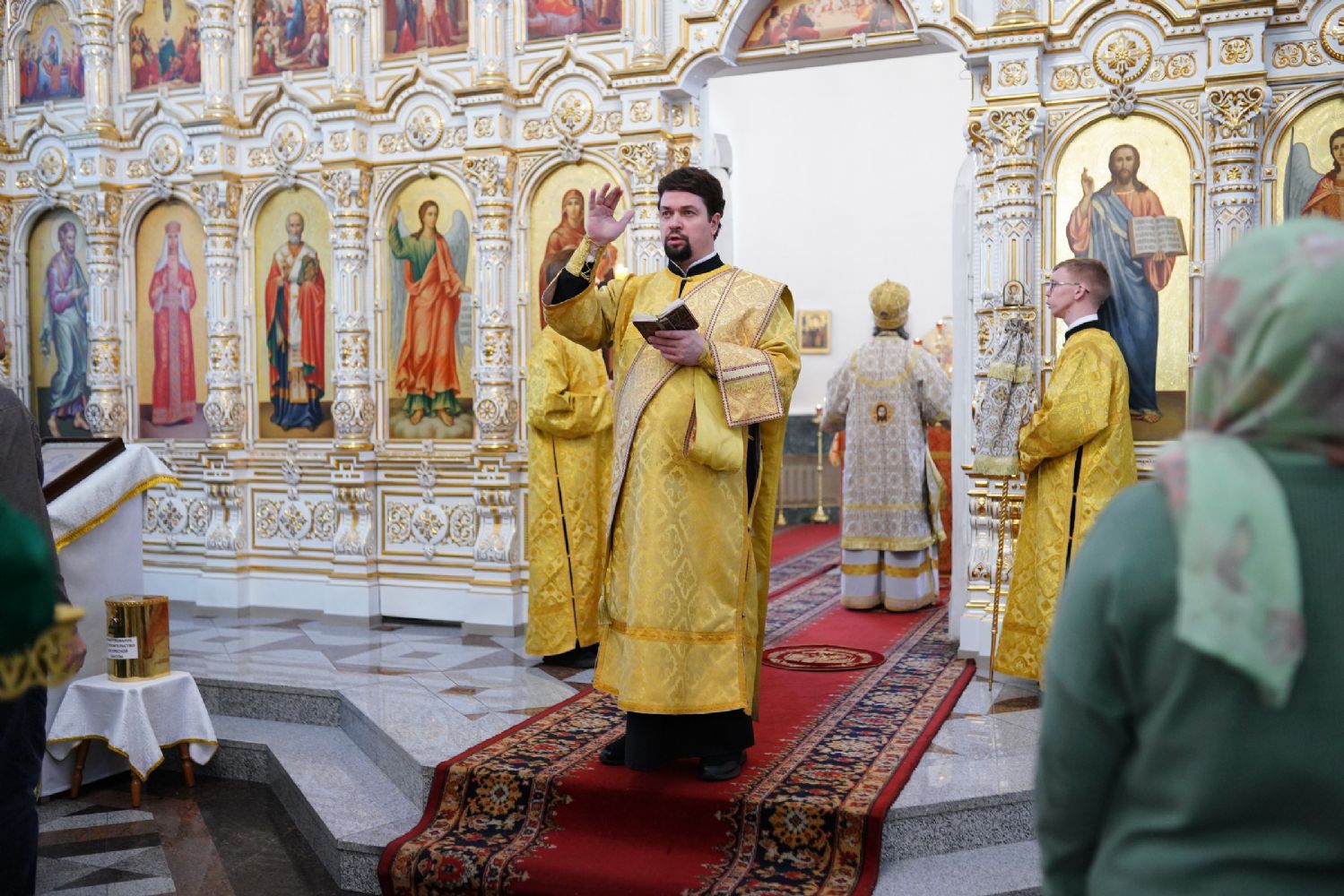 Архипастырю сослужили настоятель собора иерей Андрей Кочаков, протодиакон Михаил Козловский и клирик собора диакон Алексий Кузнецов. Песнопения исполнял хор собора под управлением Алисы Вылегжаниной.