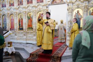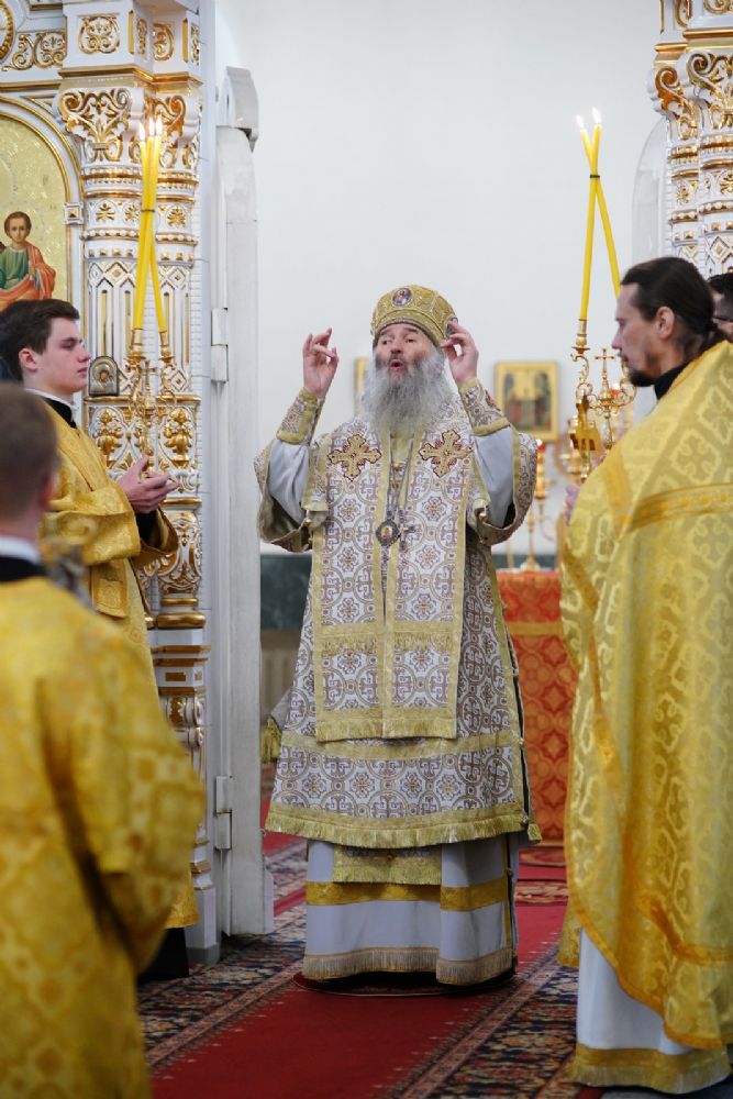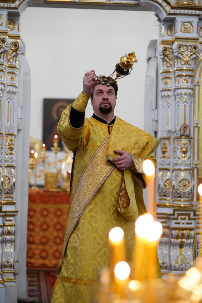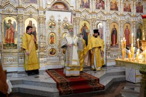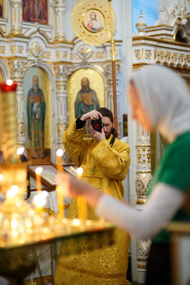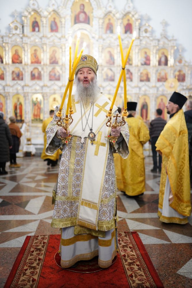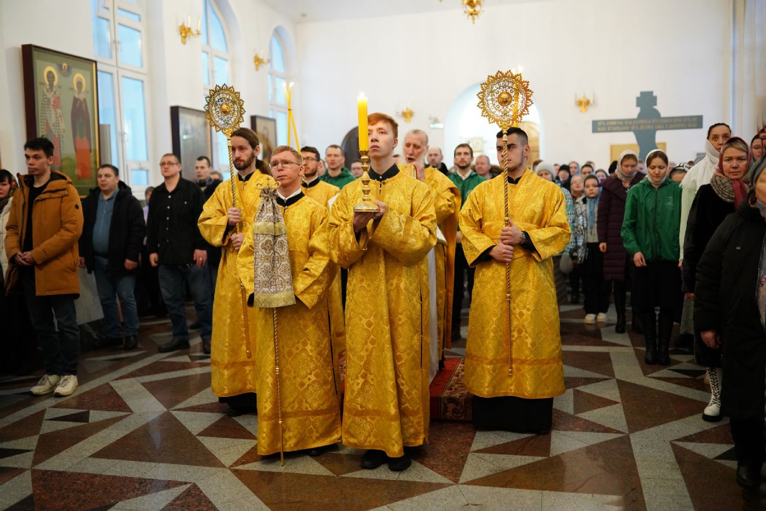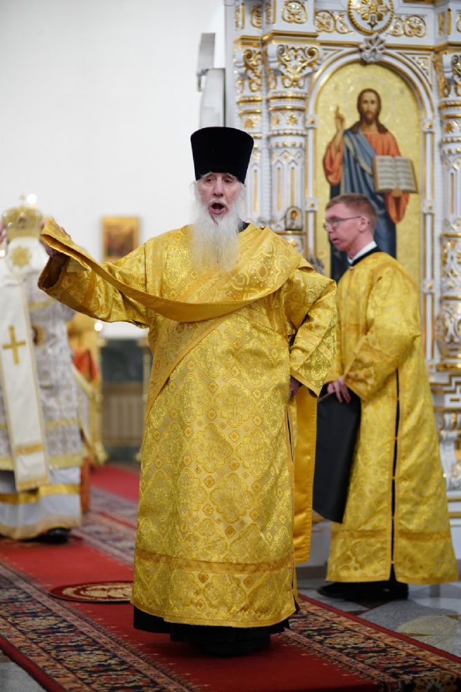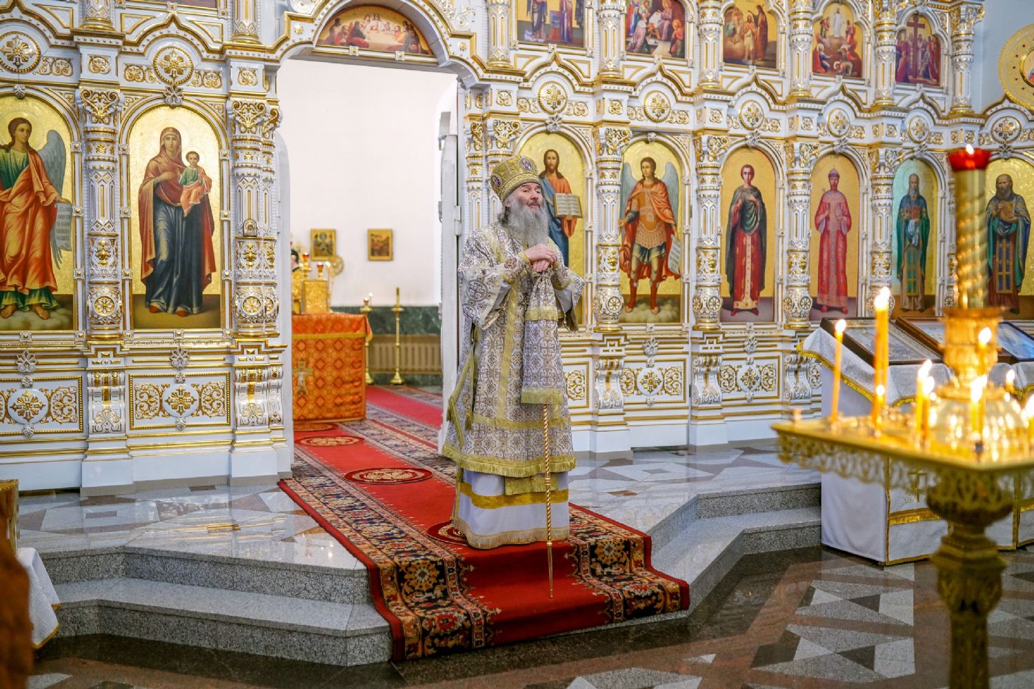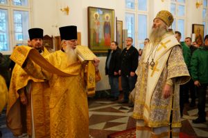 Архипастырю сослужили настоятель собора иерей Андрей Кочаков, протодиакон Михаил Козловский и клирик собора диакон Алексий Кузнецов. Песнопения исполнял хор собора под управлением Алисы Вылегжаниной.