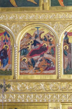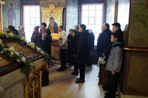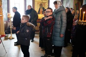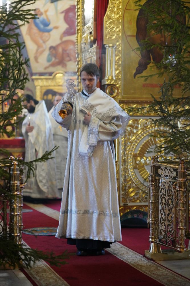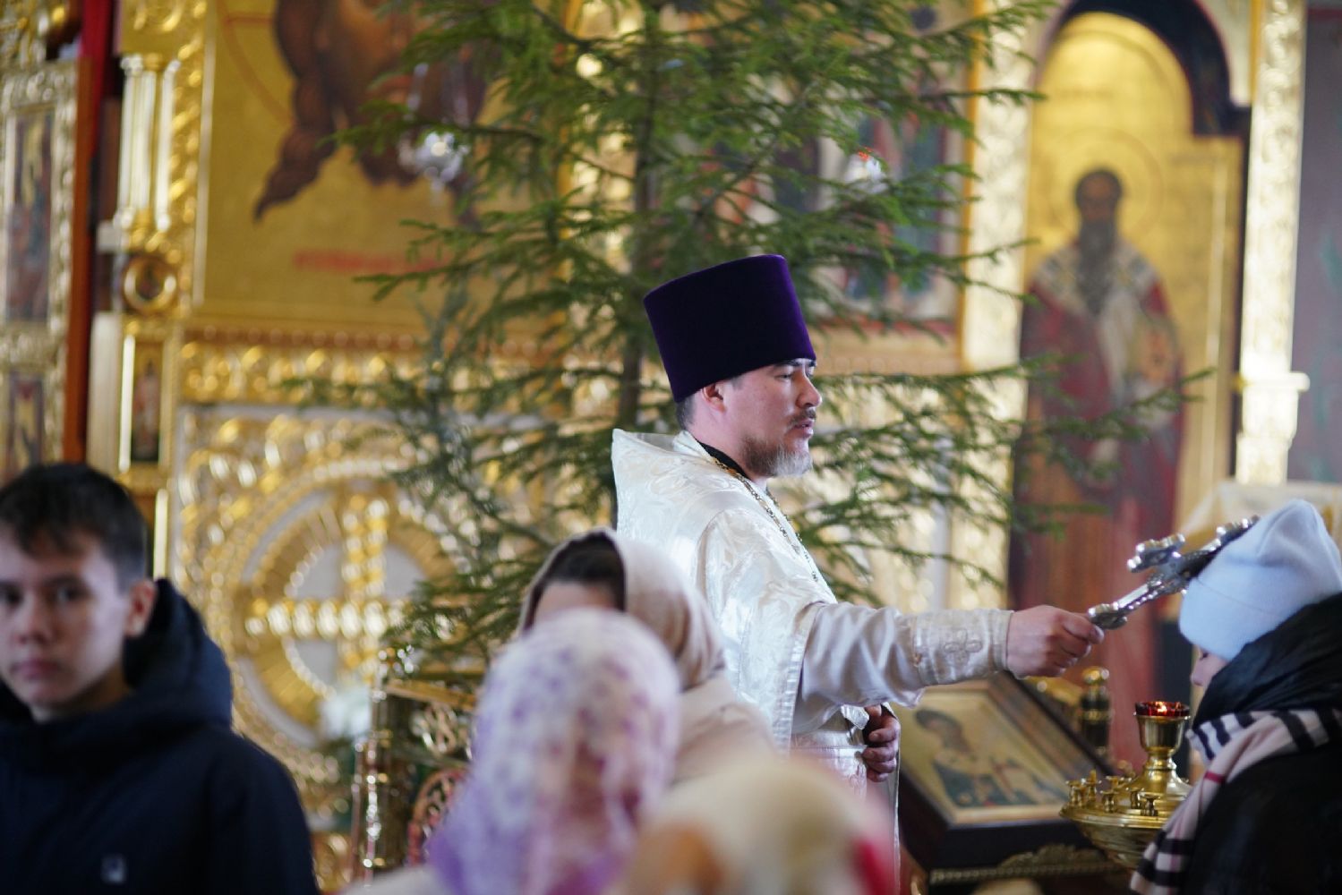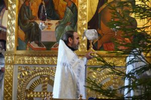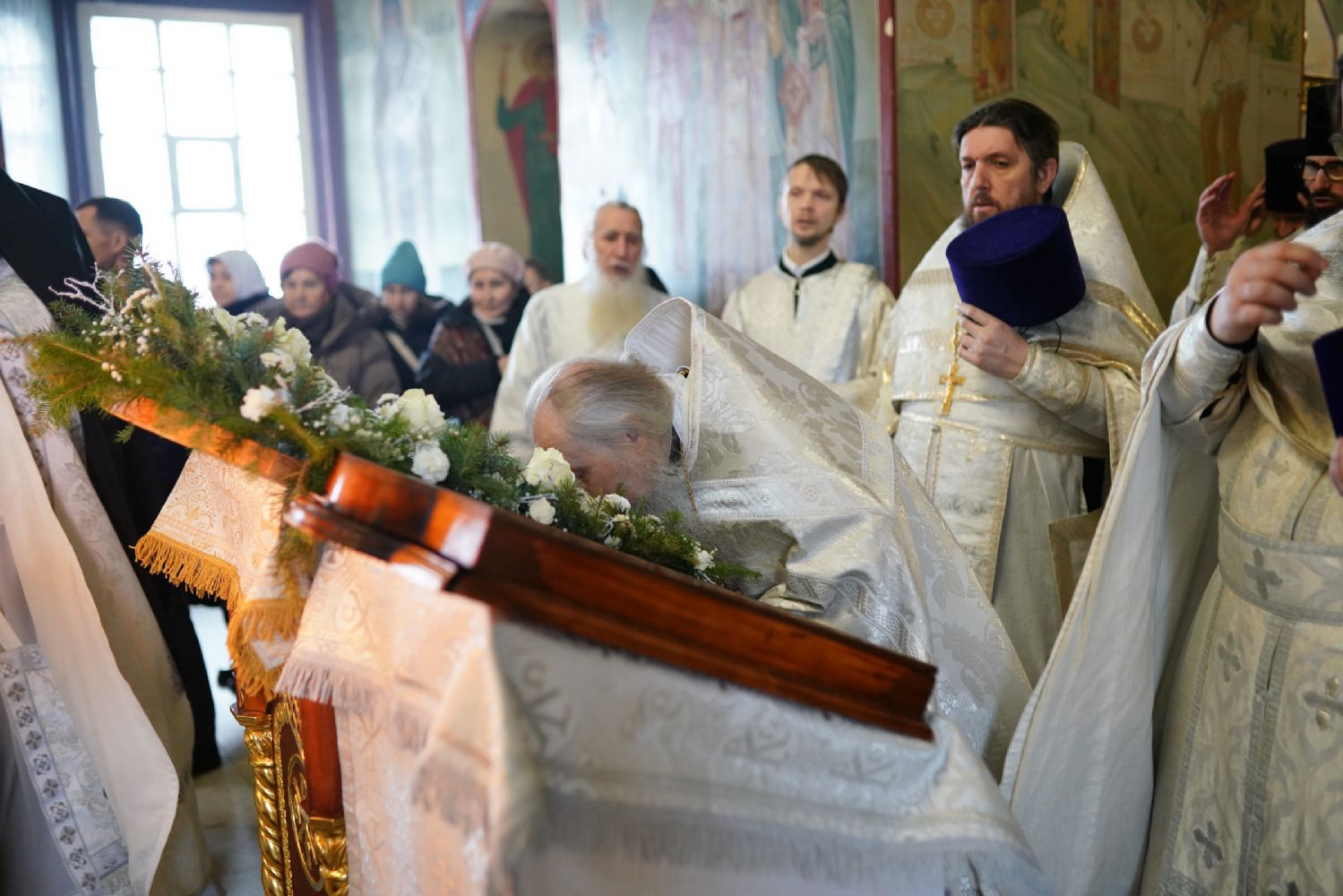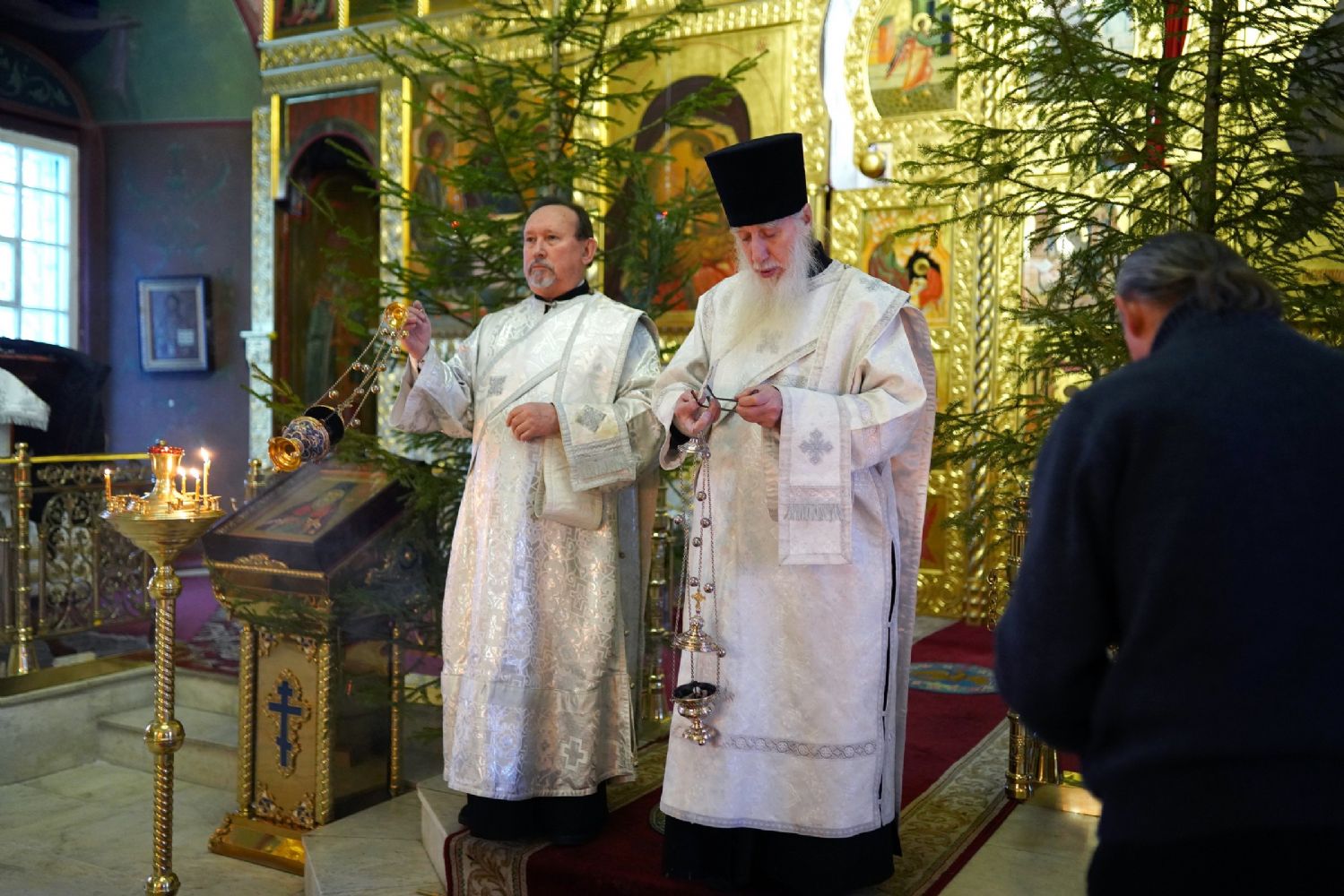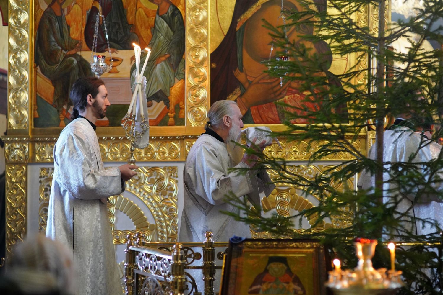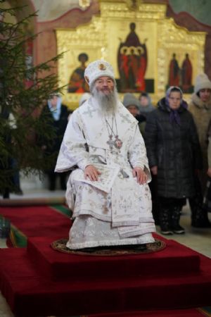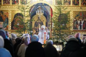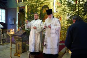 После Литургии владыка со священством в центре храма совершили славление Рождеству Христову и священномученику Леониду.