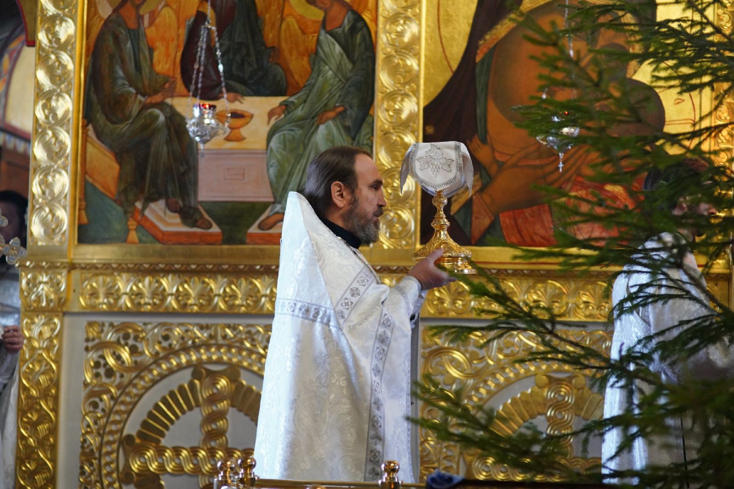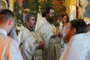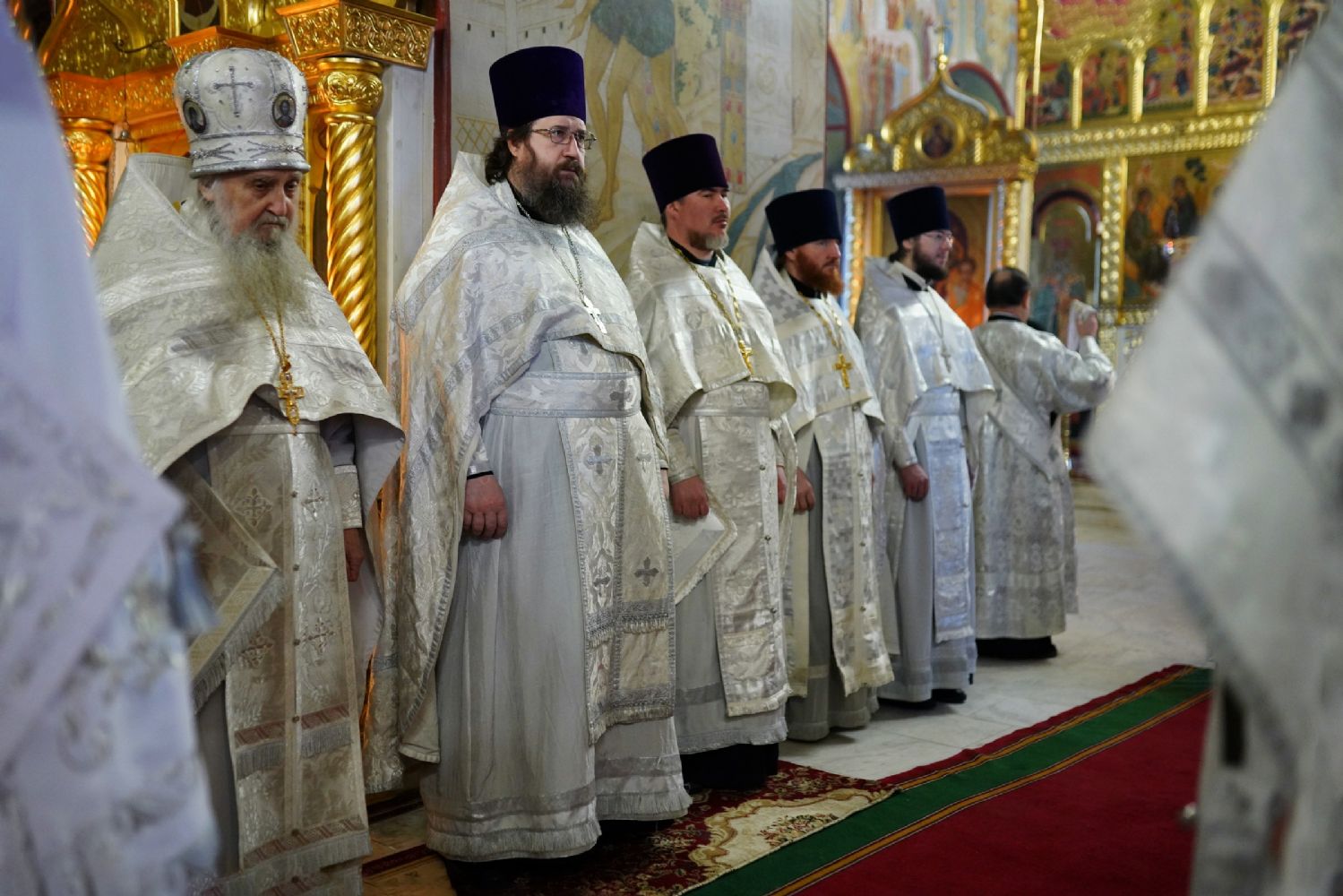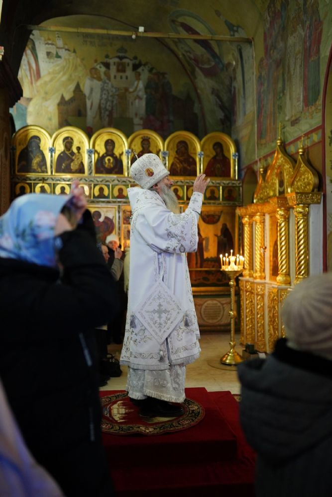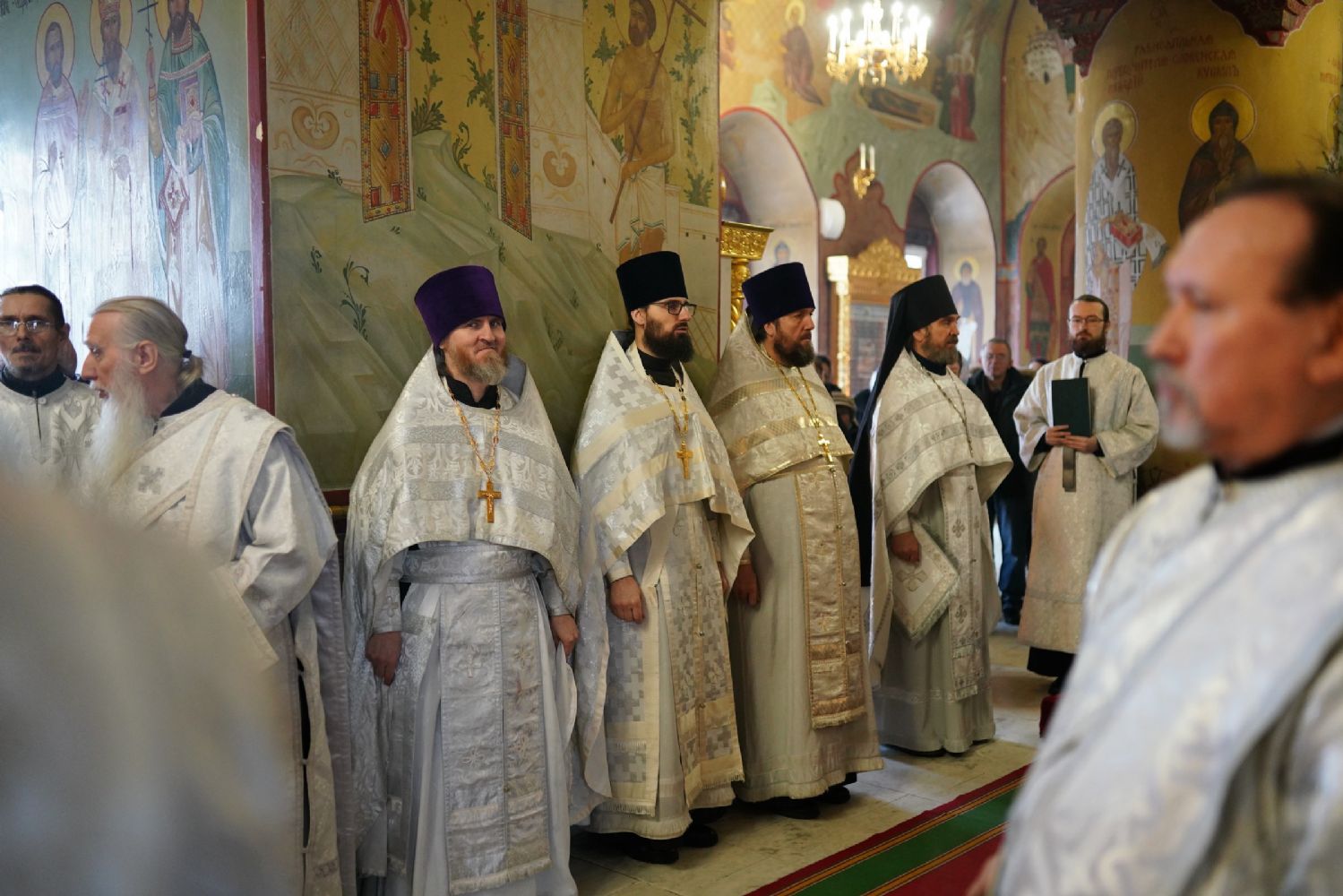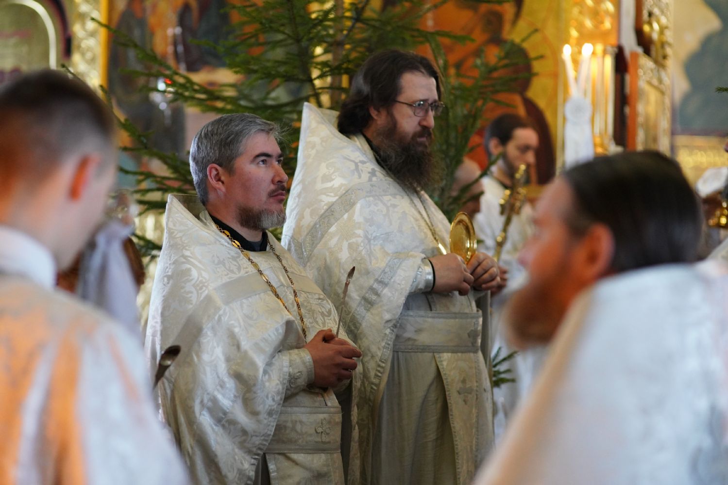 Архипастырю сослужили секретарь Йошкар-Олинского епархиального управления иеромонах Серафим (Пасанаев), настоятель собора протоиерей Евгений Кутырев, благочинный Йошкар-Олинского церковного округа протоиерей Андрей Норкин, клирики собора и протодиакон Михаил Козловский. Песнопения исполнял хор собора под управлением Ангелины Бабиной.