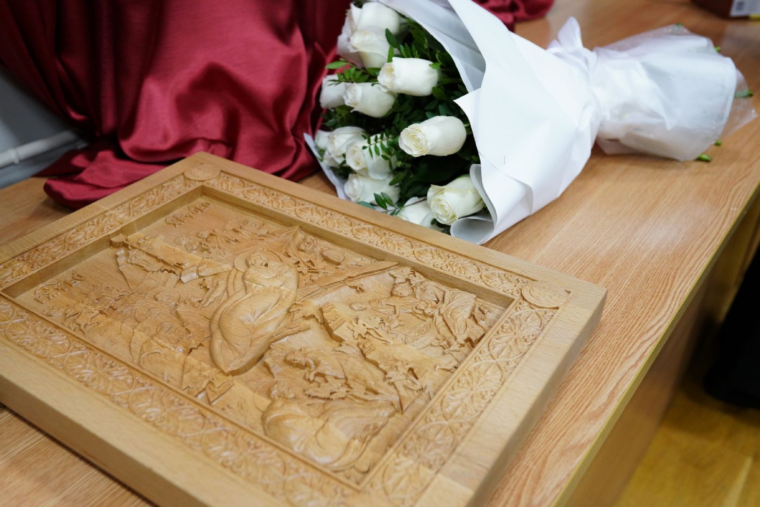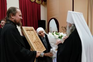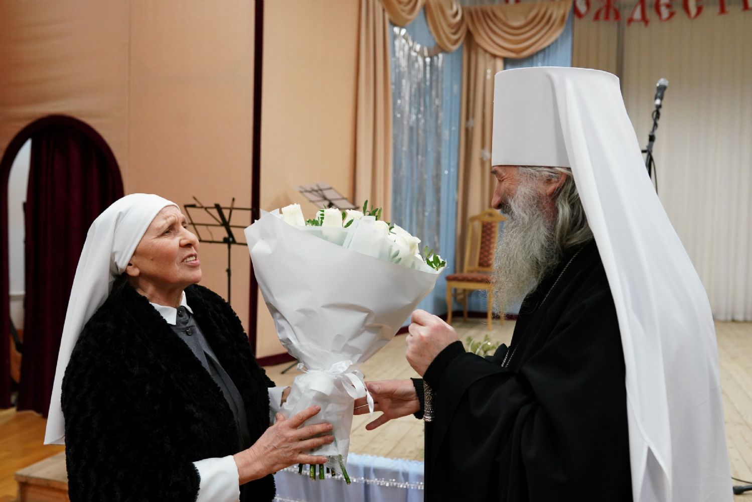 Сестры милосердия вручили архипастырю икону Рождества Христова, вырезанную из дерева. А владыка и священнослужители раздали всем сладкие подарки.