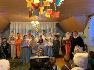 Продолжился праздник в воскресной школе д. Коркатово концертной программой «Рождественская радость». В зале собрались сами дети, их родители и родственники, гости из воскресной школы д. Шереганово Моркинского района, а также сказочные персонажи: Дед Мороз, Снегурочка, волк, лиса, заяц.