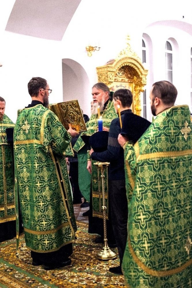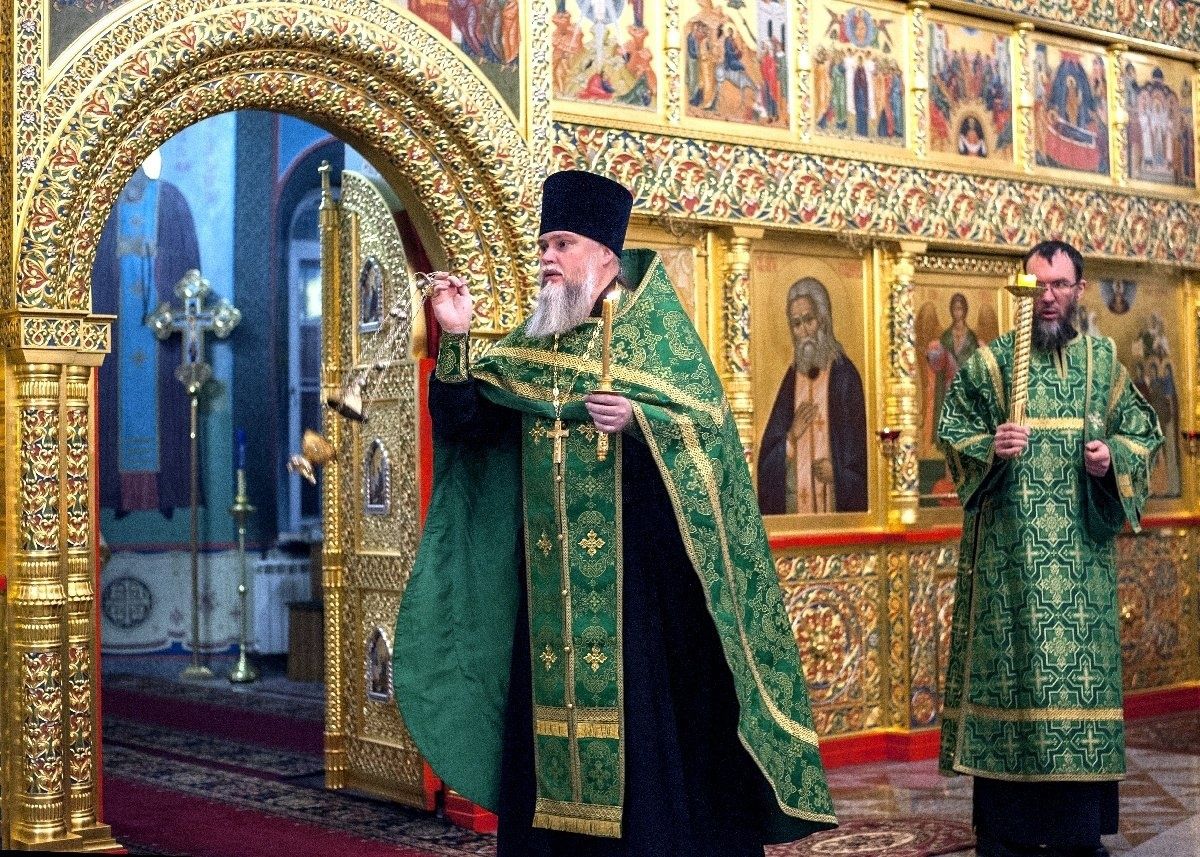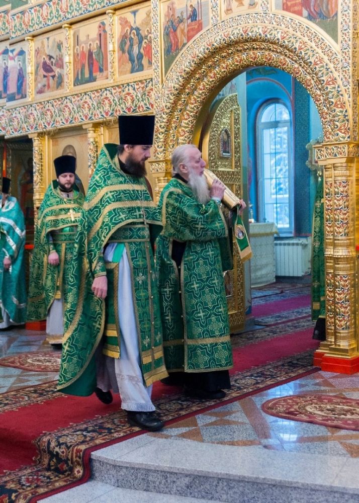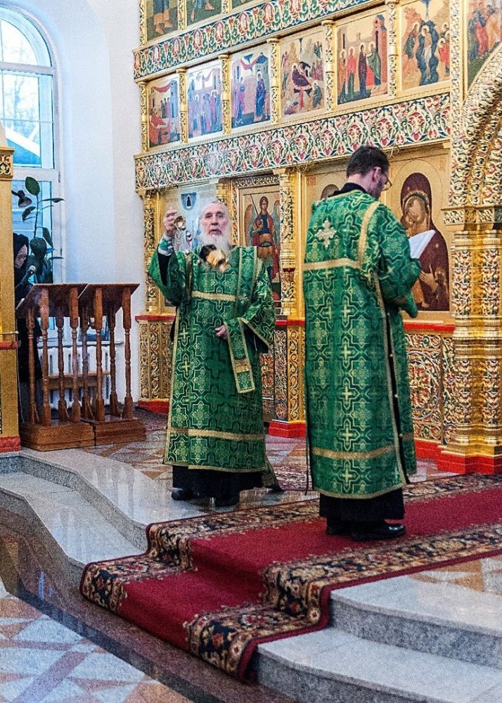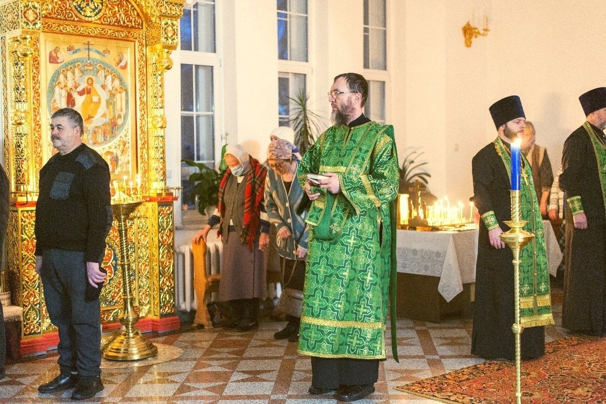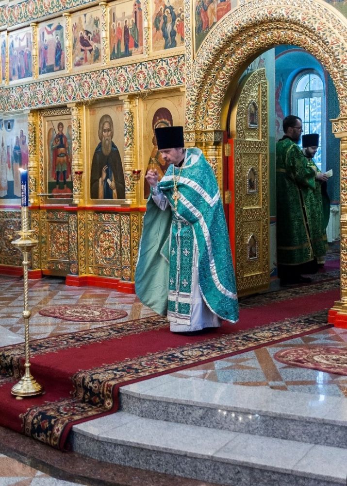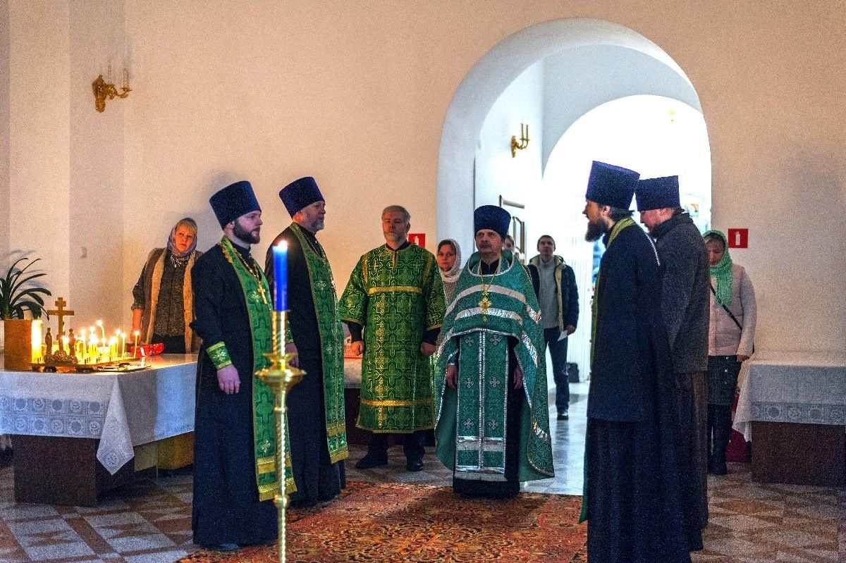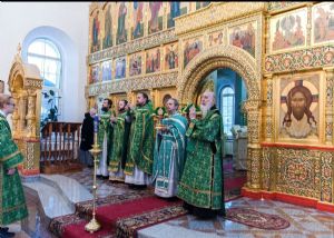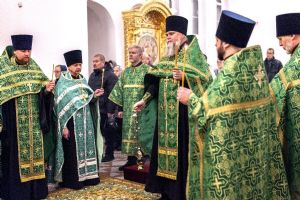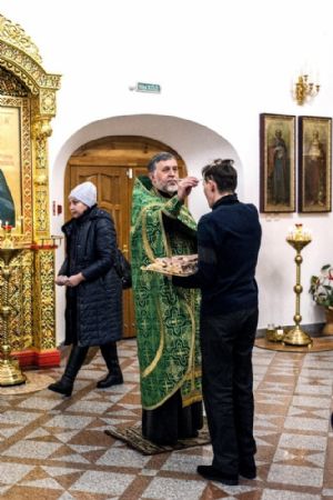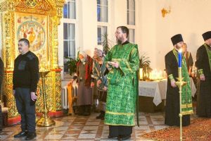 Вечером богослужение возглавил настоятель храма протоиерей Александр Бачурин, а Божественную литургию – клирик храма протоиерей Василий Лихачев в сослужении духовенства храма. Разделить радость праздника на Литургию приехал также архиерейский протодиакон Михаил Козловский.