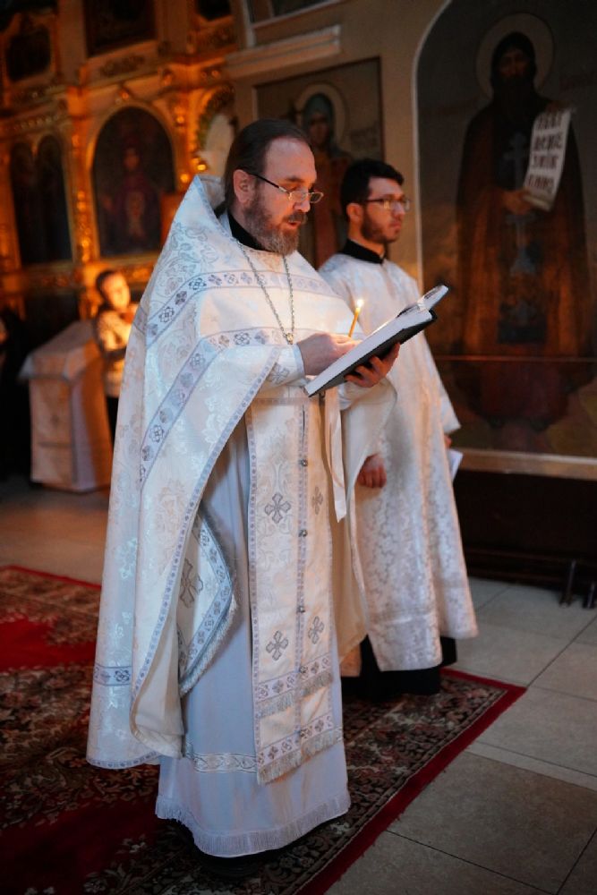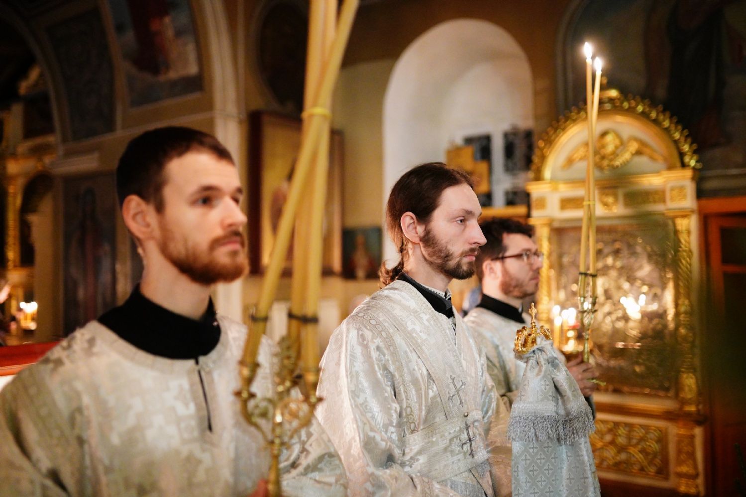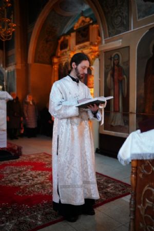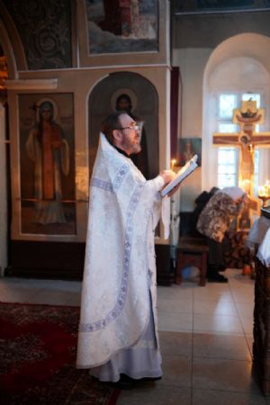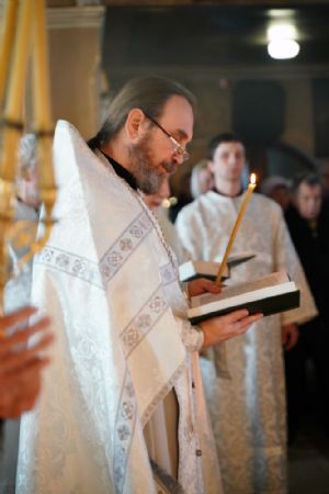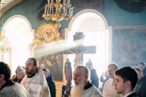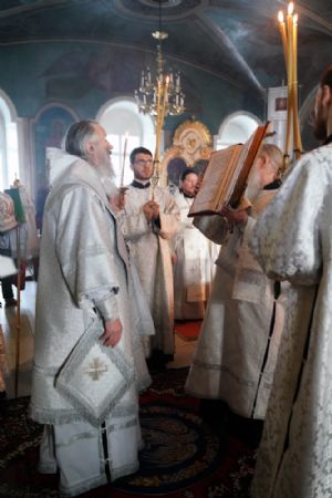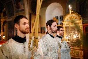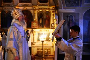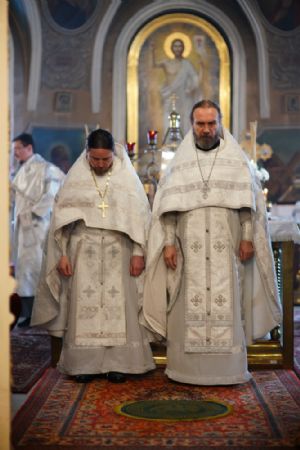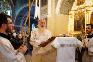 Его Высокопреосвященству сослужили секретарь Йошкар-Олинского епархиального управления иеромонах Серафим (Пасанаев), клирики храма иерей Димитрий Иванов, протодиакон Михаил Козловский и диакон Димитрий Смирнов. Песнопения исполнял хор храма.