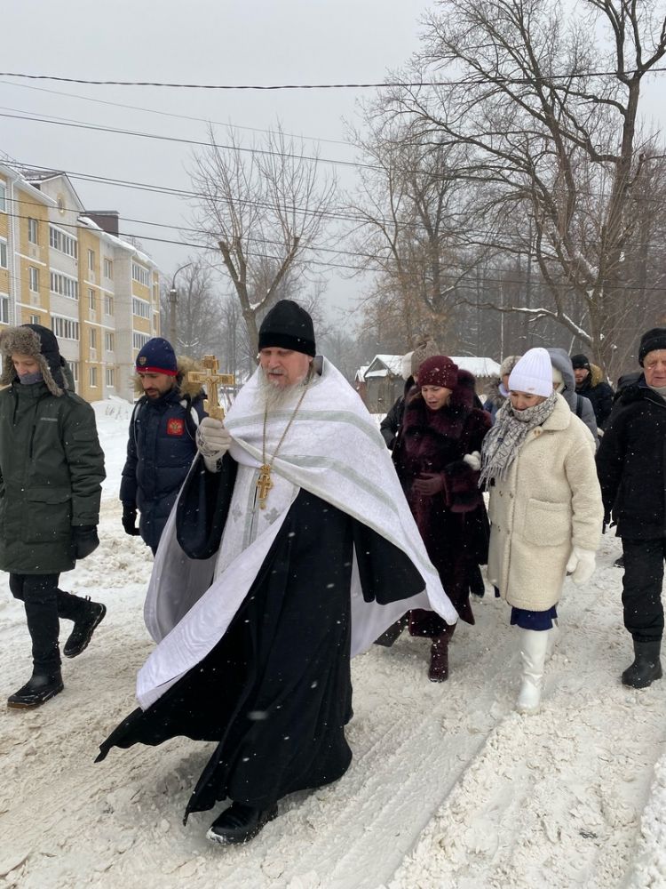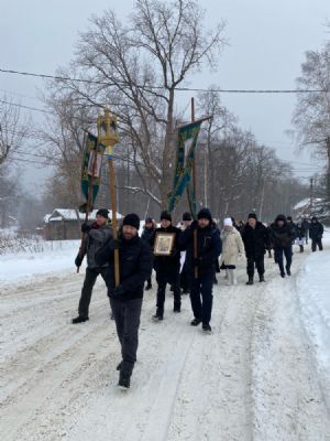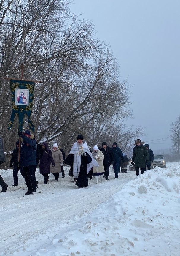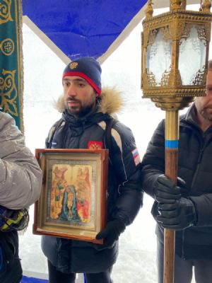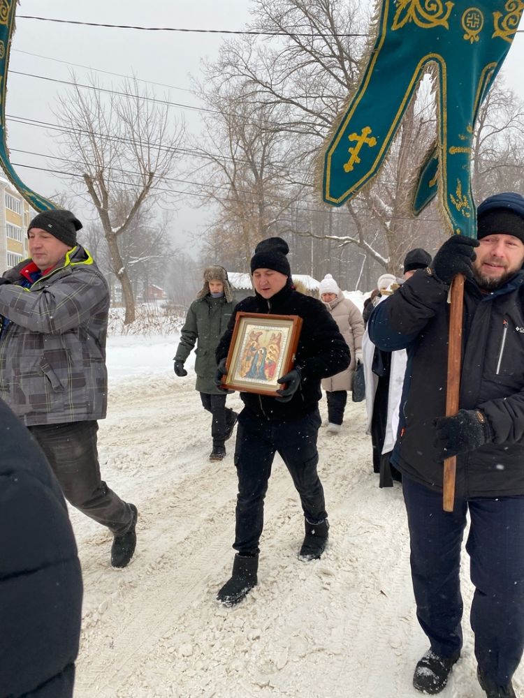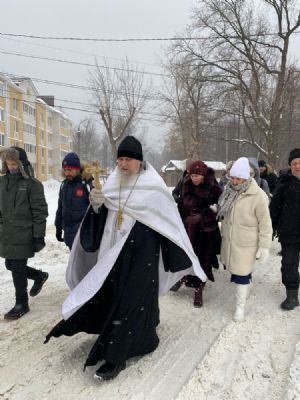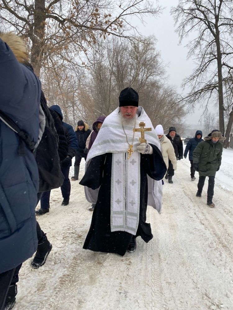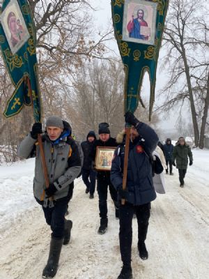 19 января после Божественной литургии в храме иконы Божией Матери «Всех скорбящих Радость» г. Волжска прихожане во главе с настоятелем храма протоиереем Александром Михайловым с иконами и хоругвями, с пением тропаря Крещению Господню двинулись к берегу Волги, где заранее была подготовлена специально оборудованная купель – крещенская иордань. Общему молитвенному настрою не помешали сложные погодные условия – сильный ветер и снег с метелью.
