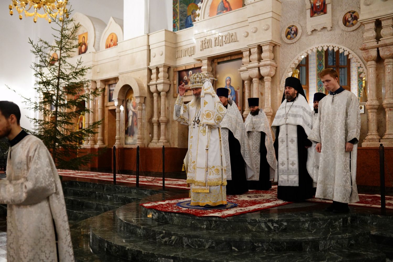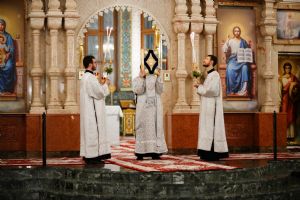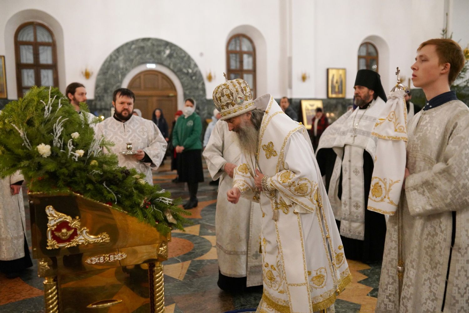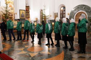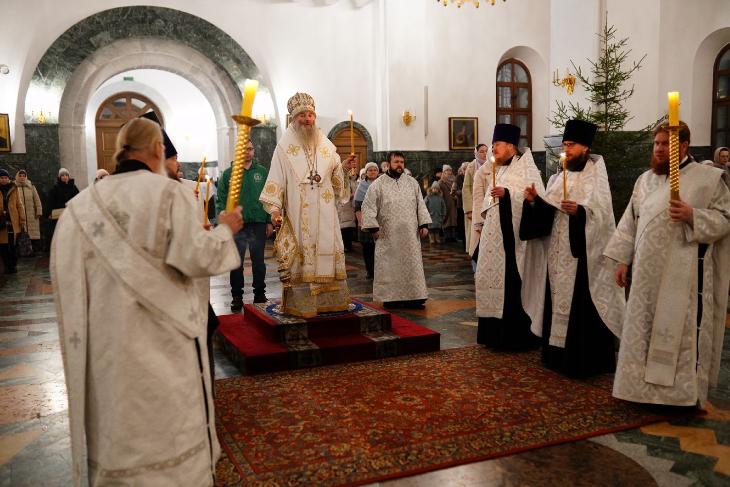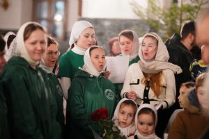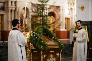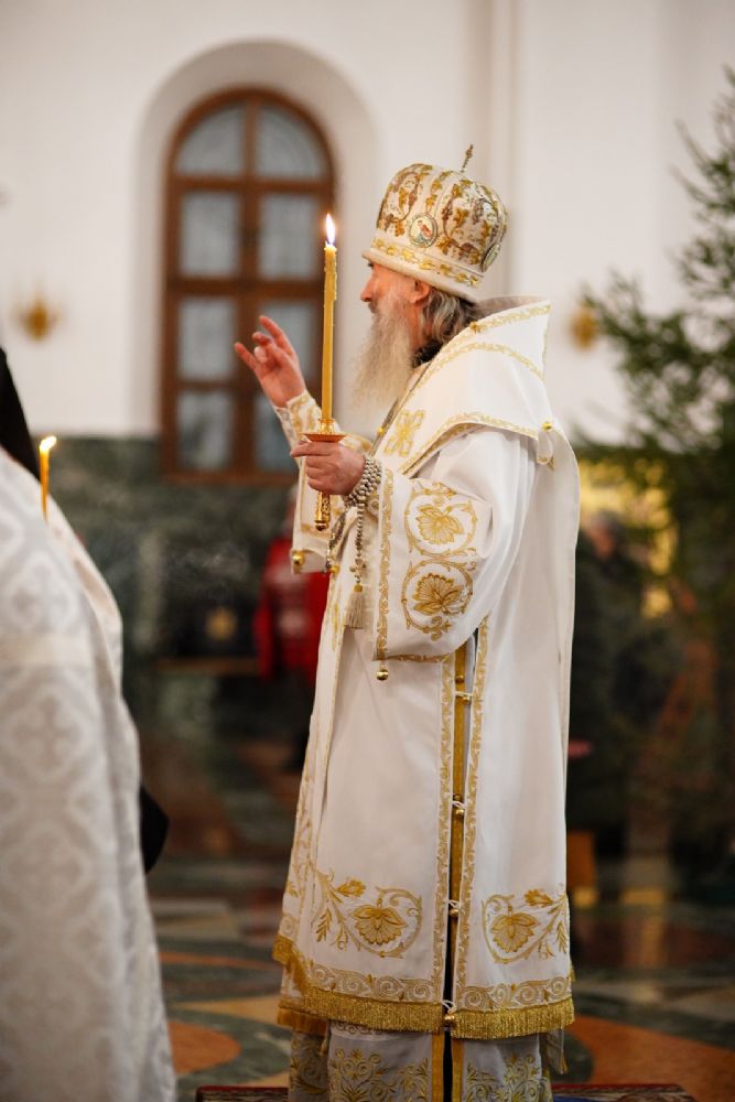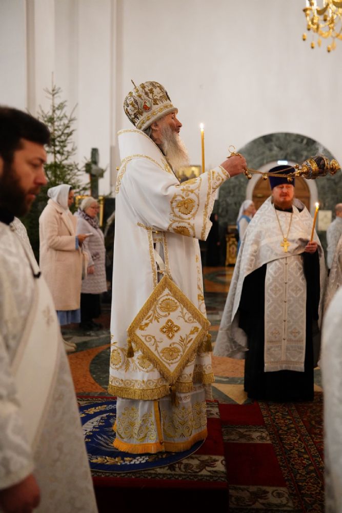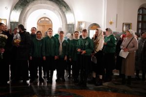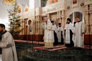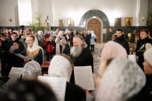Его Высокопреосвященству сослужили секретарь Йошкар-Олинского епархиального управления иеромонах Серафим (Пасанаев), ключарь собора протоиерей Сергий Поглазов, клирики собора и протодиакон Михаил Козловский. Пел детско-юношеский хор «Благовест» под управлением регента Татьяны Черновой.