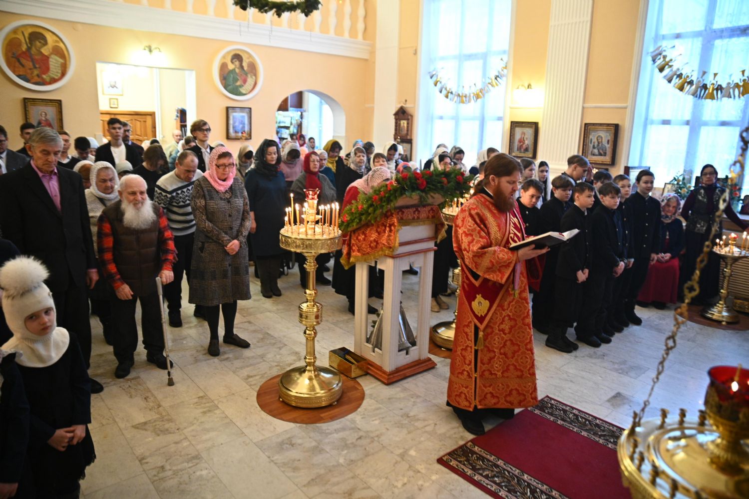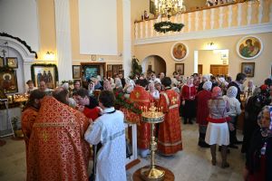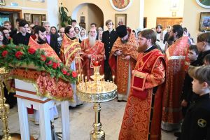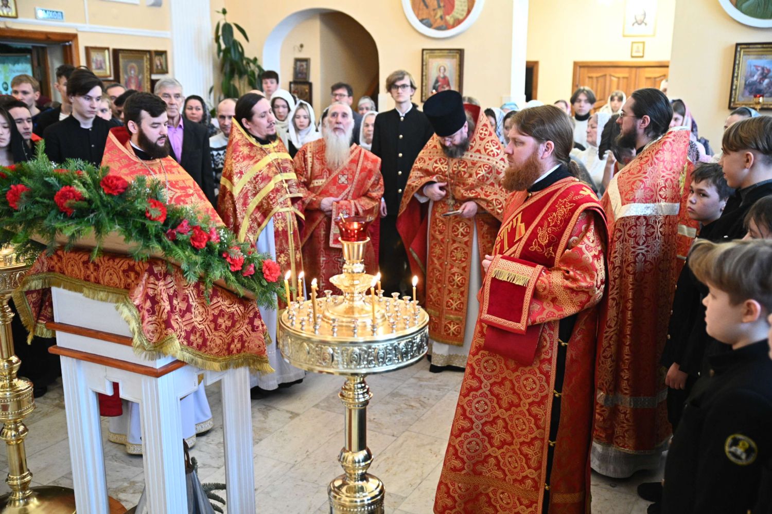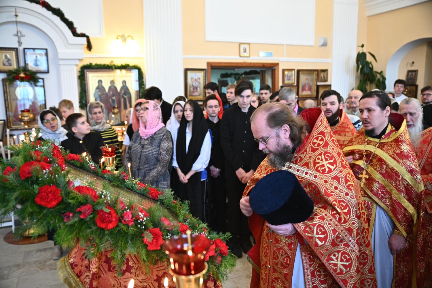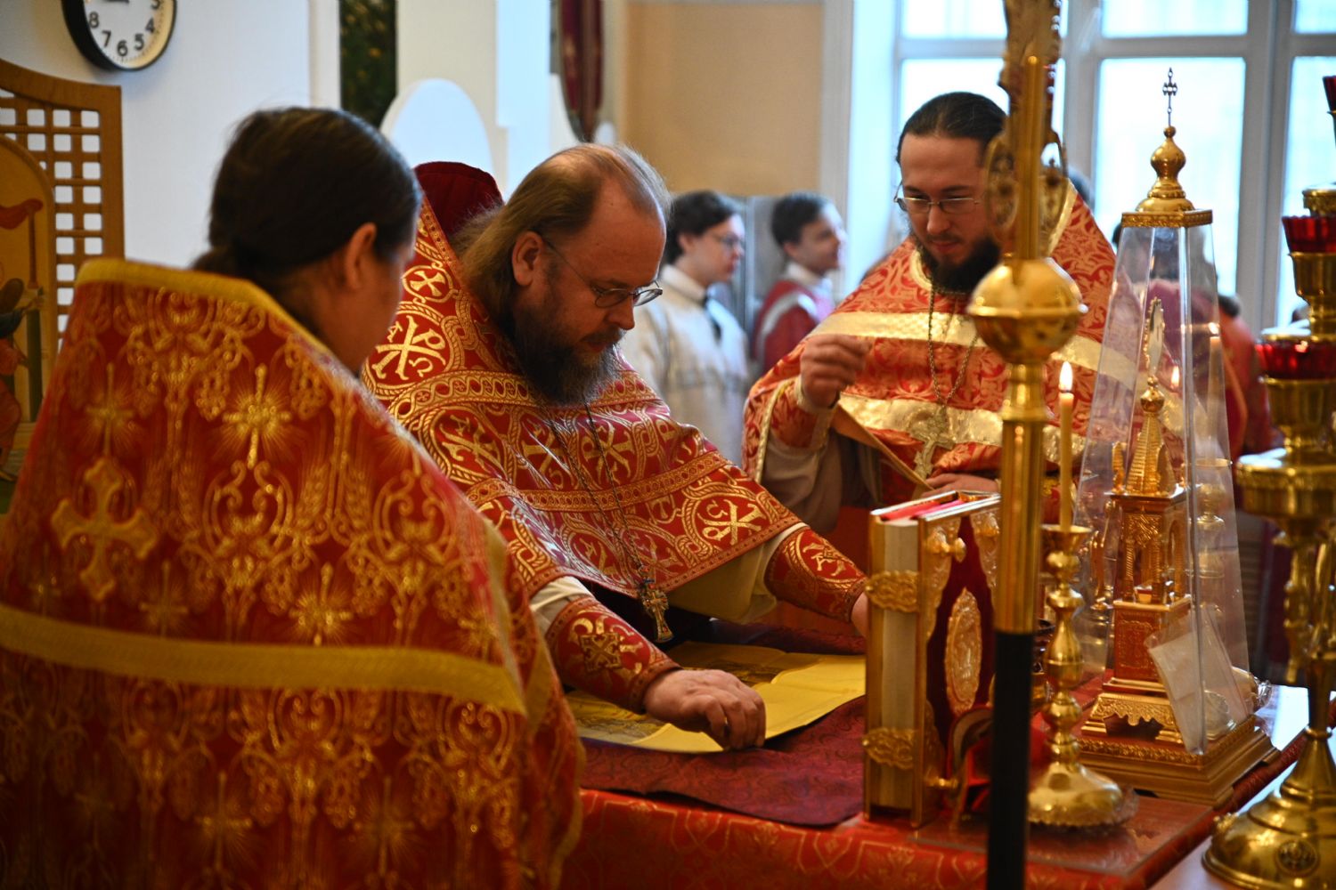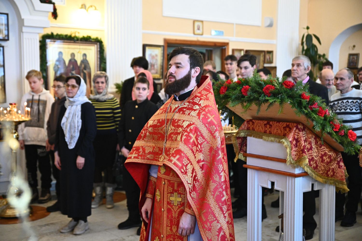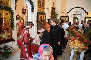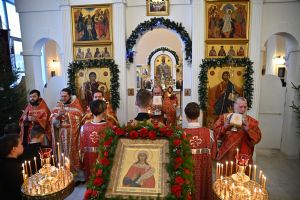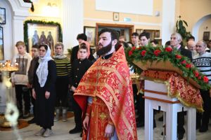 Накануне вечером праздничное всенощное бдение возглавил настоятель храма протоиерей Евгений Сурков в сослужении клирика храма иерея Андрея Иванова. Разделить радость праздника пришел также архиерейский протодиакон Михаил Козловский. Песнопения исполняли хор храма под управлением Аллы Симаковой и детский хор гимназии им. Сергия Радонежского под руководством регента Марии Беляниной.