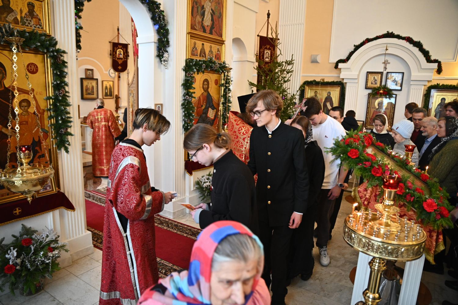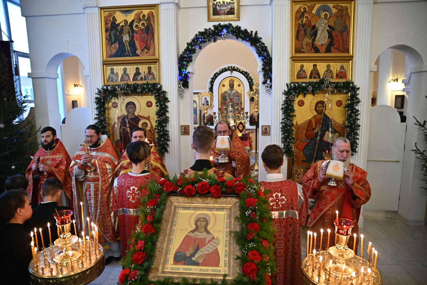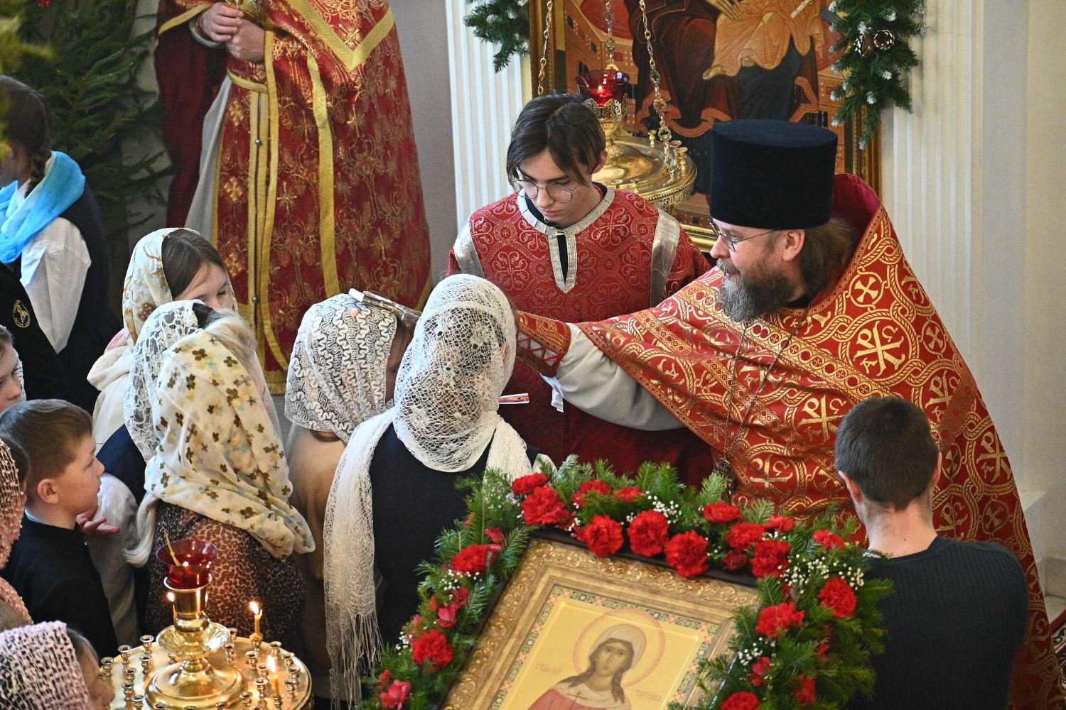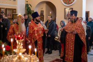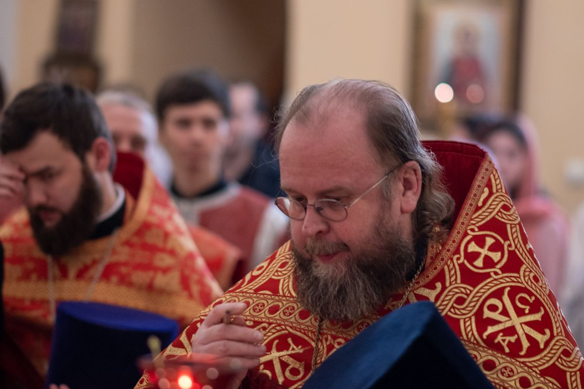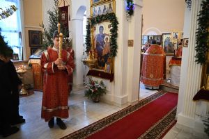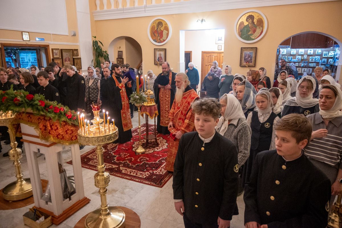 Накануне вечером праздничное всенощное бдение возглавил настоятель храма протоиерей Евгений Сурков в сослужении клирика храма иерея Андрея Иванова. Разделить радость праздника пришел также архиерейский протодиакон Михаил Козловский. Песнопения исполняли хор храма под управлением Аллы Симаковой и детский хор гимназии им. Сергия Радонежского под руководством регента Марии Беляниной.
