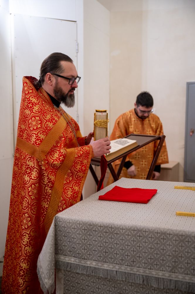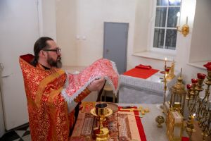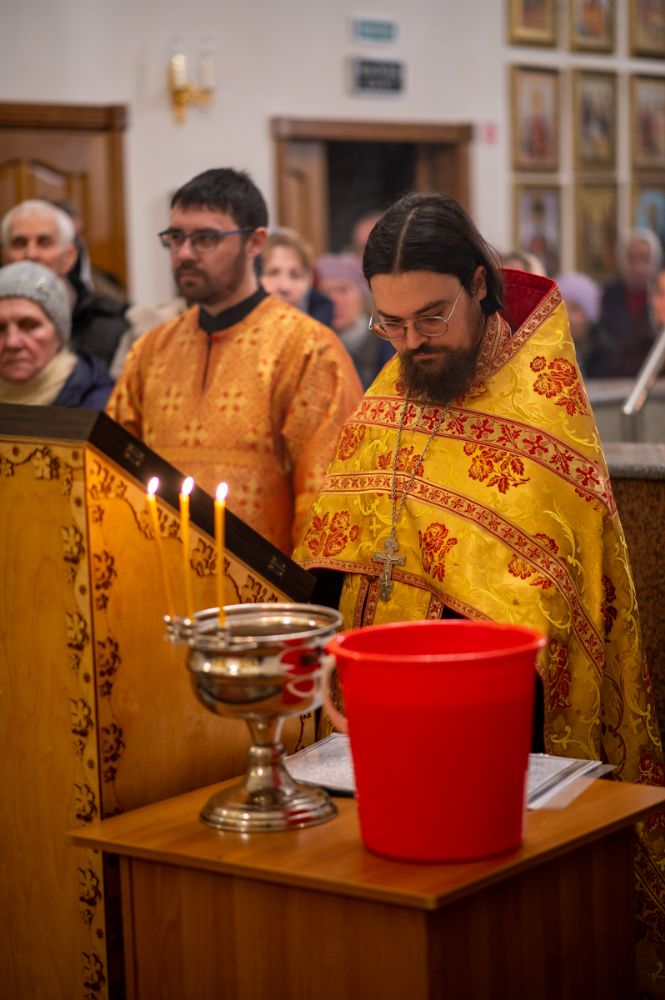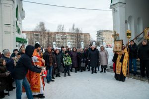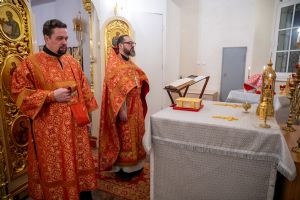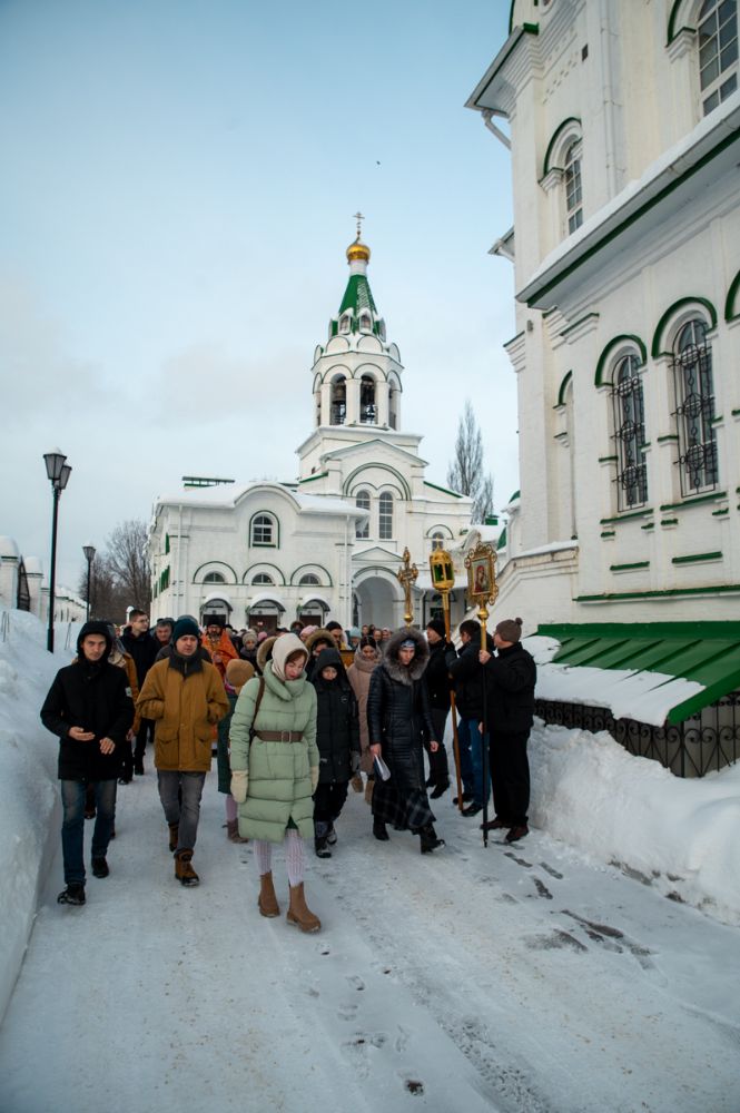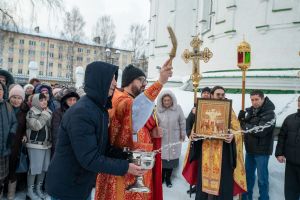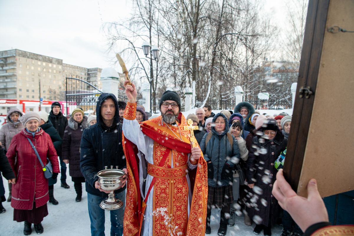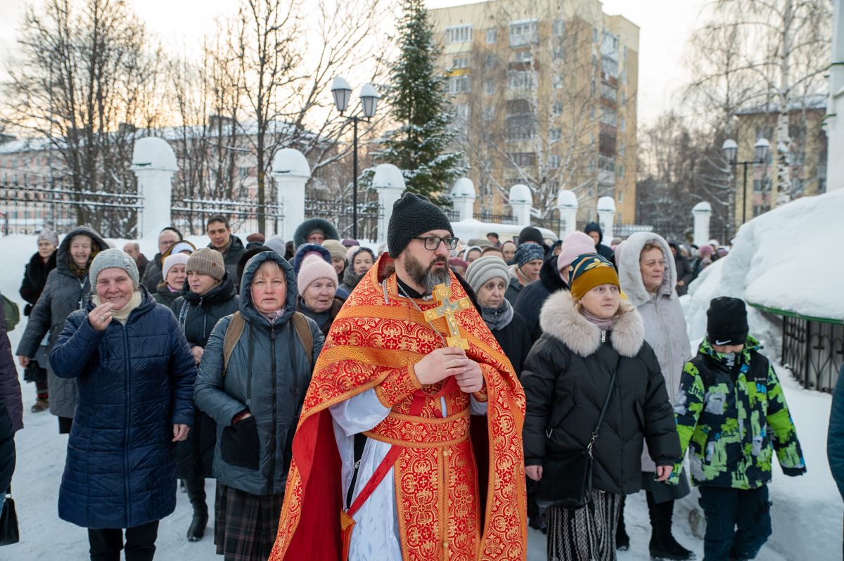 После Литургии клирик храма иерей Евгений Симаков отслужил водосвятный молебен, и далее священство и верующие прошли крестным ходом вокруг храма, после чего было совершено славление и вознесена молитва Новомученикам и исповедникам Российским.