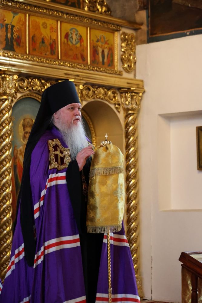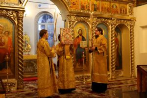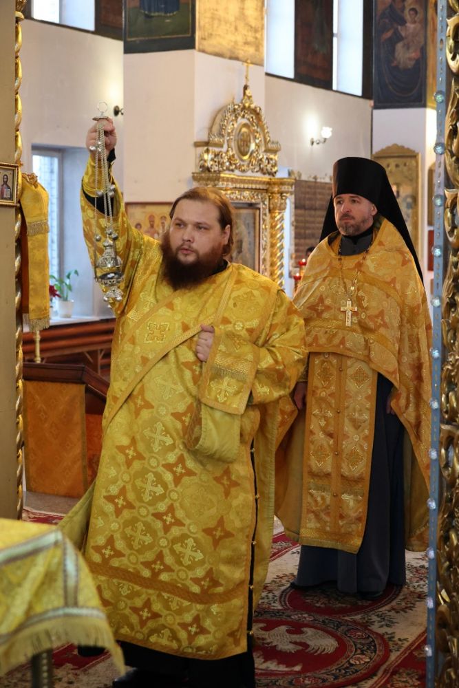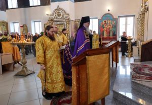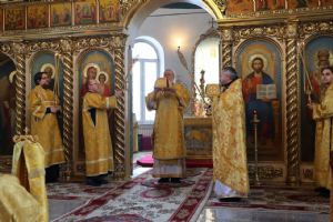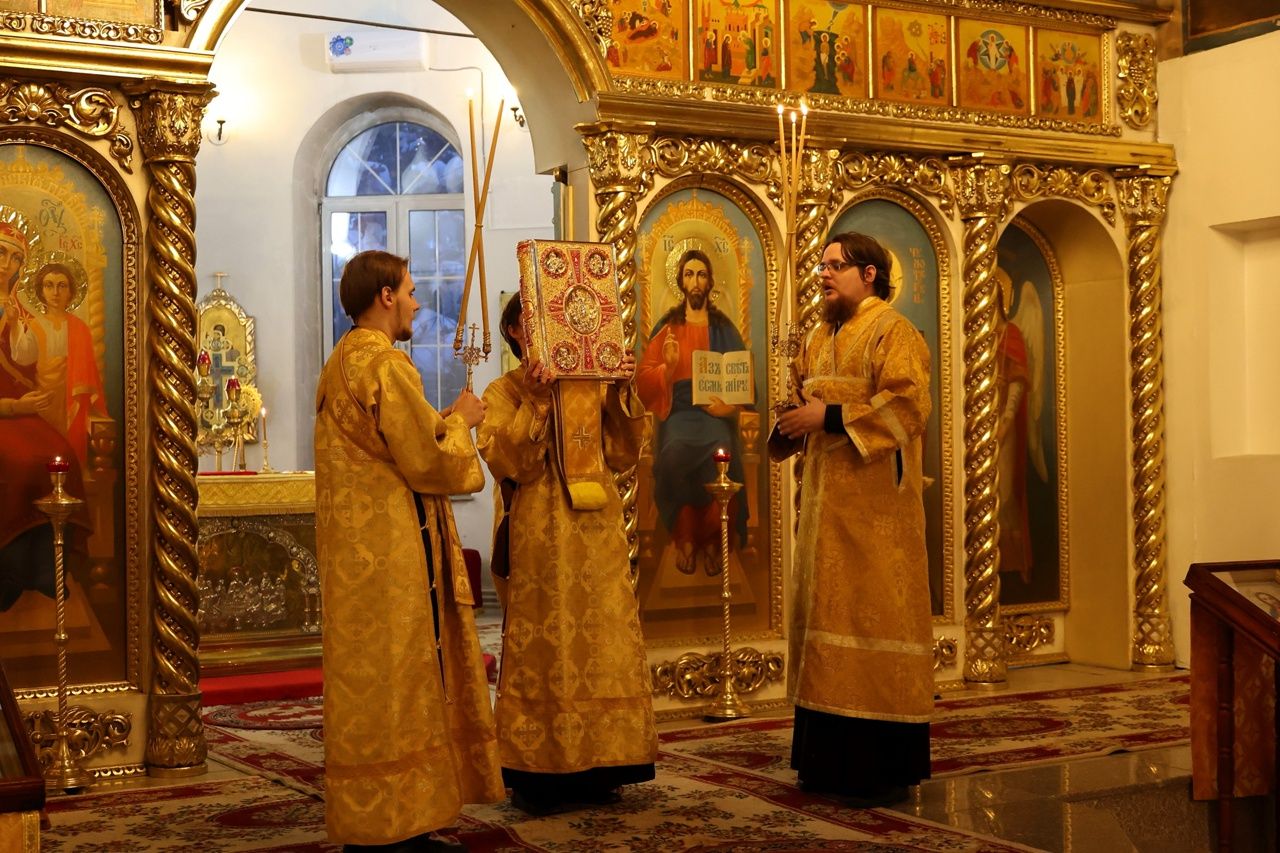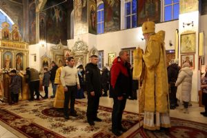 Его Преосвященству сослужили клирики собора. Песнопения исполняли архиерейский хор под управлением регента Любови Михеевой и народный хор под управлением Евгения Чигарова.