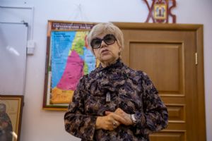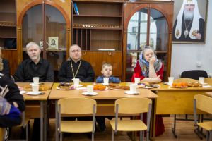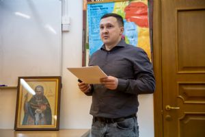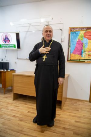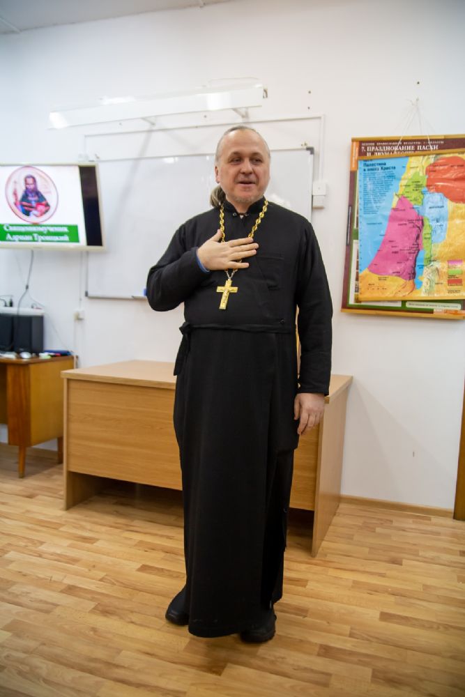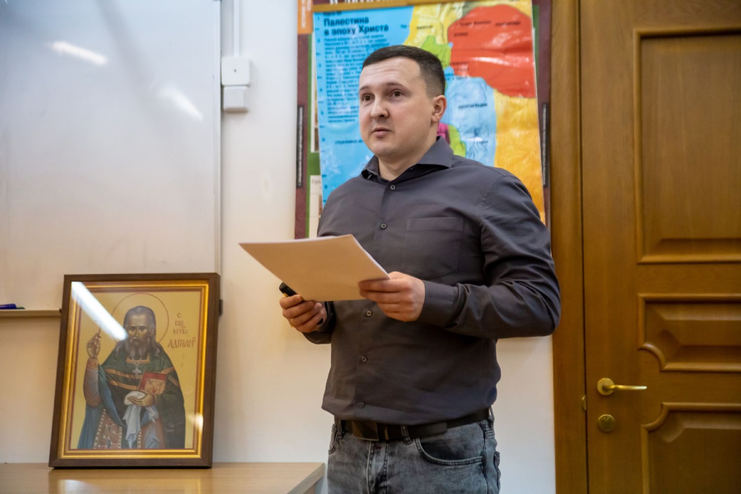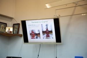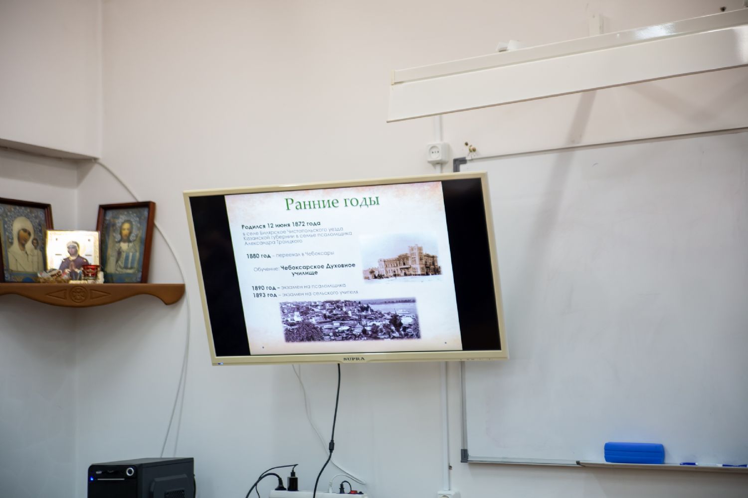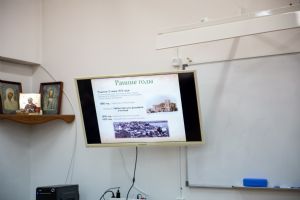 Далее курсанты прошли в учебный класс, где учащиеся второго курса подготовили замечательную презентацию о священномученике Адриане Троицком. Староста второкурсников Алексей Целищев рассказал о жизненном подвиге нашего святого земляка, его церковном служении, преподавательских трудах, верности Господу. А руководитель курсов отец Леонид сделал исторический обзор об эпохе безбожных гонений ХХ века, о репрессиях, которым подвергались люди за веру в Бога, об их мученических венцах.