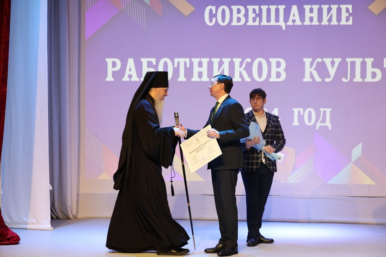 Министр культуры РМЭ Константин Иванов отметил наиболее отличившихся работников отрасли благодарностями и почетными грамотами. Епископу Волжскому и Сернурскому Феофану глава ведомства вручил Почетную грамоту министерства культуры РМЭ за вклад в развитие межнациональных и межконфессиональных отношений.