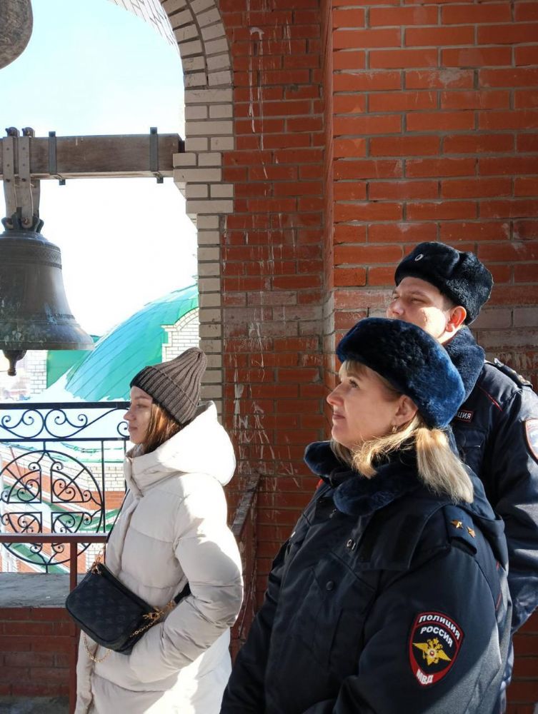 Цель таких мероприятий – улучшить морально-нравственное состояние полицейских на службе и в быту. Отец Андрей провел для гостей экскурсию по храму, поведал его историю, рассказал об устройстве алтаря, иконостасе и святынях храма. Далее все вместе поднялись на колокольню, где батюшка рассказал о разновидностях и смысле колокольных звонов.