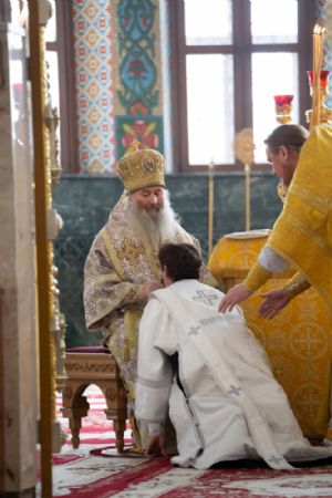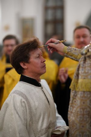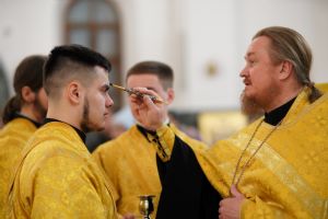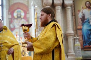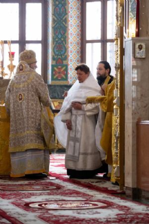 За Литургией митрополит Иоанн совершил иерейскую хиротонию клирика храма иконы «Всех скорбящих Радость» г. Йошкар-Олы диакона Олега Михайлова. Сорокоуст новорукоположенный иерей Олег будет проходить в Благовещенском соборе.