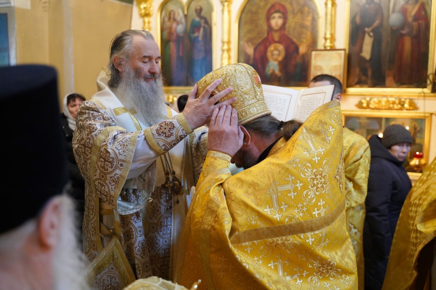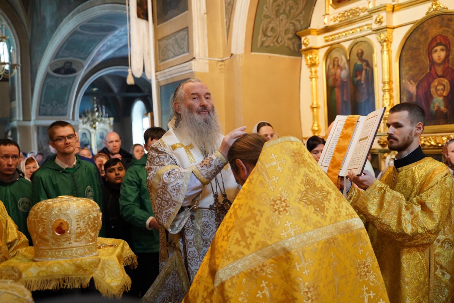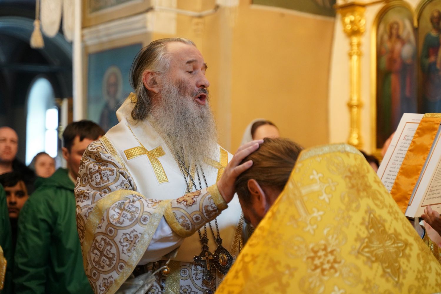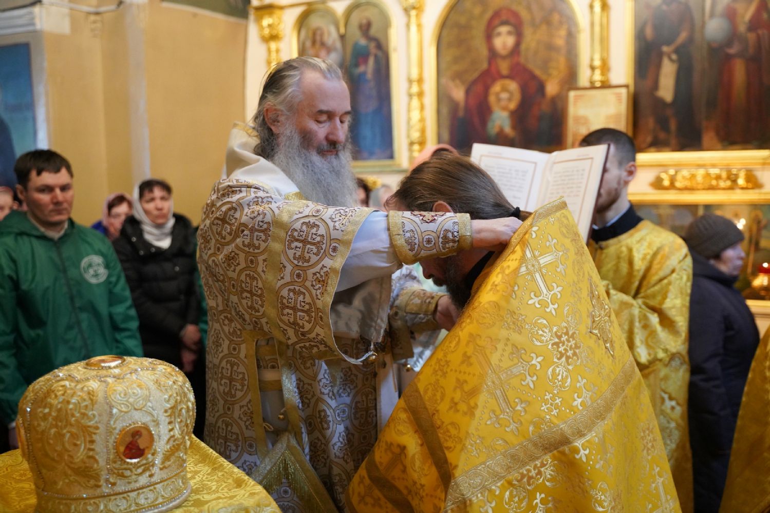 За богослужением митрополит Иоанн по благословению Святейшего Патриарха Московского и всея Руси Кирилла возвел в сан архимандрита иеромонаха Серафима (Пасанаева), избранного Священным Синодом на заседании 12 марта 2024 г. (журнал №13) епископом Минусинским и Курагинским.