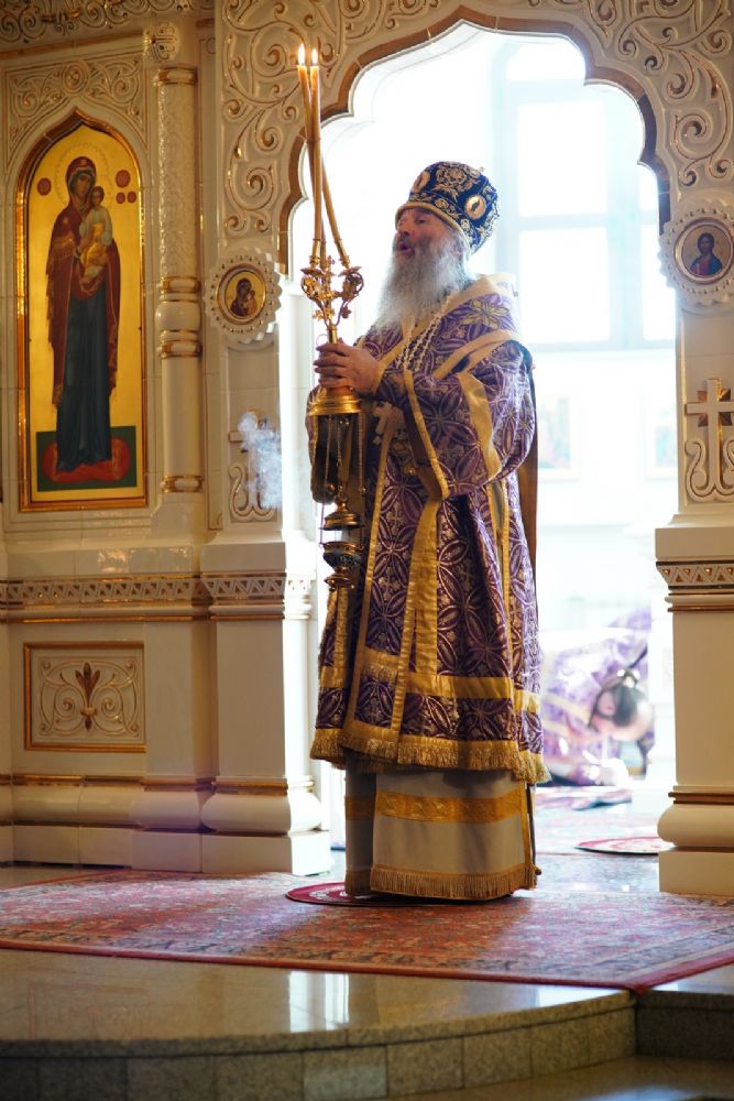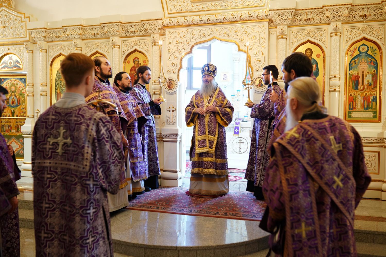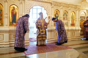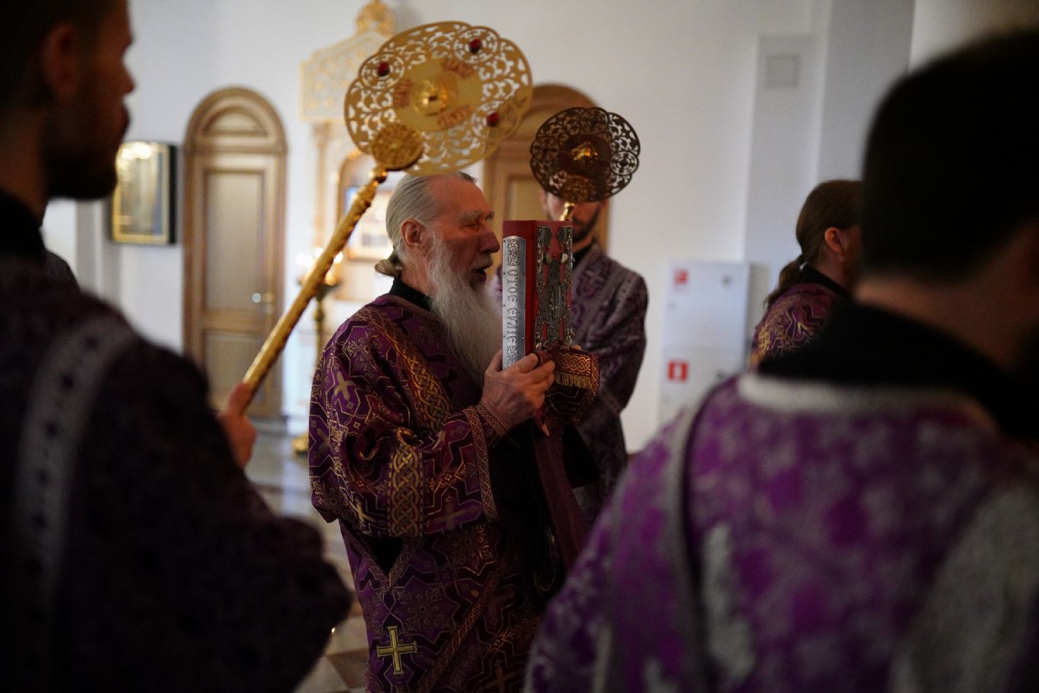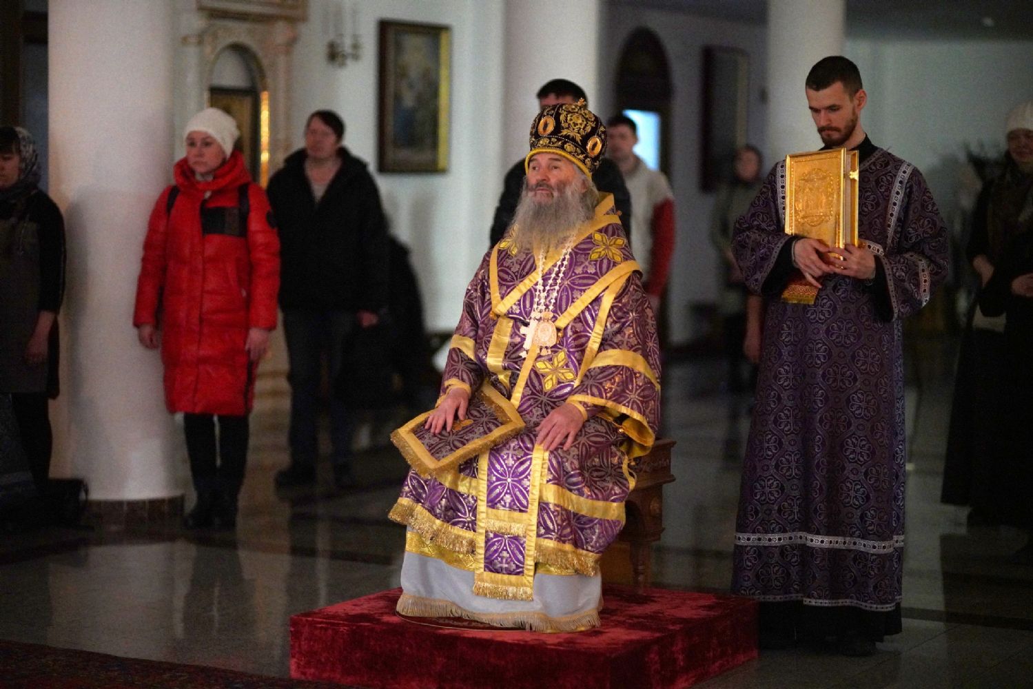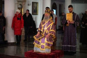 Архипастырю сослужили ключарь кафедрального собора протоиерей Сергий Поглазов, клирики собора и протодиакон Михаил Козловский. Песнопения исполнял малый состав хора «Благовест» под руководством регента Татьяны Черновой.