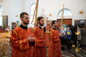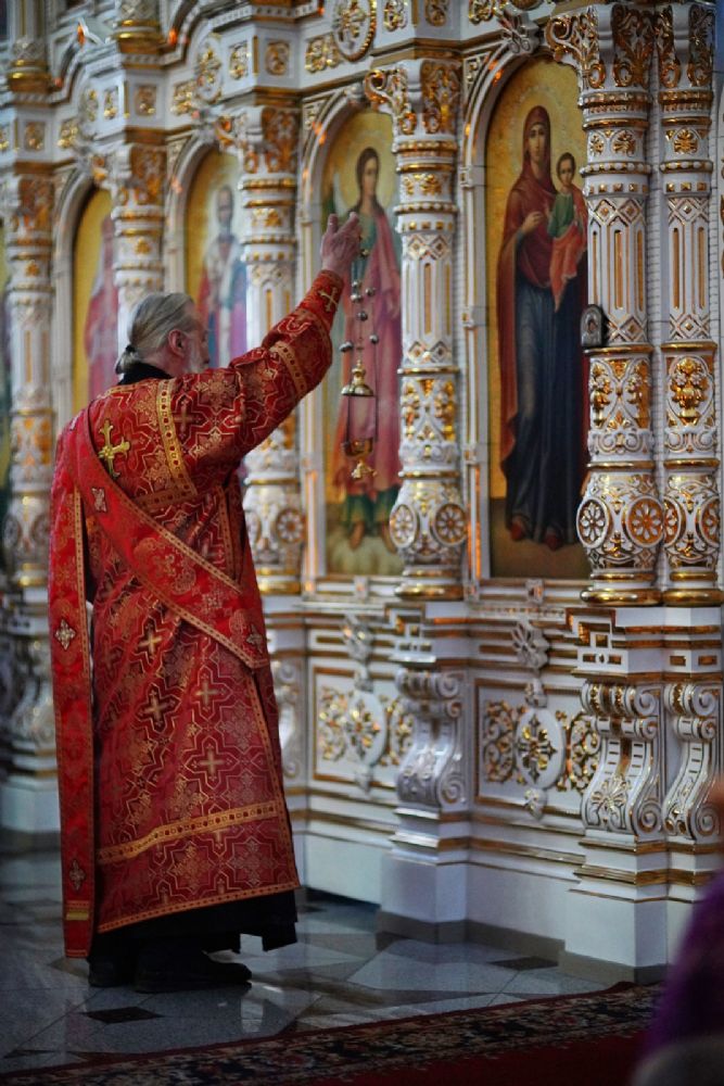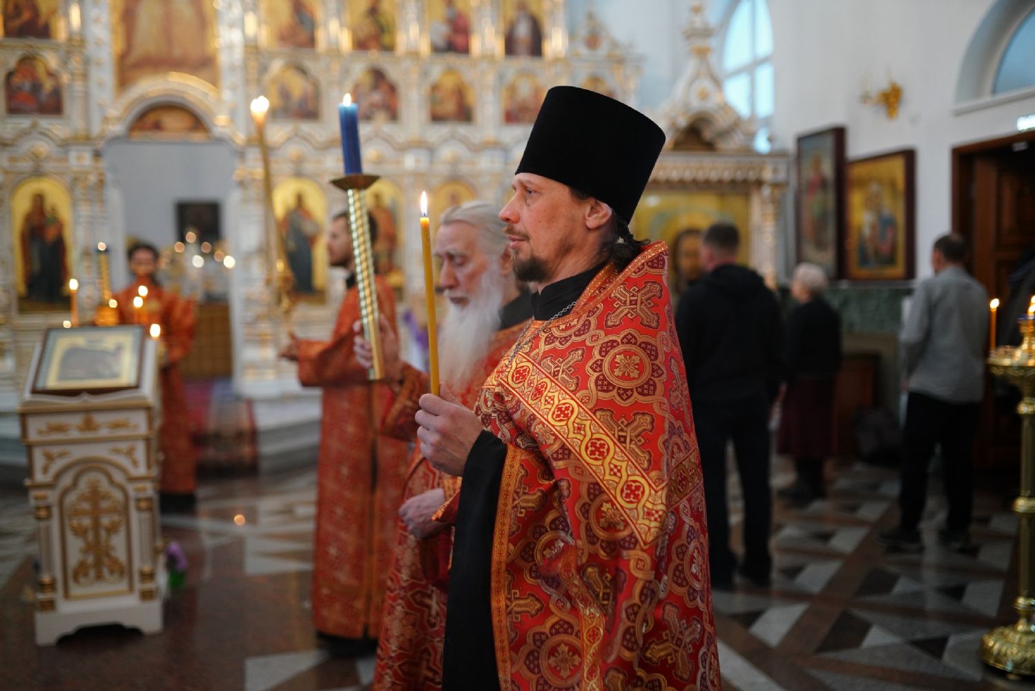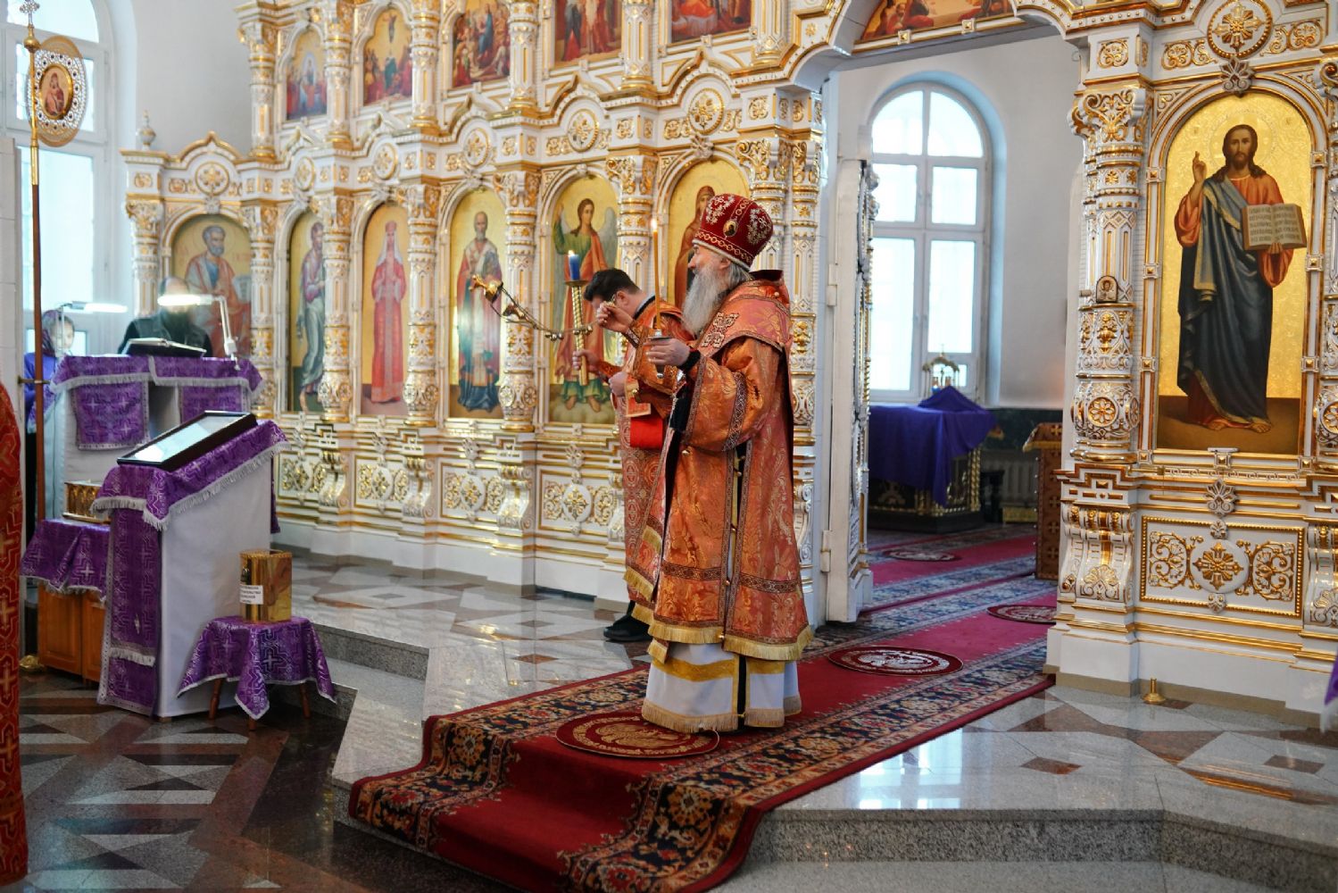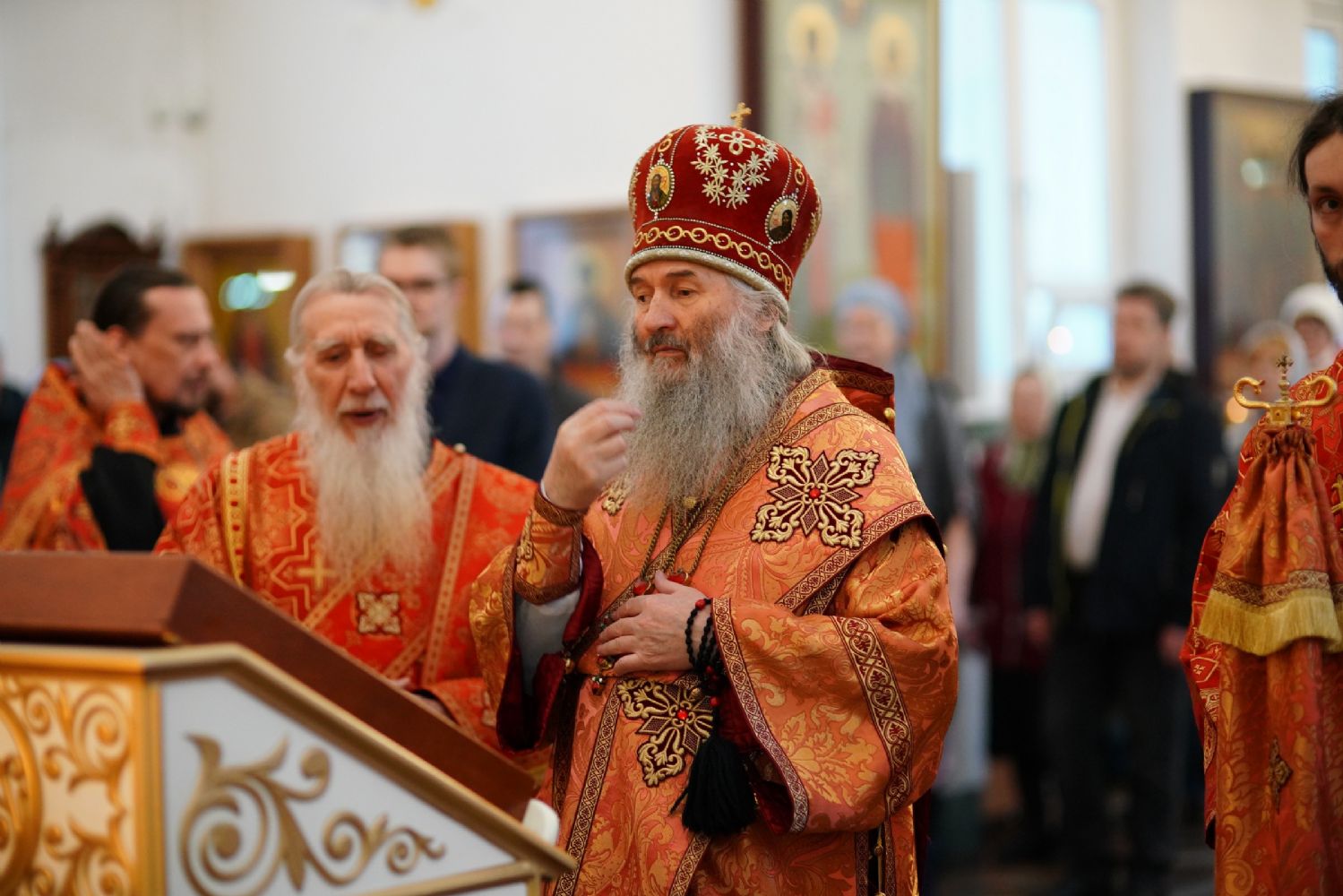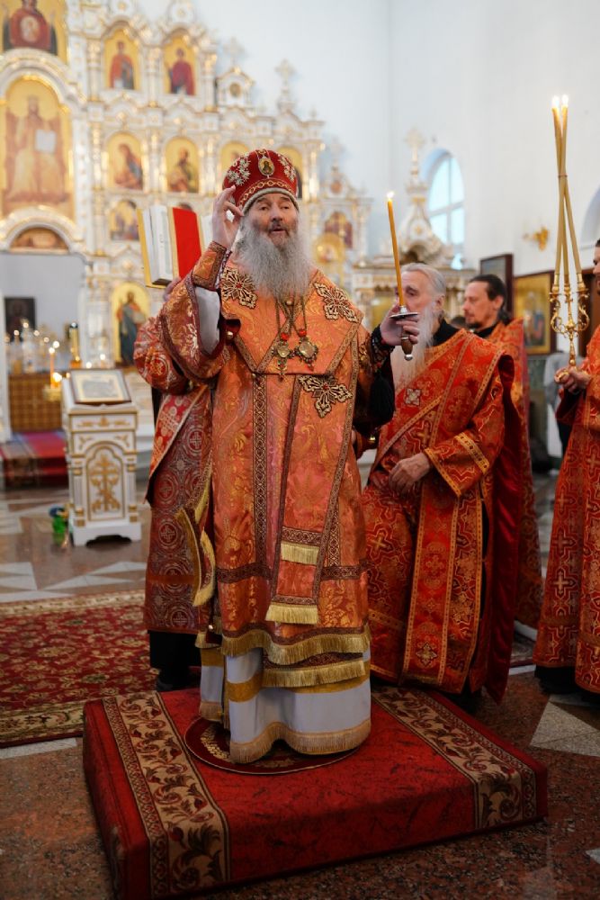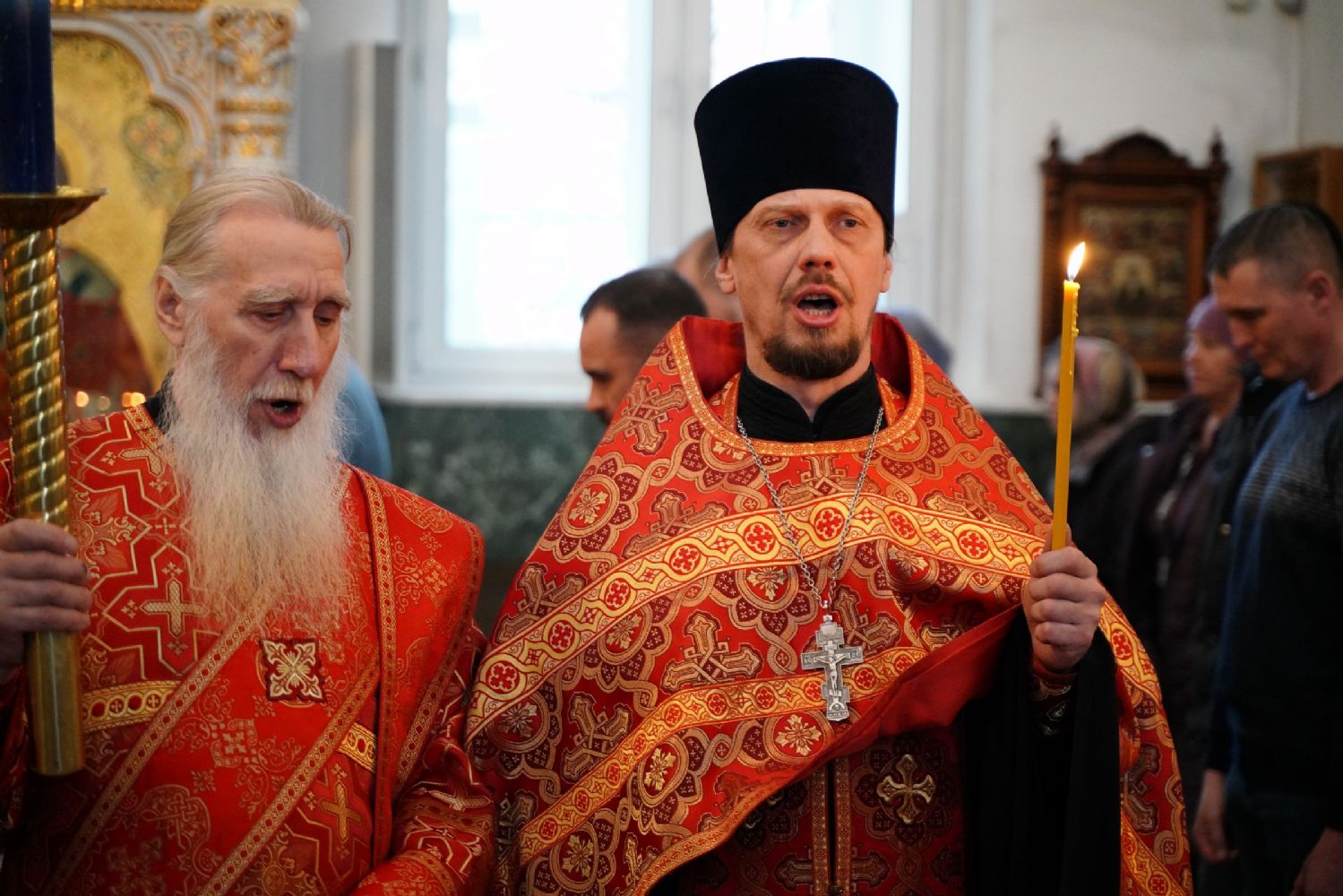 Владыке сослужили настоятель собора иерей Андрей Кочаков, клирики собора иерей Димитрий Лукьянов и диакон Алексий Кузнецов, а также протодиакон Михаил Козловский. Песнопения исполнял хор собора под управлением регента Елены Поглазовой.