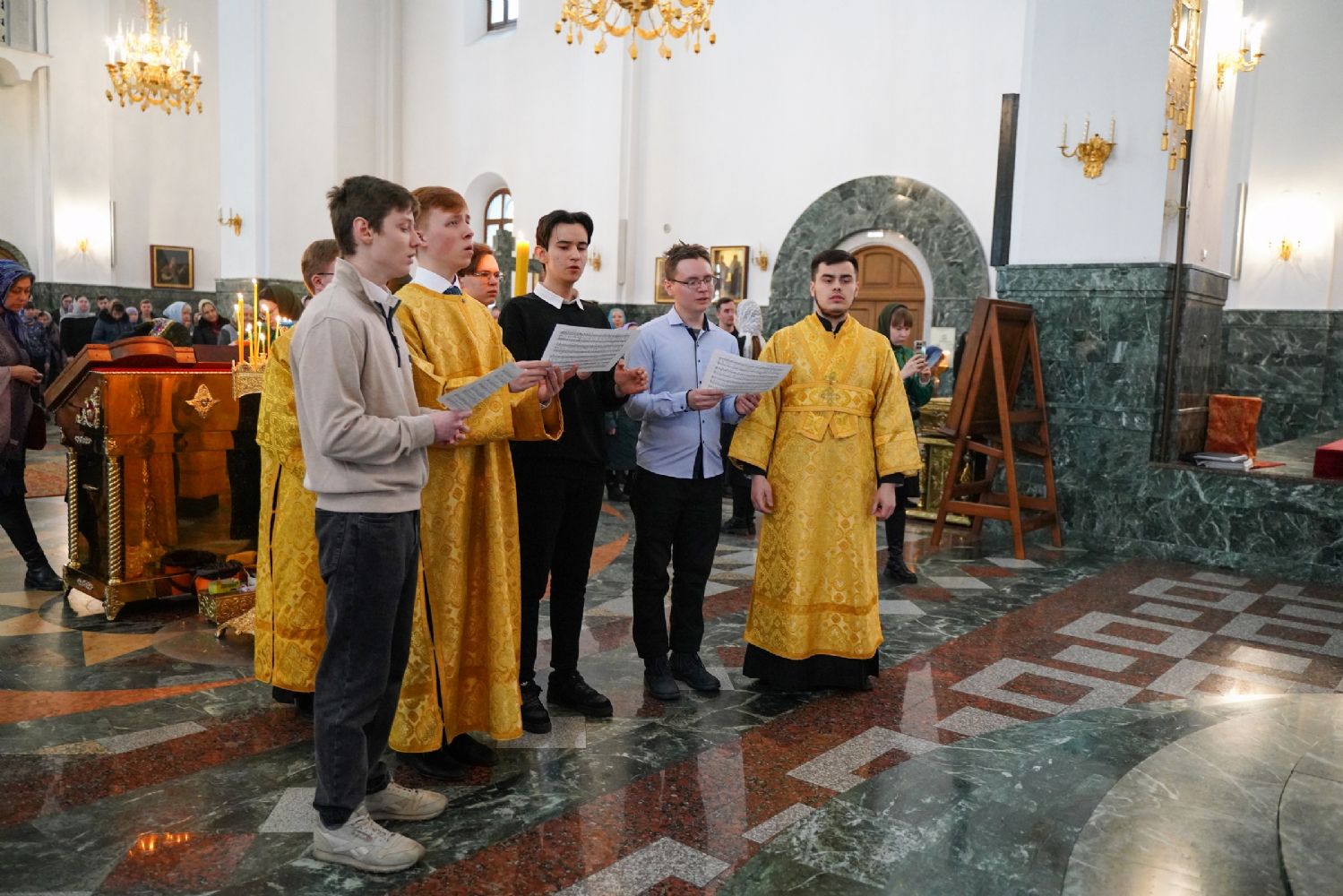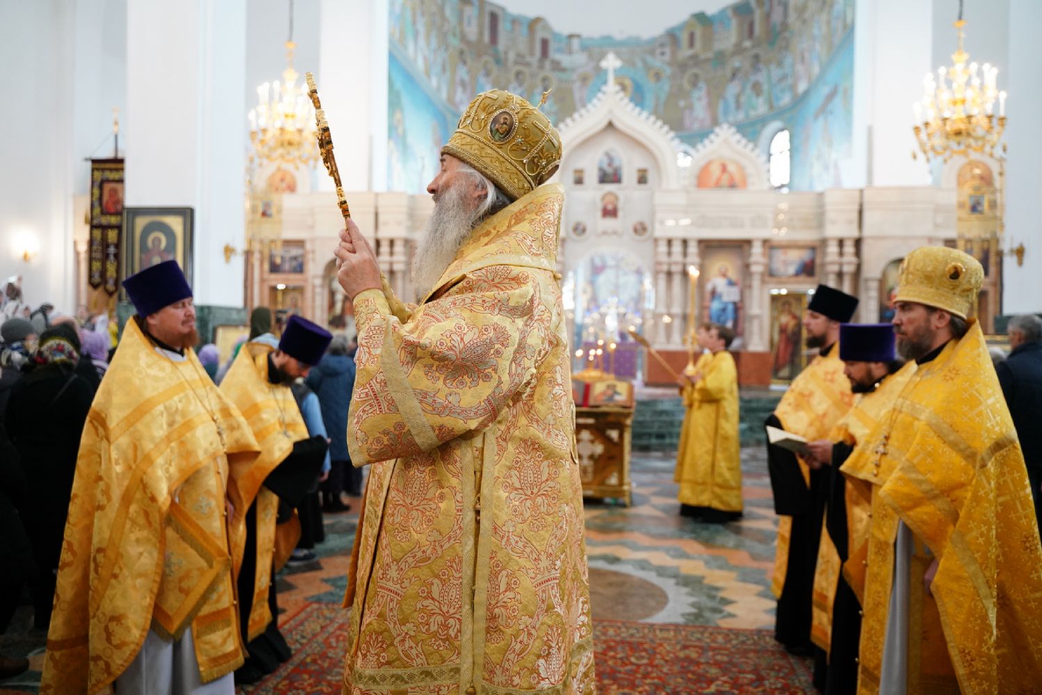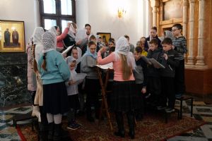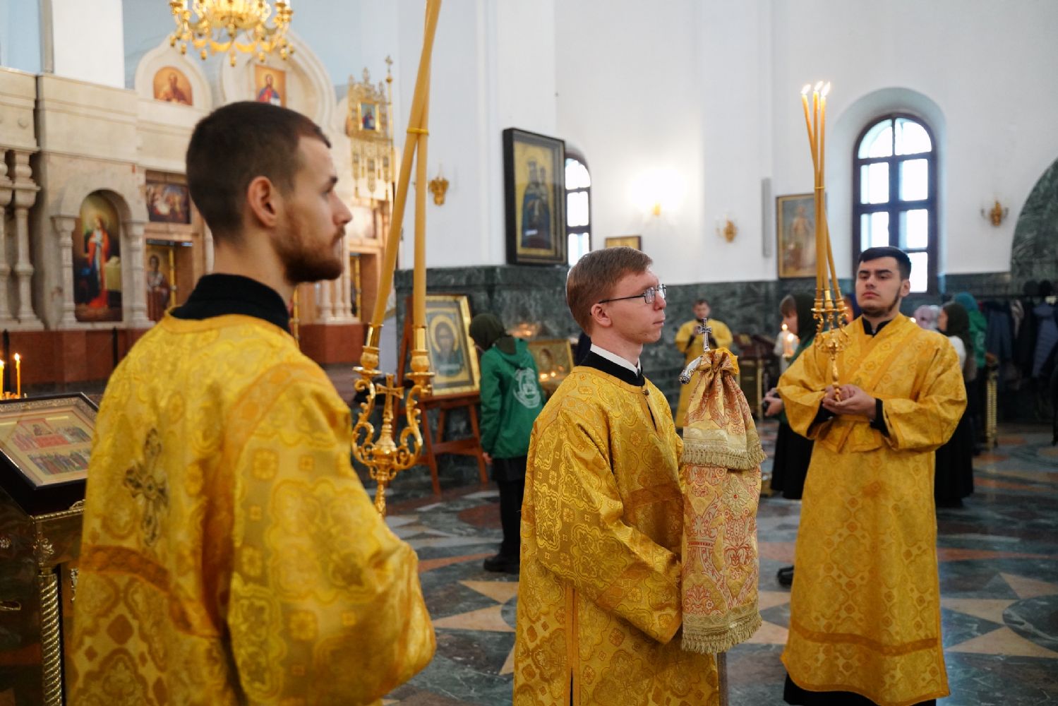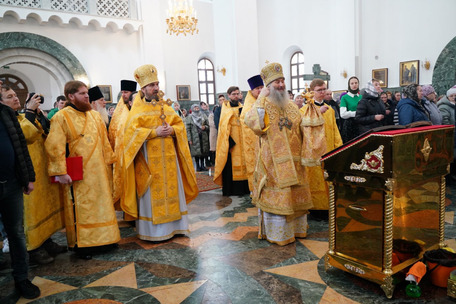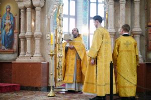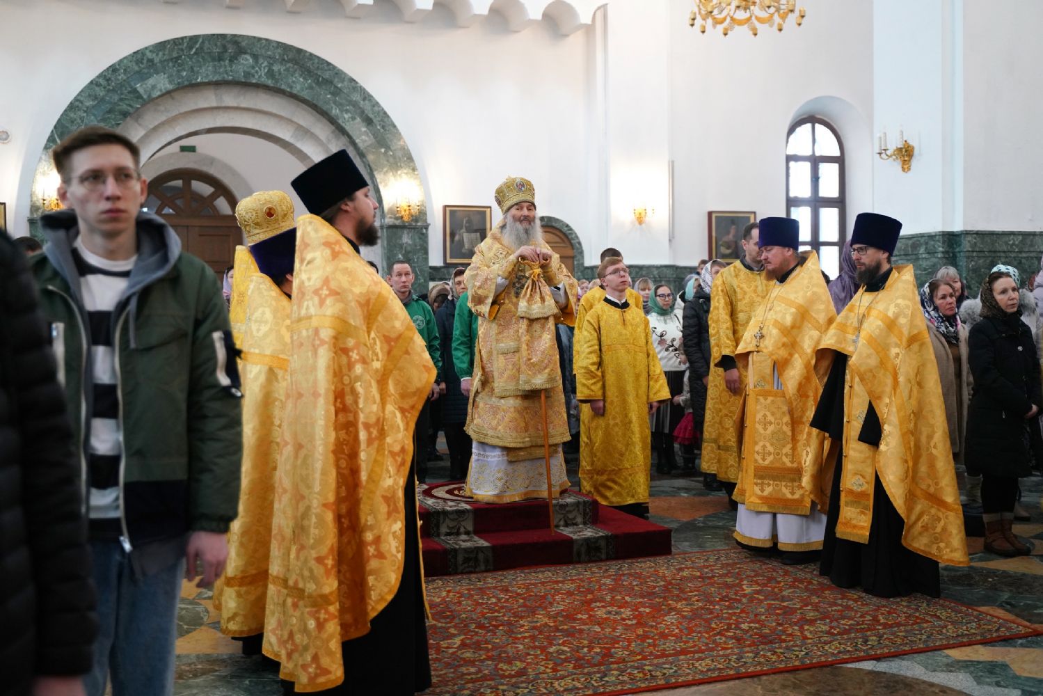 Его Высокопреосвященству сослужили секретарь Йошкар-Олинского епархиального управления архимандрит Серафим (Пасанаев), ключарь кафедрального собора протоиерей Сергий Поглазов, клирики собора и протодиакон Михаил Козловский. Песнопения исполняли старший и младший составы детско-юношеского хора «Благовест» под управлением регентов Татьяны Черновой и Надежды Поздеевой. Часть песнопений звучала на марийском языке.