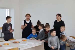 Встреча продолжилась в здании воскресной школы, где для ребят был приготовлен праздничный стол со сладостями. Главным угощением стали испеченные из постного теста жаворонки. Птицы символизируют летящие к Богу души мучеников.