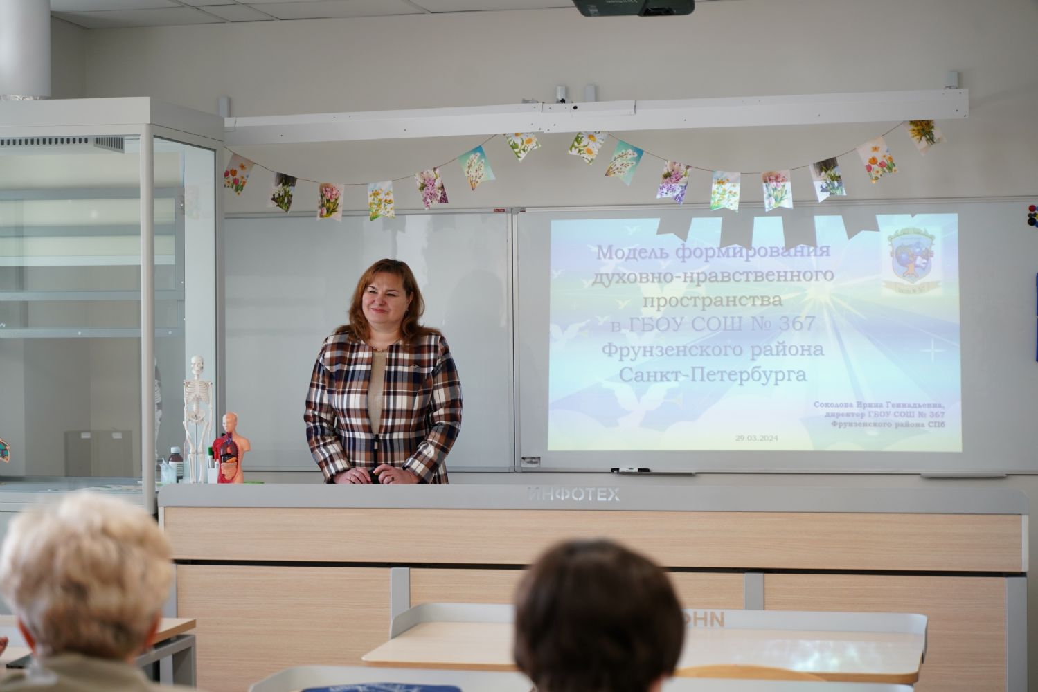 Соколова Ирина Геннадьевна, директор ГБОУ СОШ № 367 Фрунзенского района Санкт-Петербурга, представила структуру работы в пространстве школы на уроках и во внеурочное время, поделилась опытом формирования духовно-нравственной личности обучающихся в процессе реализации Программы воспитания школы.