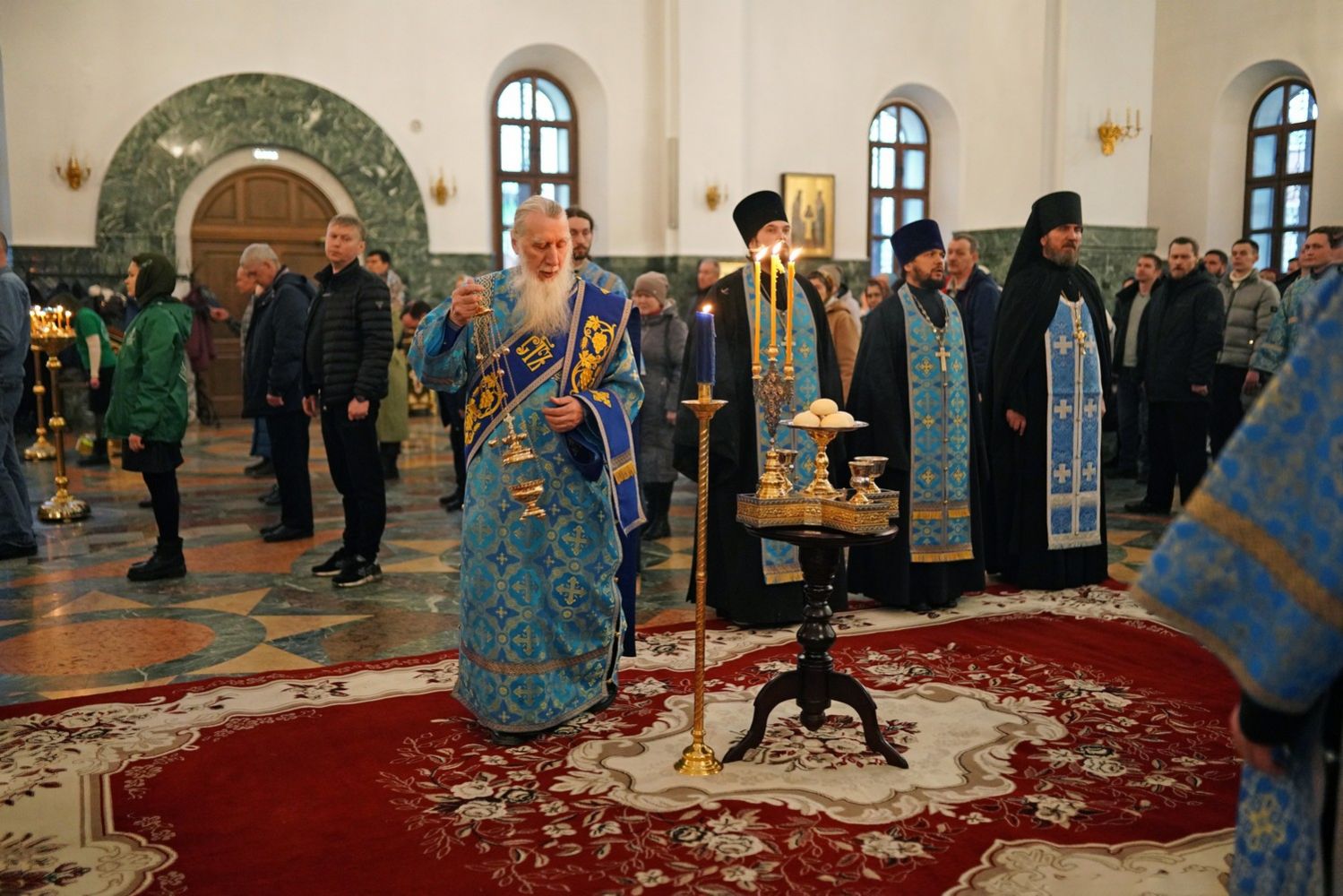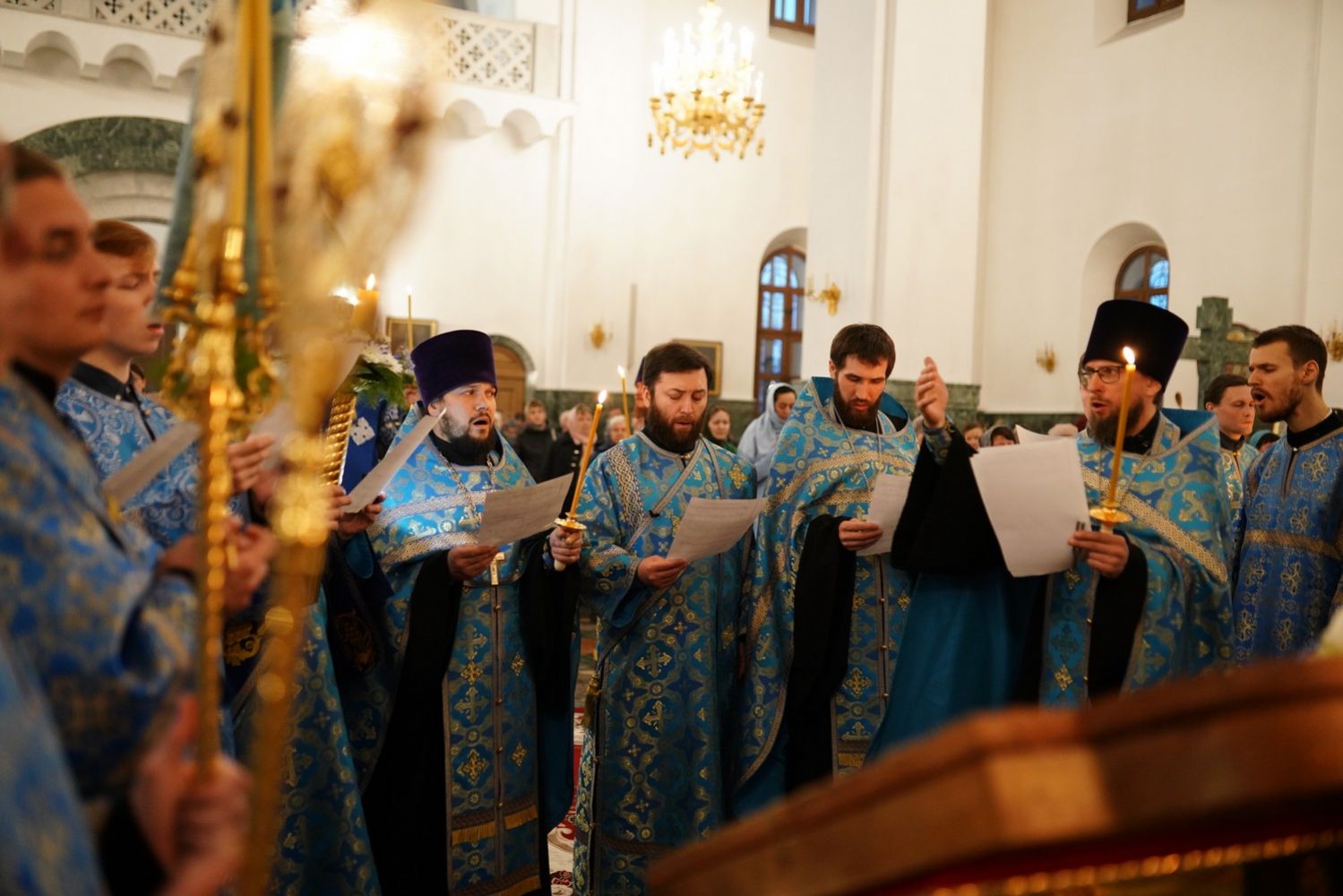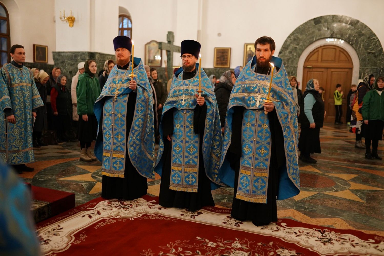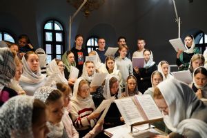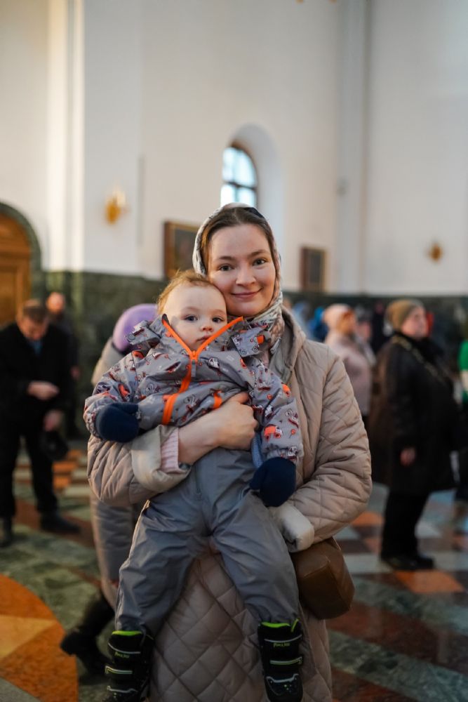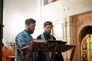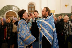 Архипастырю сослужили секретарь Йошкар-Олинского епархиального управления архимандрит Серафим (Пасанаев), ключарь собора протоиерей Сергий Поглазов, клирики собора и протодиакон Михаил Козловский. Пели старший и младший составы детско-юношеского хора «Благовест» под руководством регентов Татьяны Черновой и Софии Андреевой. Часть песнопений звучала в исполнении хора церковно- и священнослужителей Йошкар-Олинской епархии под управлением иерея Евгения Самойлова.